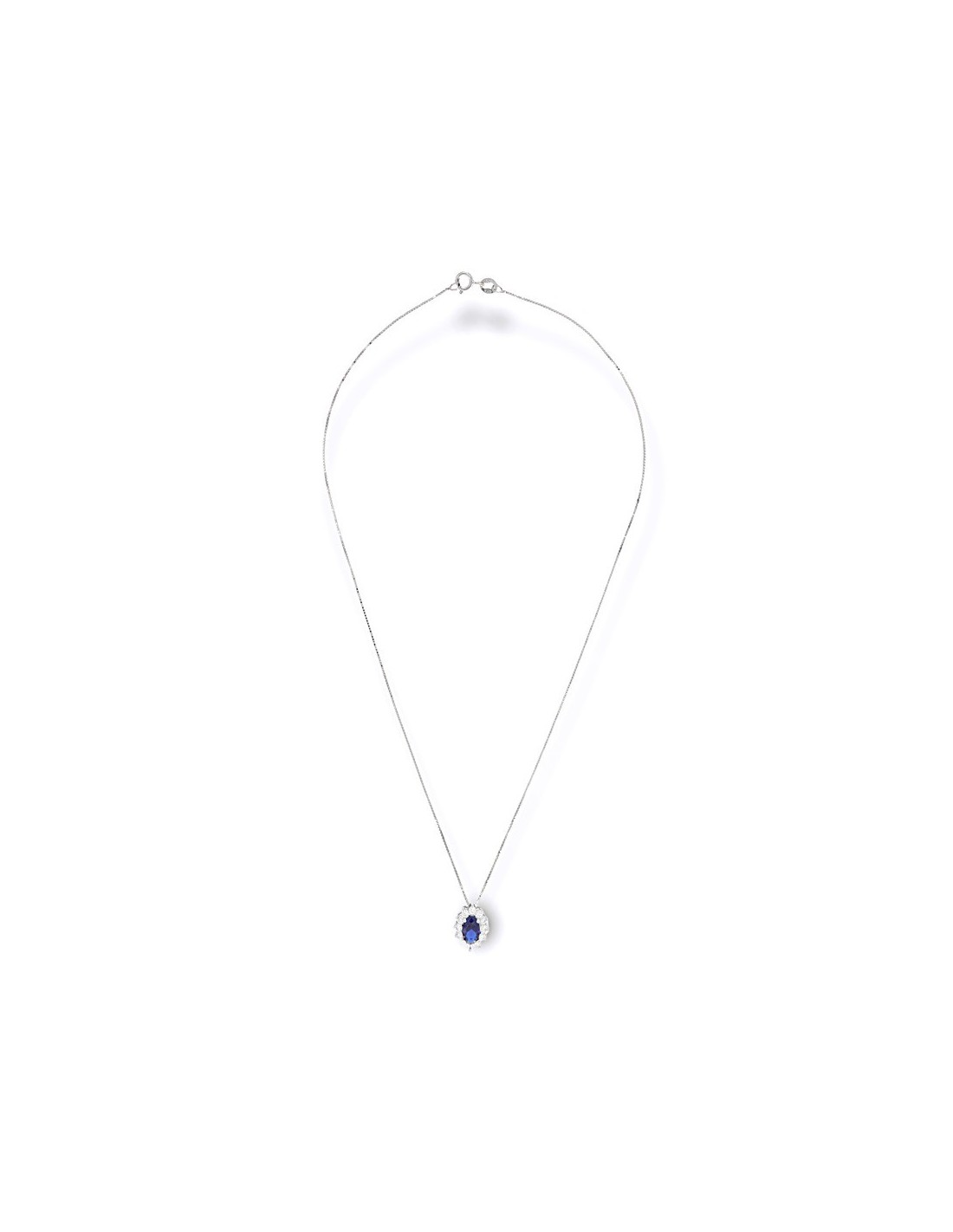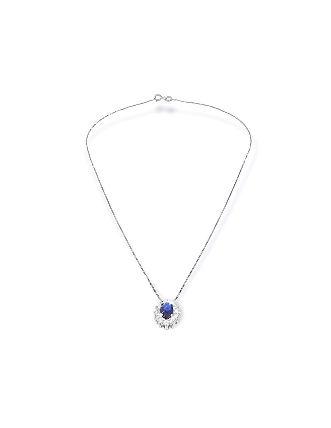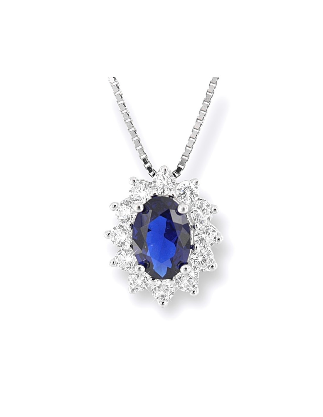 •MATERIALE: la collana è realizzata interamente in argento 925‰ Rodiato (trattamento brillantante contro l'annerimento) modello Principessa con l'applicazione di uno Zirconia Cubica colore blu taglio ovale misura 7x5 millimetri con un cotorno di Zirconia Cubica o CZ bianchi da 2 millimetri di diametro con taglio di alta qualità simile al taglio Brillante del Diamante;