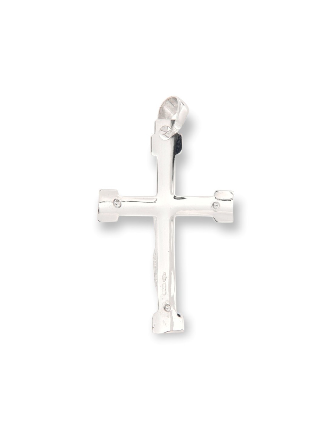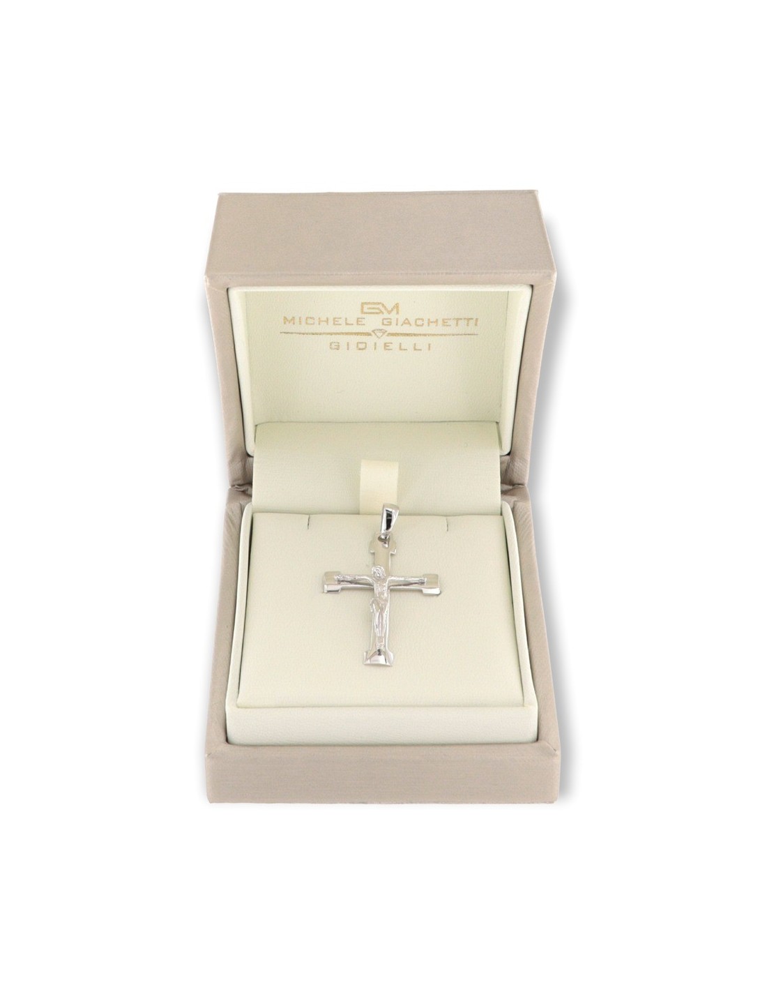 •MATERIALE: il ciondolo è realizzato interamente in oro bianco 750‰ (18 Carati) a forma di croce rappresentante Gesù Cristo in rilievo;
