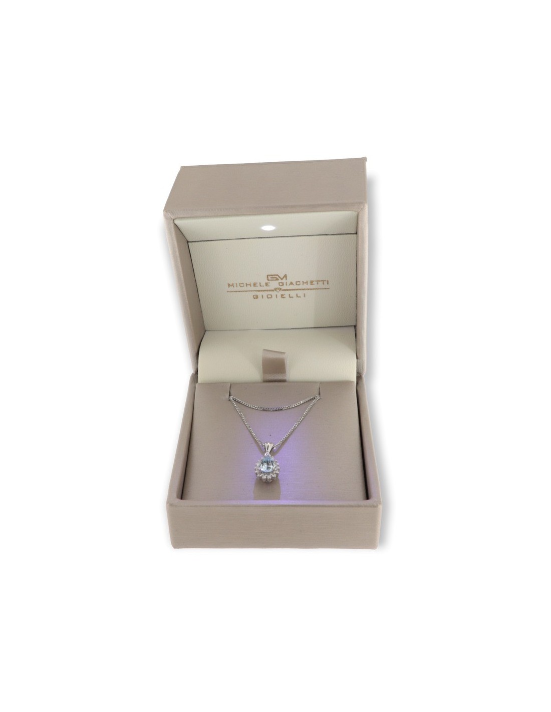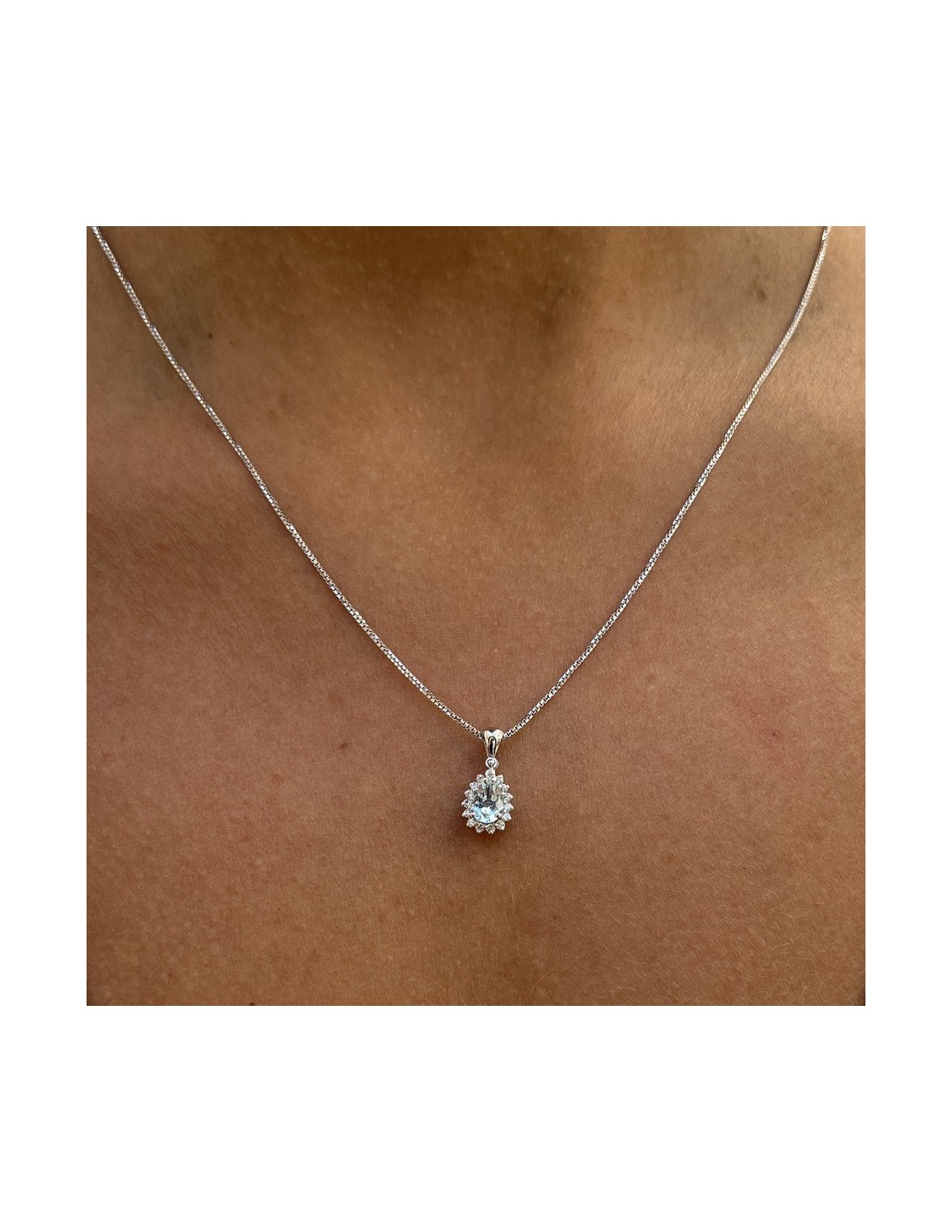 •MATERIALE: la collana con il ciondolo sono realizzati interamente in oro bianco 750‰ (18 Carati) modello principessa con l'applicazione di Acquamarina a goccia misura 6x4 millimetri dal peso di 0,49 Carati, circondato da una cornice di 15 Diamanti dal peso di 0,14 Catati, colore F e purezza VS1 rendendo la collana luminosa e scintillante;
