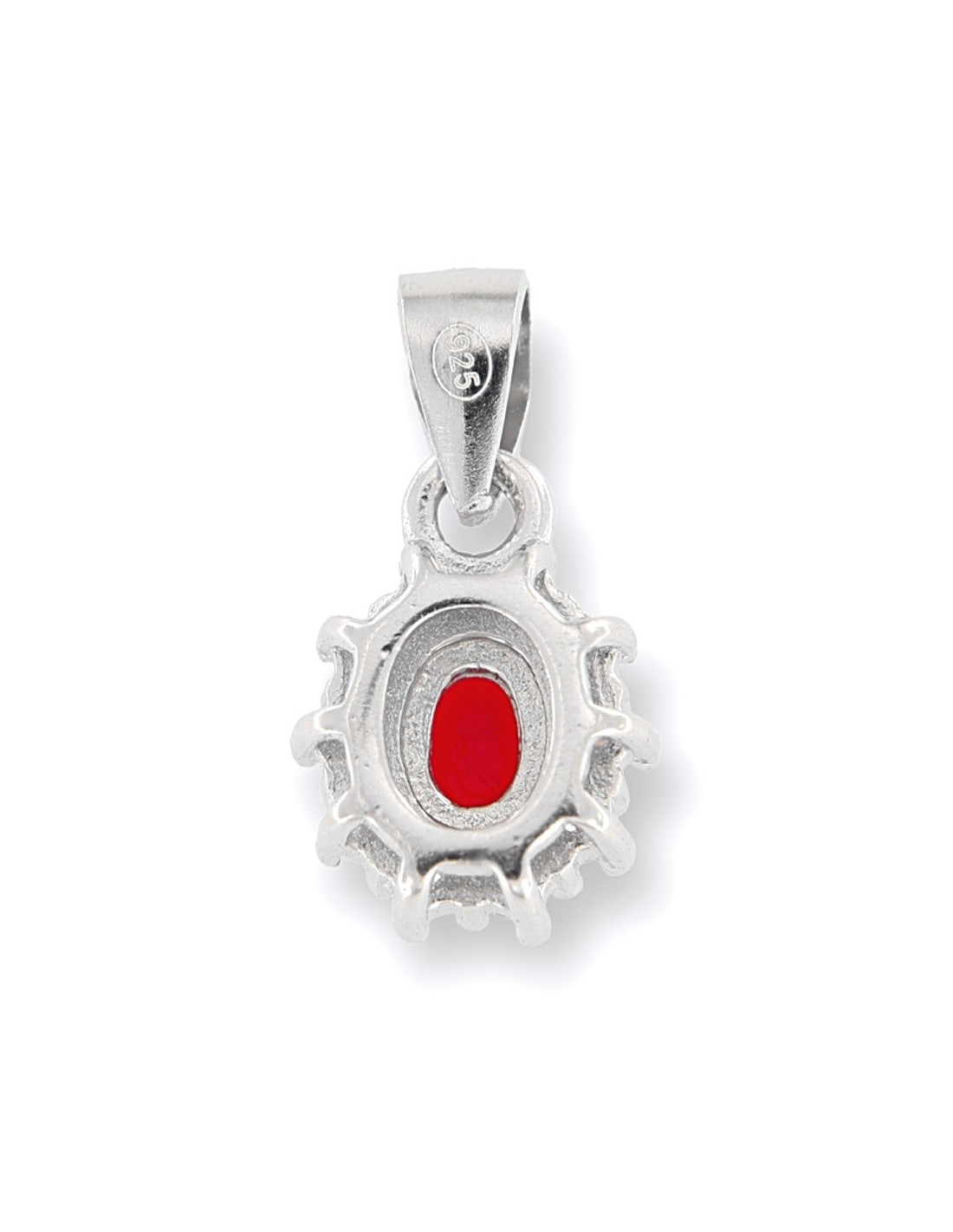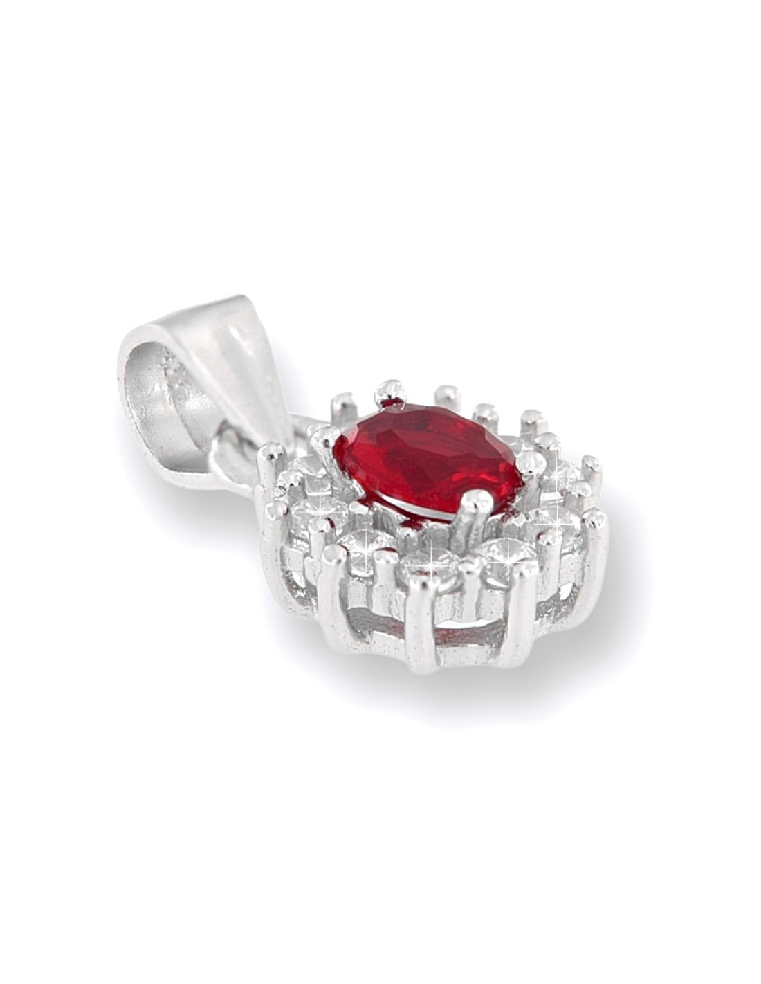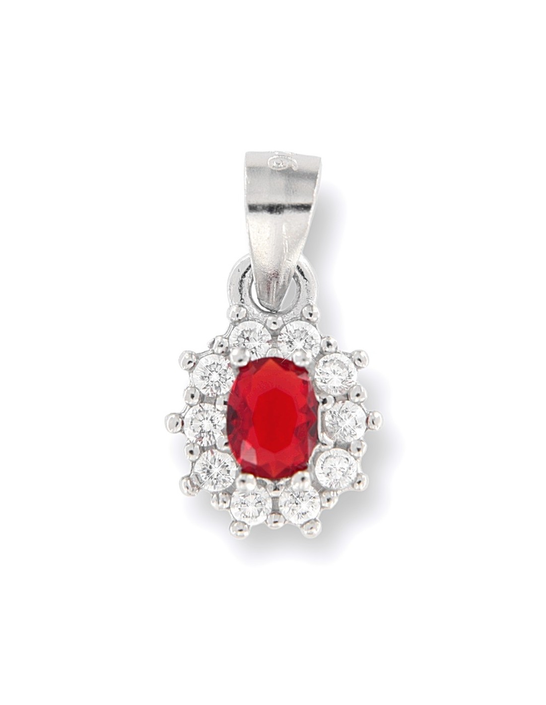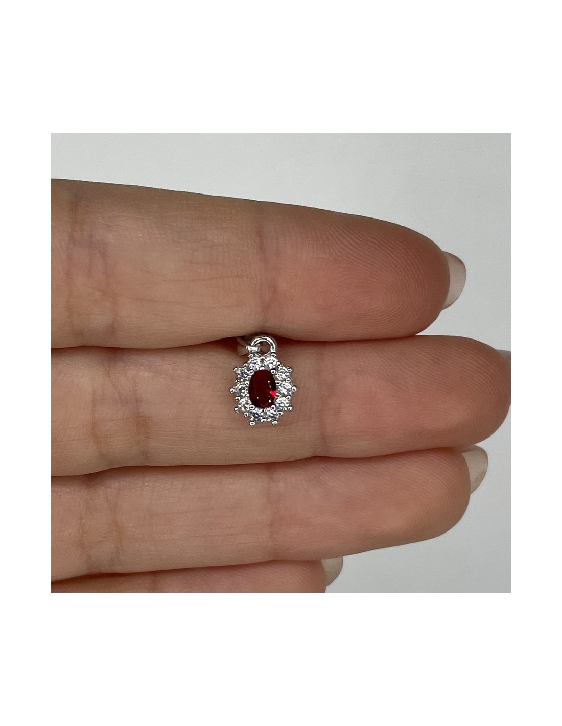 •MATERIALE: Il ciondolo è realizzato interamente in argento 925‰ Rodiato (trattamento brillantante contro l'annerimento) modello Principessa con l'applicazione di uno Zirconia Cubica colore rosso taglio ovale misura 4x3 millimetri con un cotorno di 10 Zirconia Cubica o CZ bianchi da 1 millimetro di diametro con taglio di alta qualità simile al taglio Brillante del Diamante;