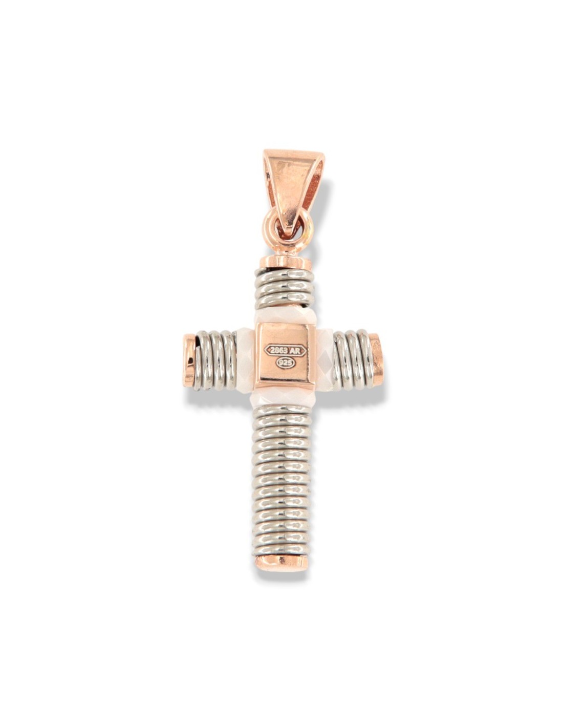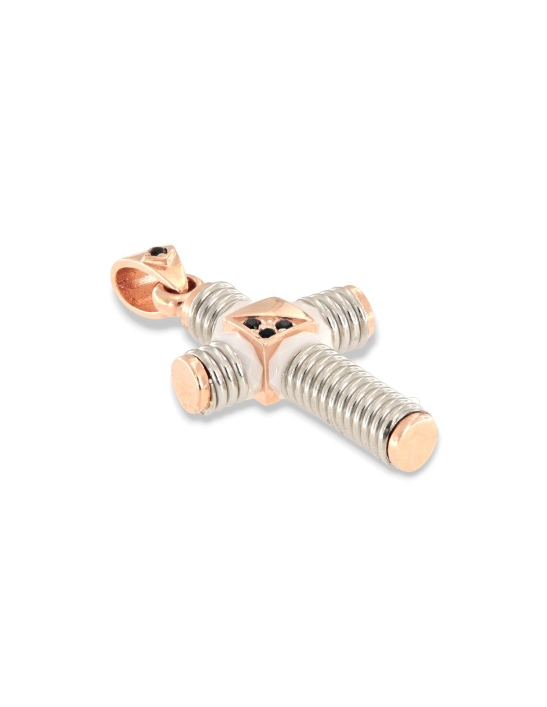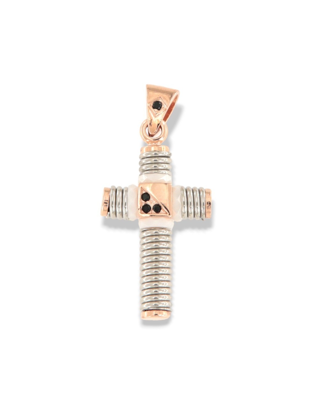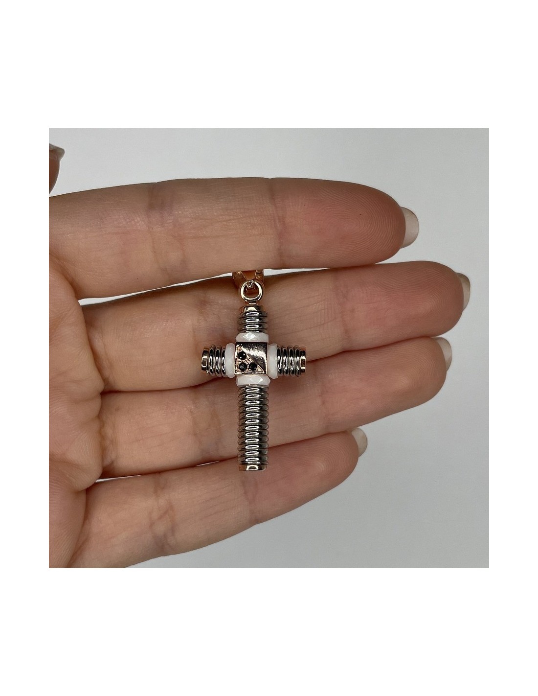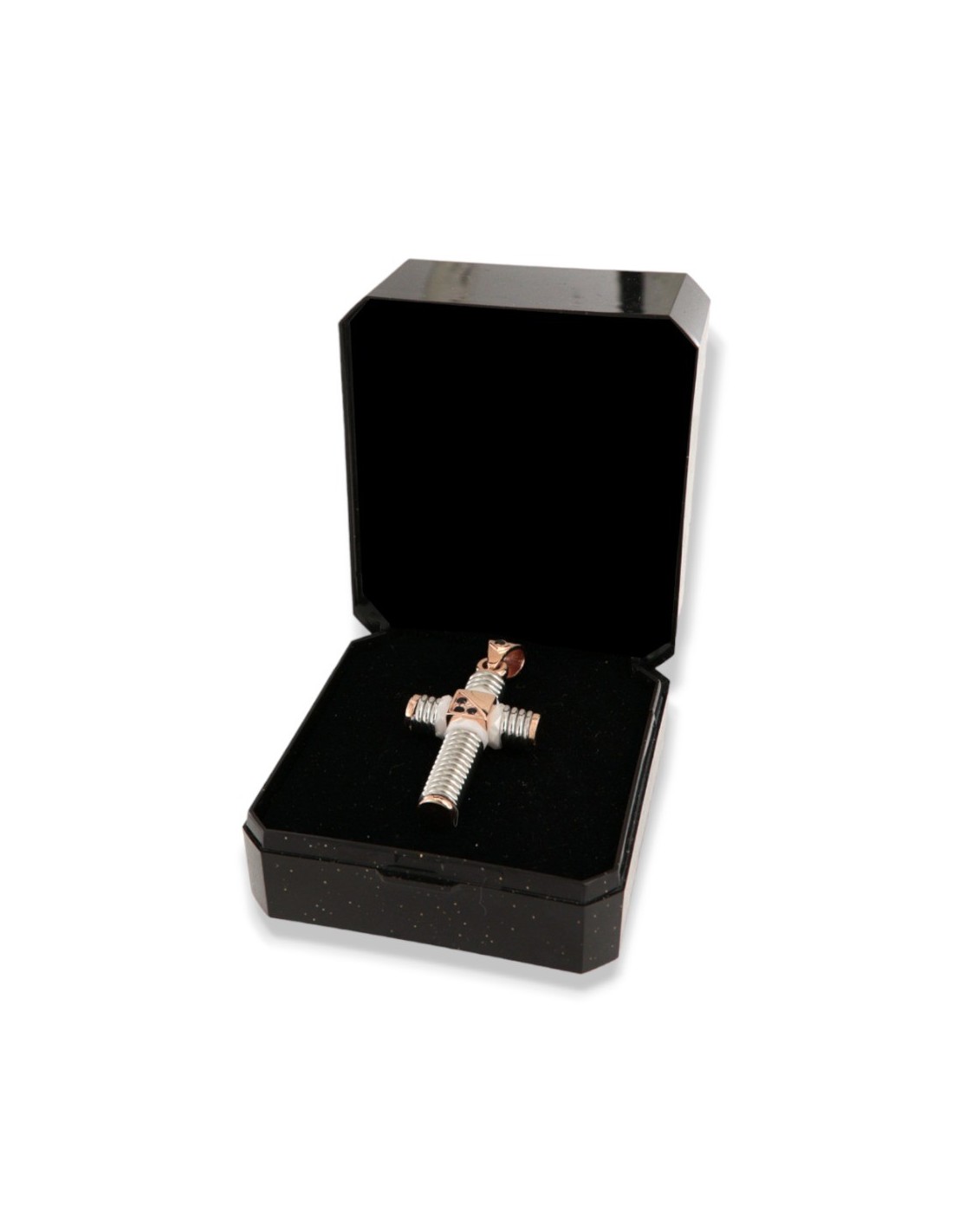 •MATERIALE: Il ciondolo è realizzato in argento 925‰ Rodiato e Rosato (trattamento brillantante contro l'annerimento) a forma di croce. Sulla superificie frontale troviamo 4 Zirconia Cubica o CZ neri, tre centrali e uno sulla contromaglia, con taglio di alta qualità simile al taglio Brillante del Diamante;