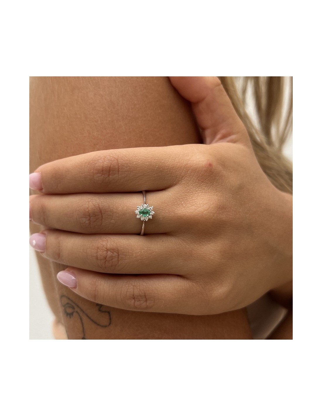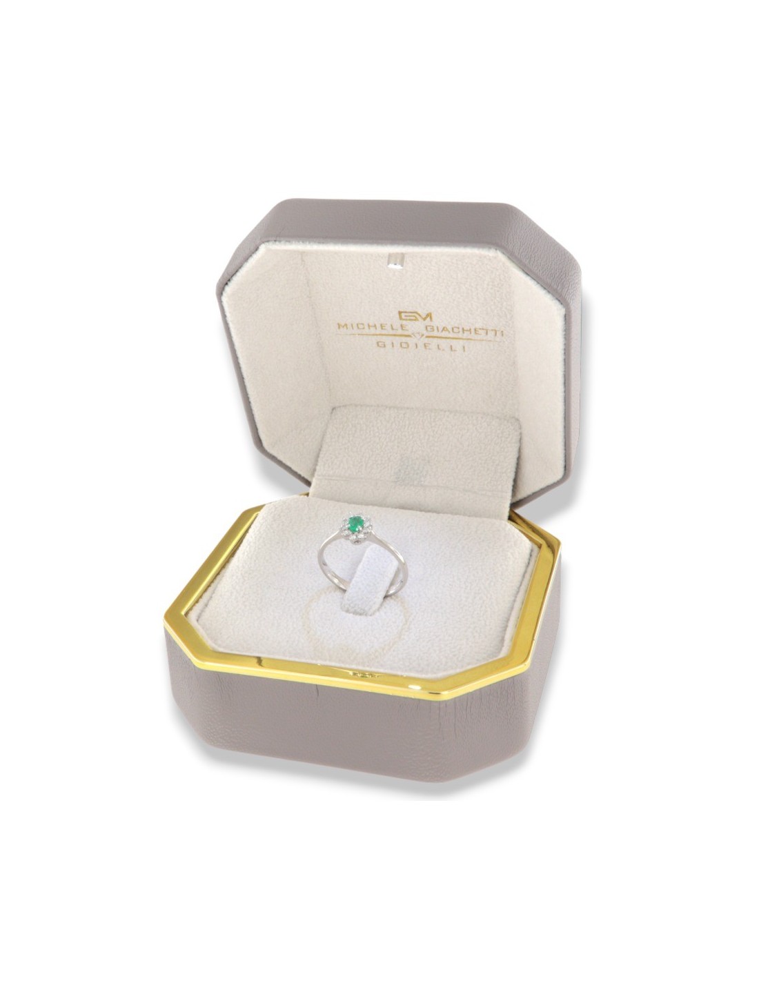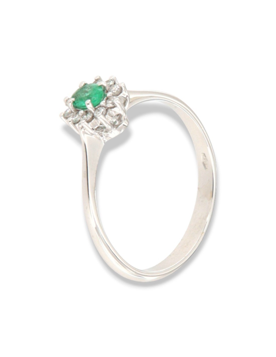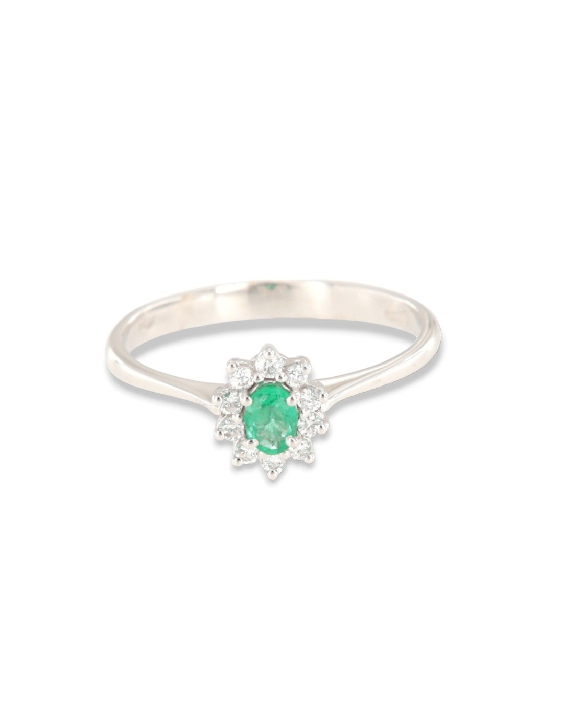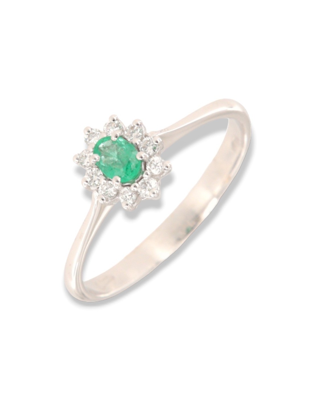 •MATERIALE: l'anello è realizzato interamente in oro Bianco 750‰ (18 Carati) modello Principessa con l'applicazione di uno Smeraldo centrale misura 4x3 millimetri dal peso di 0,13 Carati, circondati da 10 Diamanti colore F, purezza VS1 e dal peso complessivo di 0,11 Carati;