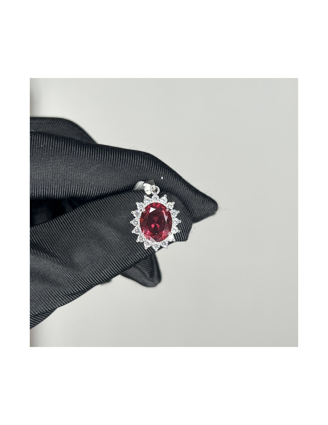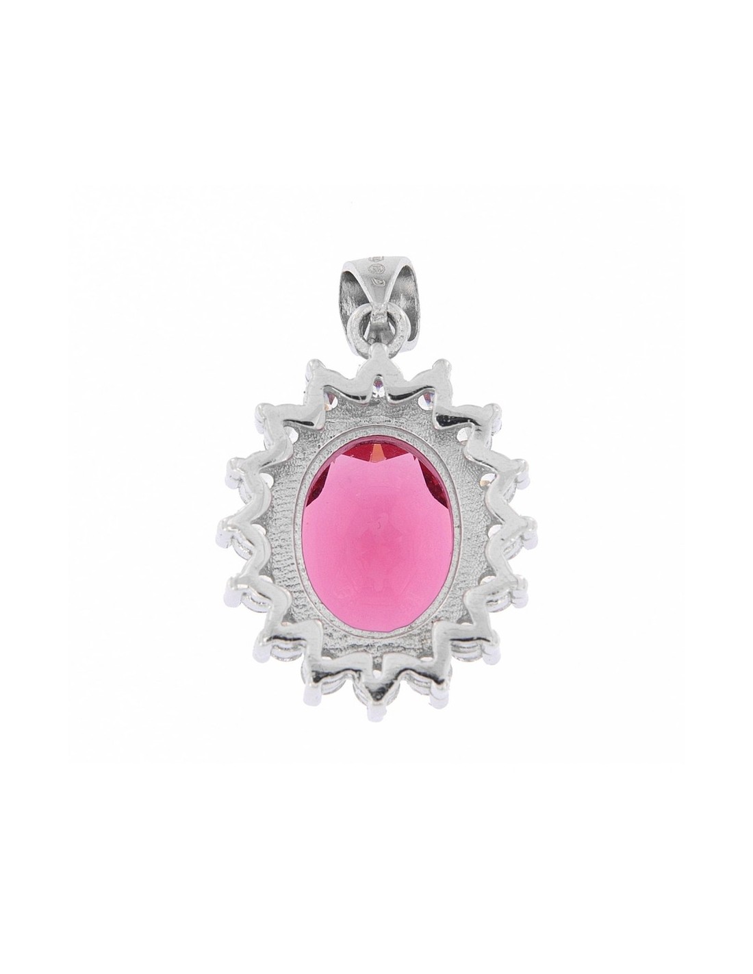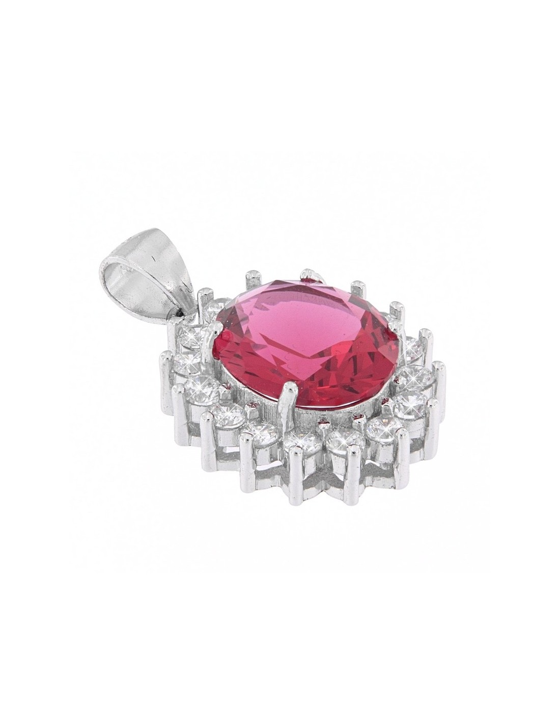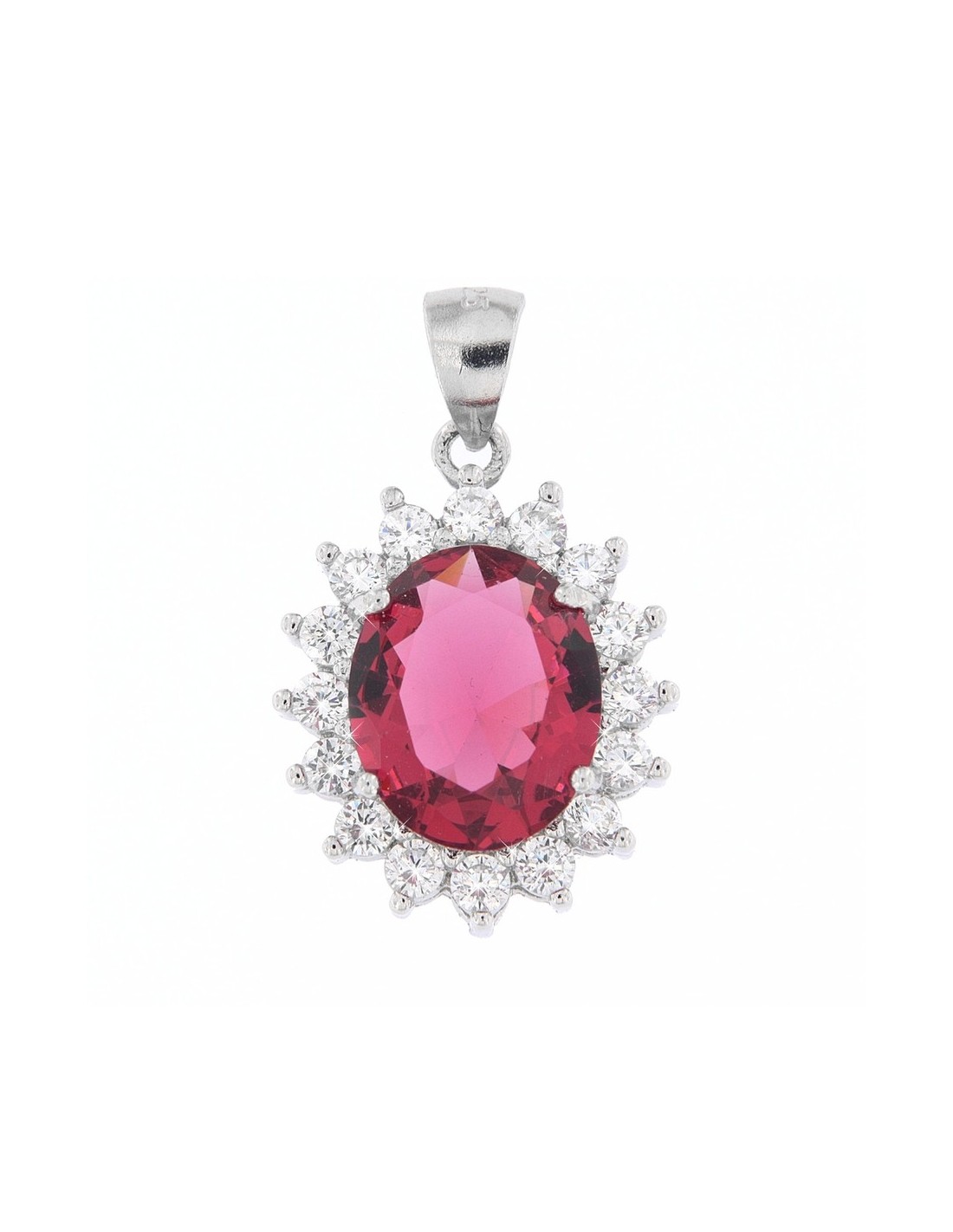 •MATERIALE: Il ciondolo è realizzato interamente in argento 925‰ Rodiato (trattamento brillantante contro l'annerimento) modello Principessa con l'applicazione di uno Zirconia Cubica colore rosso taglio ovale misura 11x9 millimetri con un cotorno di 16 Zirconia Cubica o CZ bianchi da 2 millimetri di diametro con taglio di alta qualità simile al taglio Brillante del Diamante;