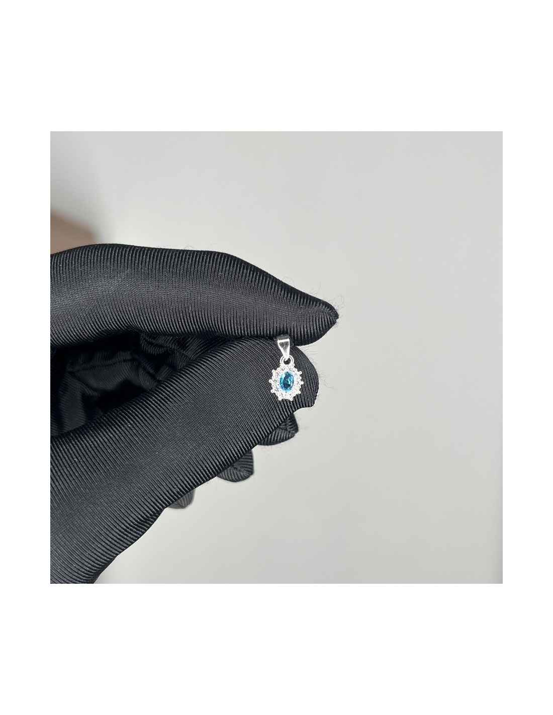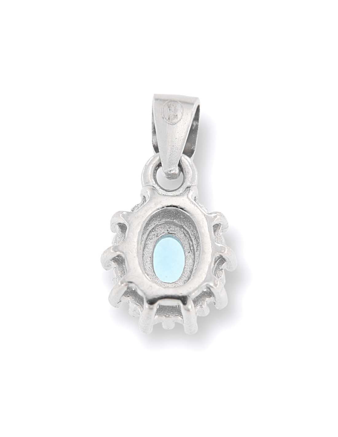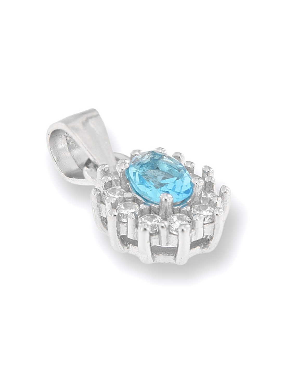 •MATERIALE: Il ciondolo è realizzato interamente in argento 925‰ Rodiato (trattamento brillantante contro l'annerimento) modello Principessa con l'applicazione di uno Zirconia Cubica colore celeste taglio ovale misura 4x3 millimetri con un cotorno di 10 Zirconia Cubica o CZ bianchi da 1 millimetro di diametro con taglio di alta qualità simile al taglio Brillante del Diamante;