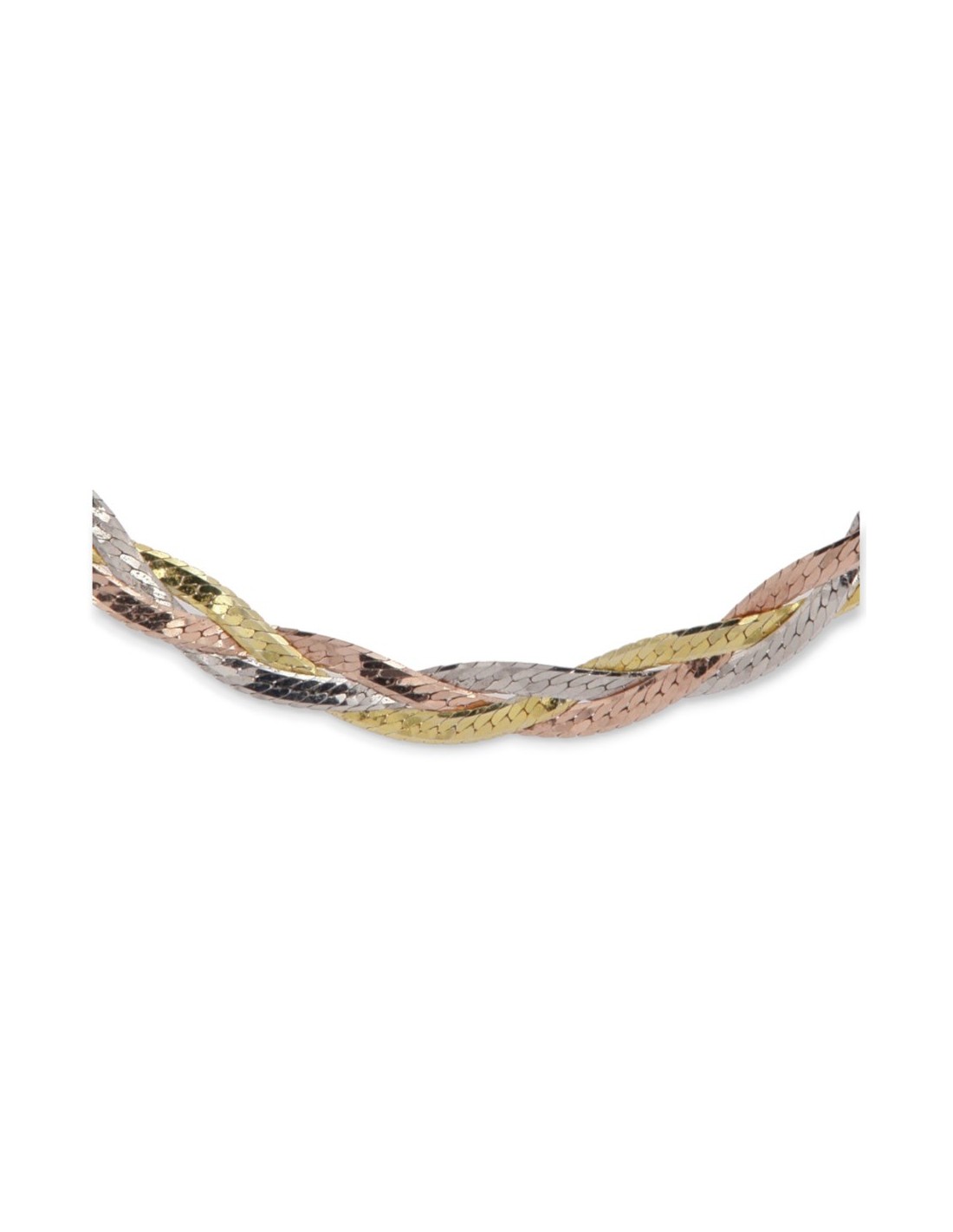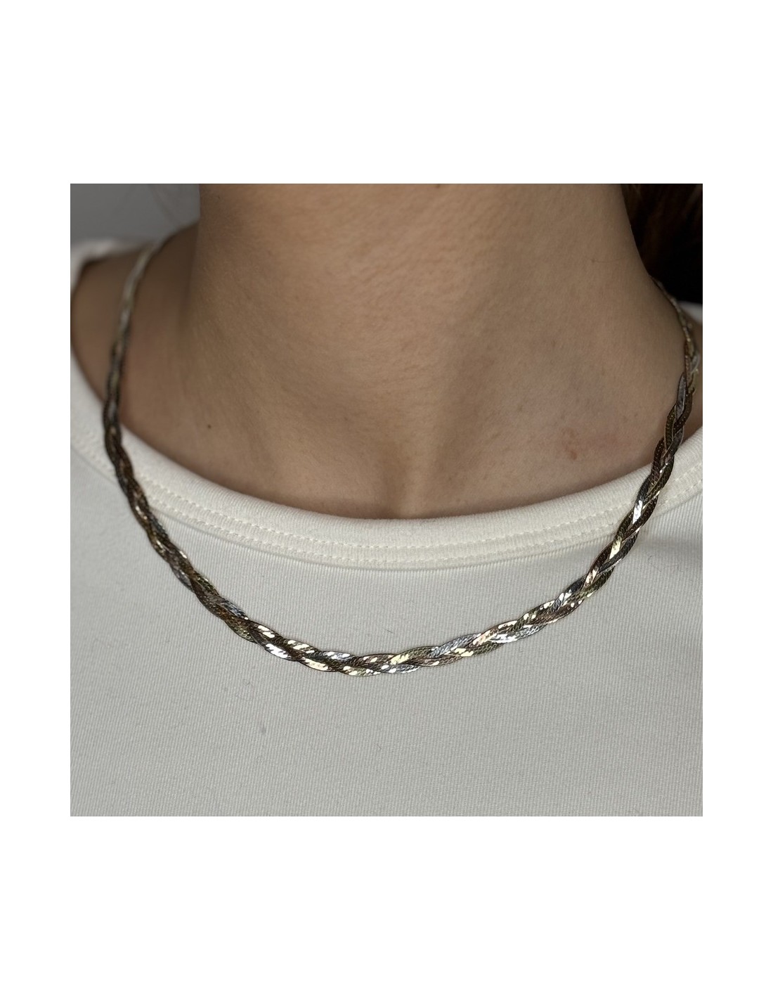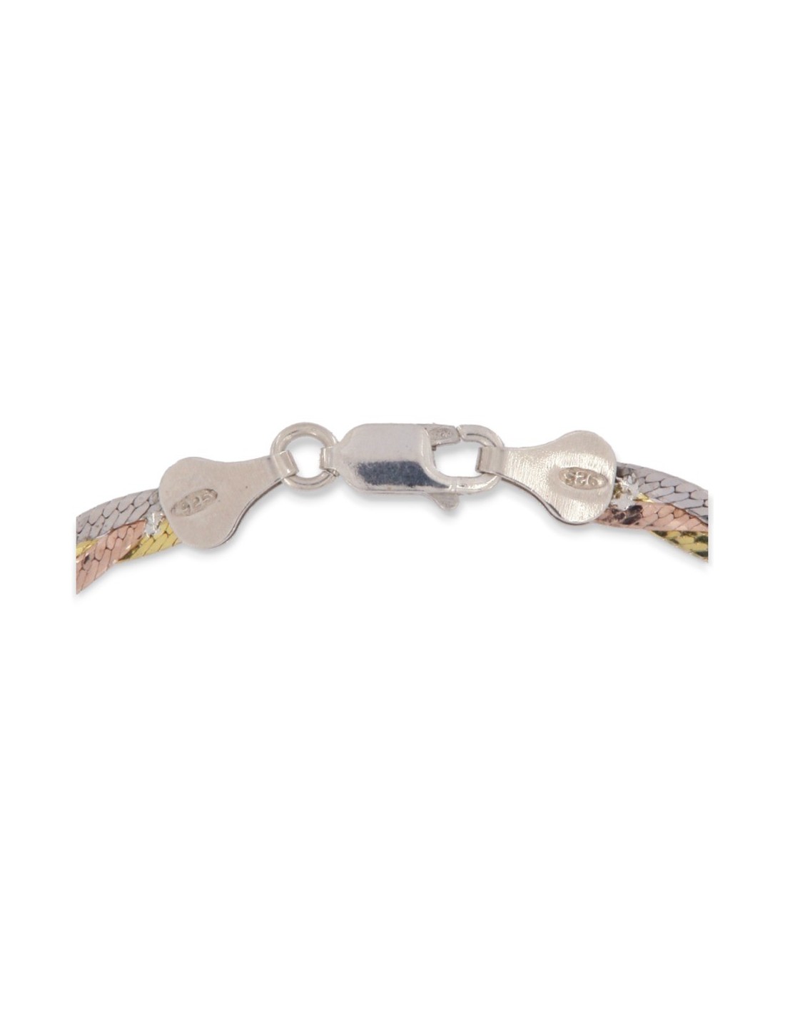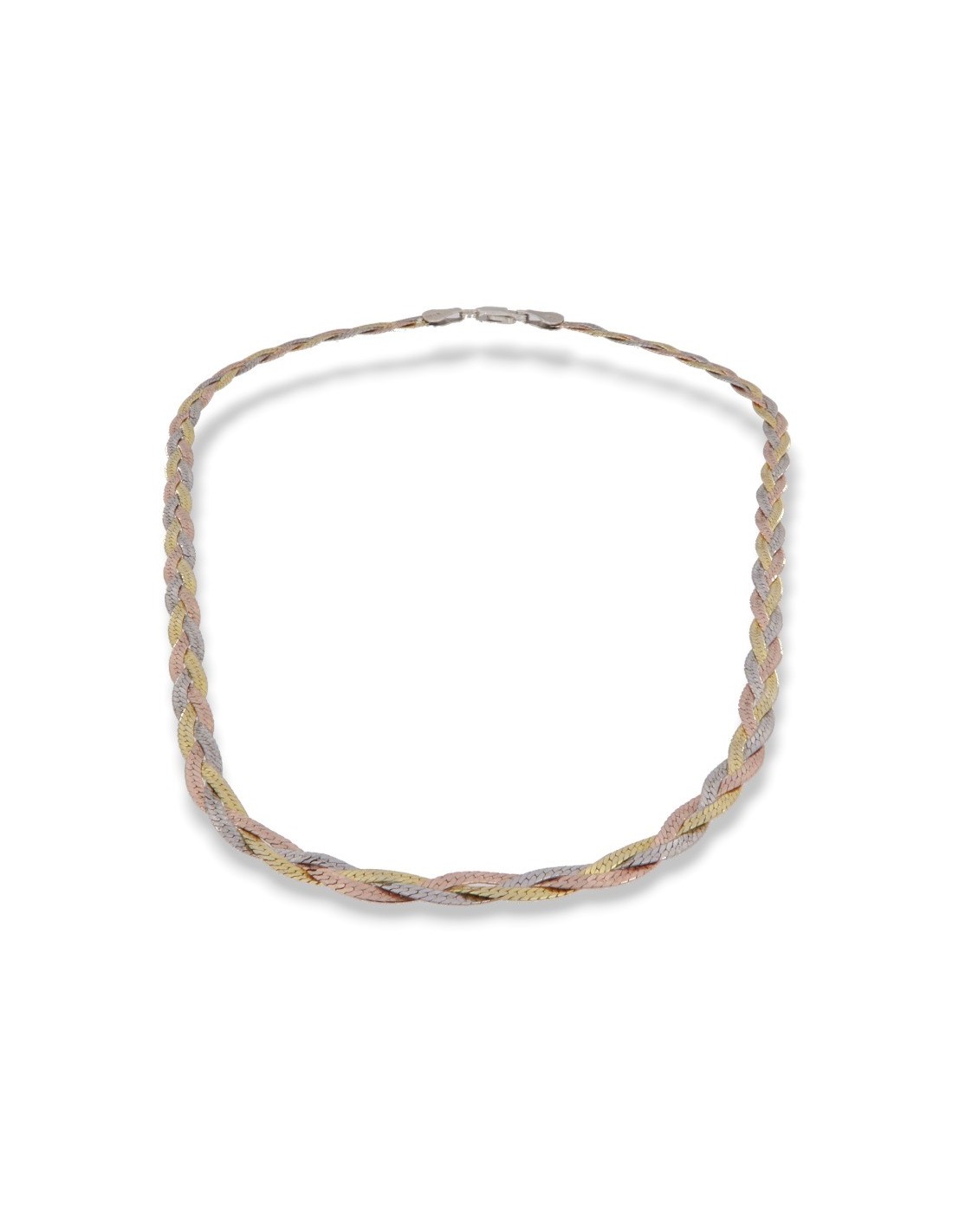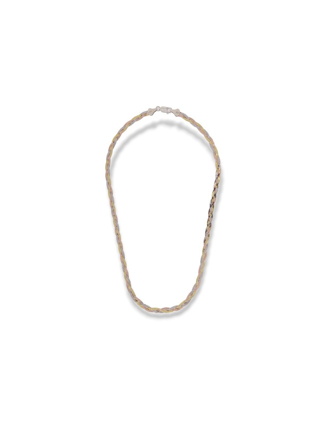 -MATERIALE: la collana è realizzata interamente in argento 925‰ Dorato,Rodiato e Dorato rosè (trattamento brillantante contro l'annerimento) modello treccia formata da tre catene schiacciate modello coda di toponei tre colori dell'oro, ovvero le tre catene hanno un trattamento galvanico di doratura gialla, doratura rosa e rodiatura;
