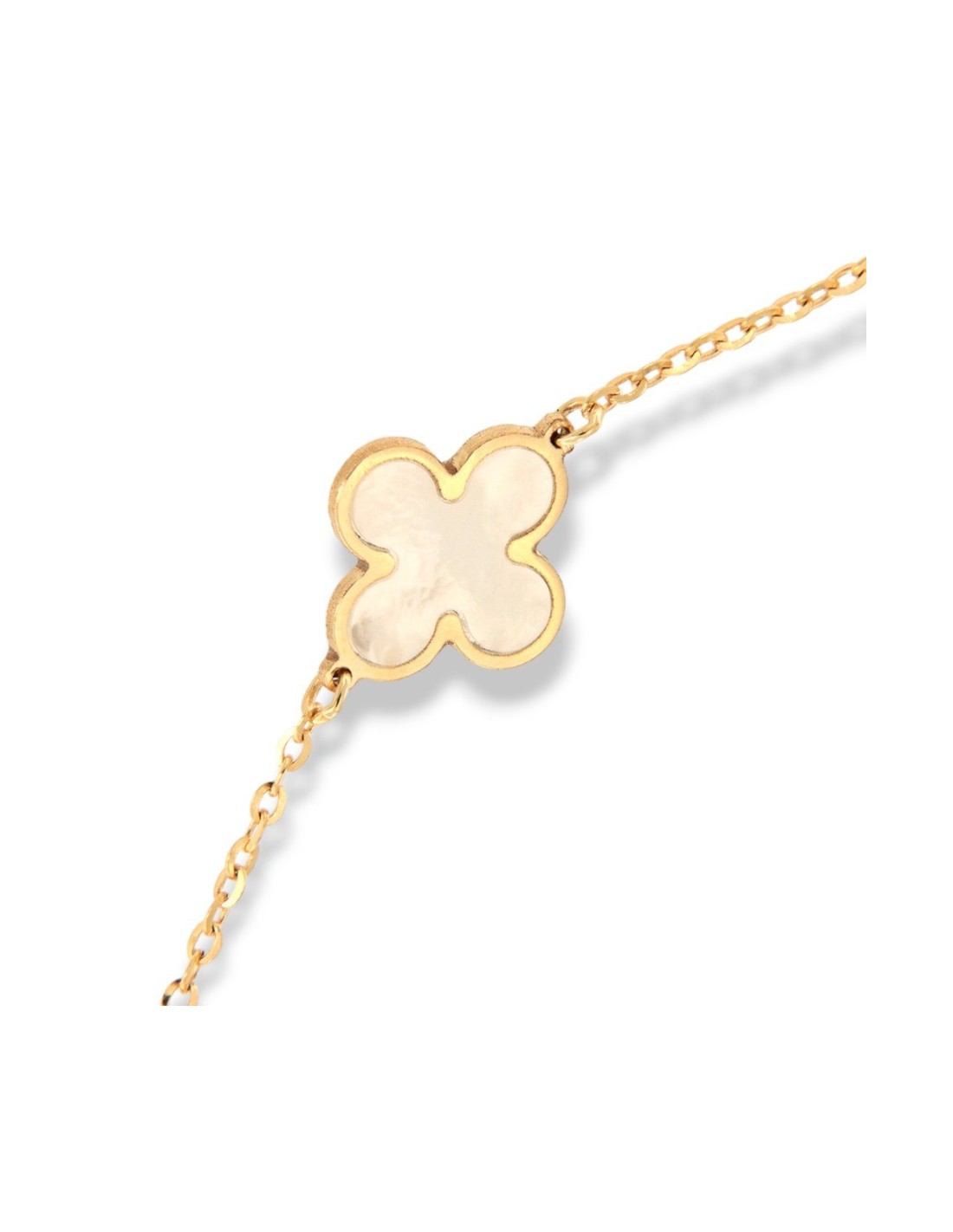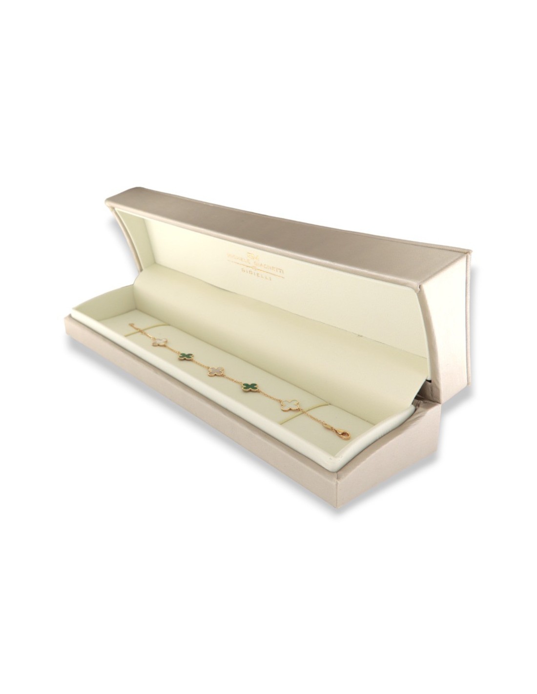 •MATERIALE: il bracciale è realizzato interamente in oro Giallo 750‰ (18 Carati ) modello Catenina con ciondoli a formi di fiore composto da Madre Perla e da Malachite;