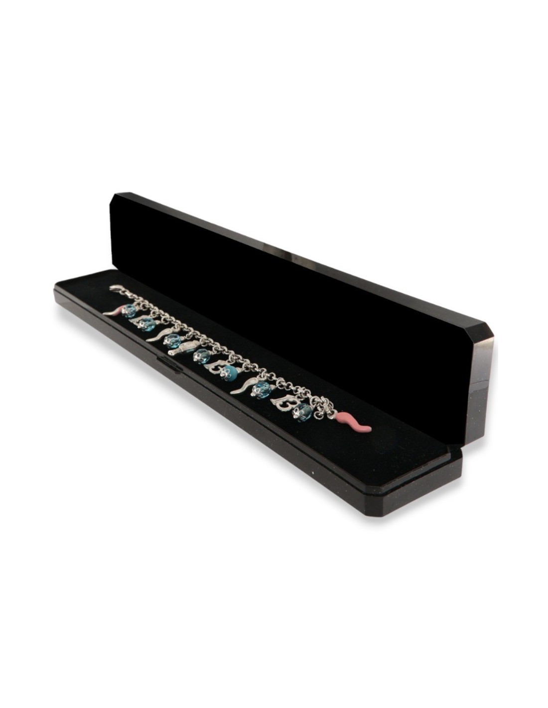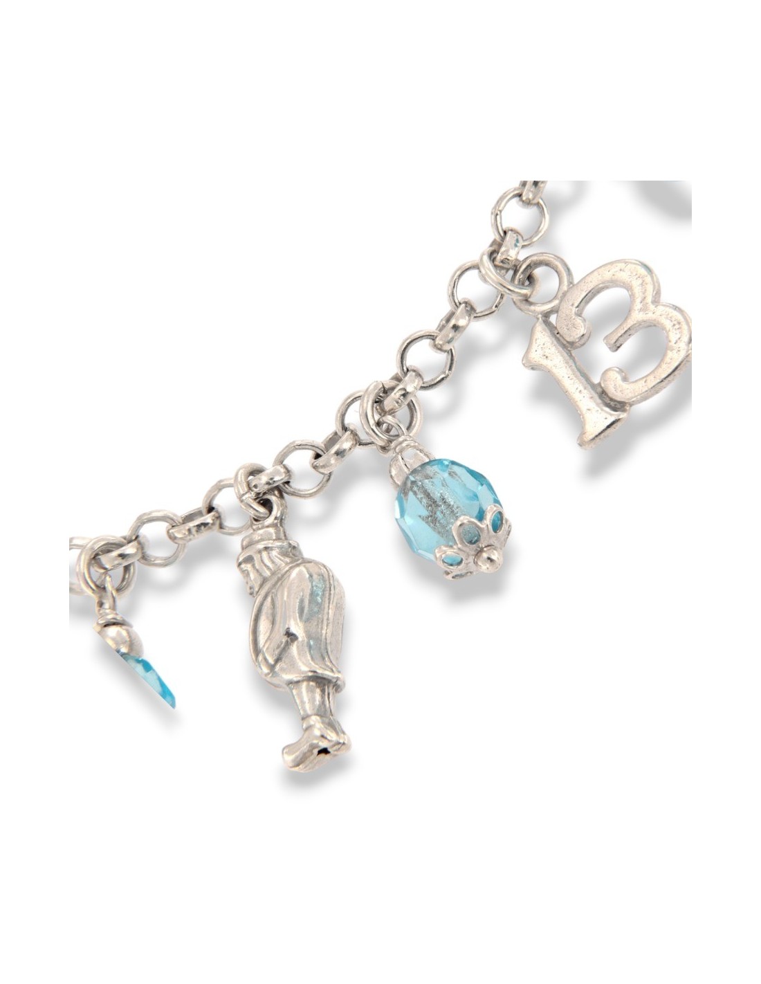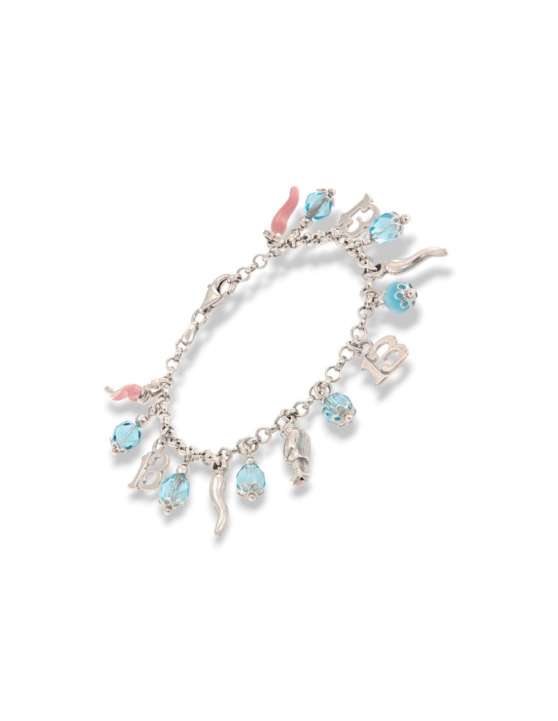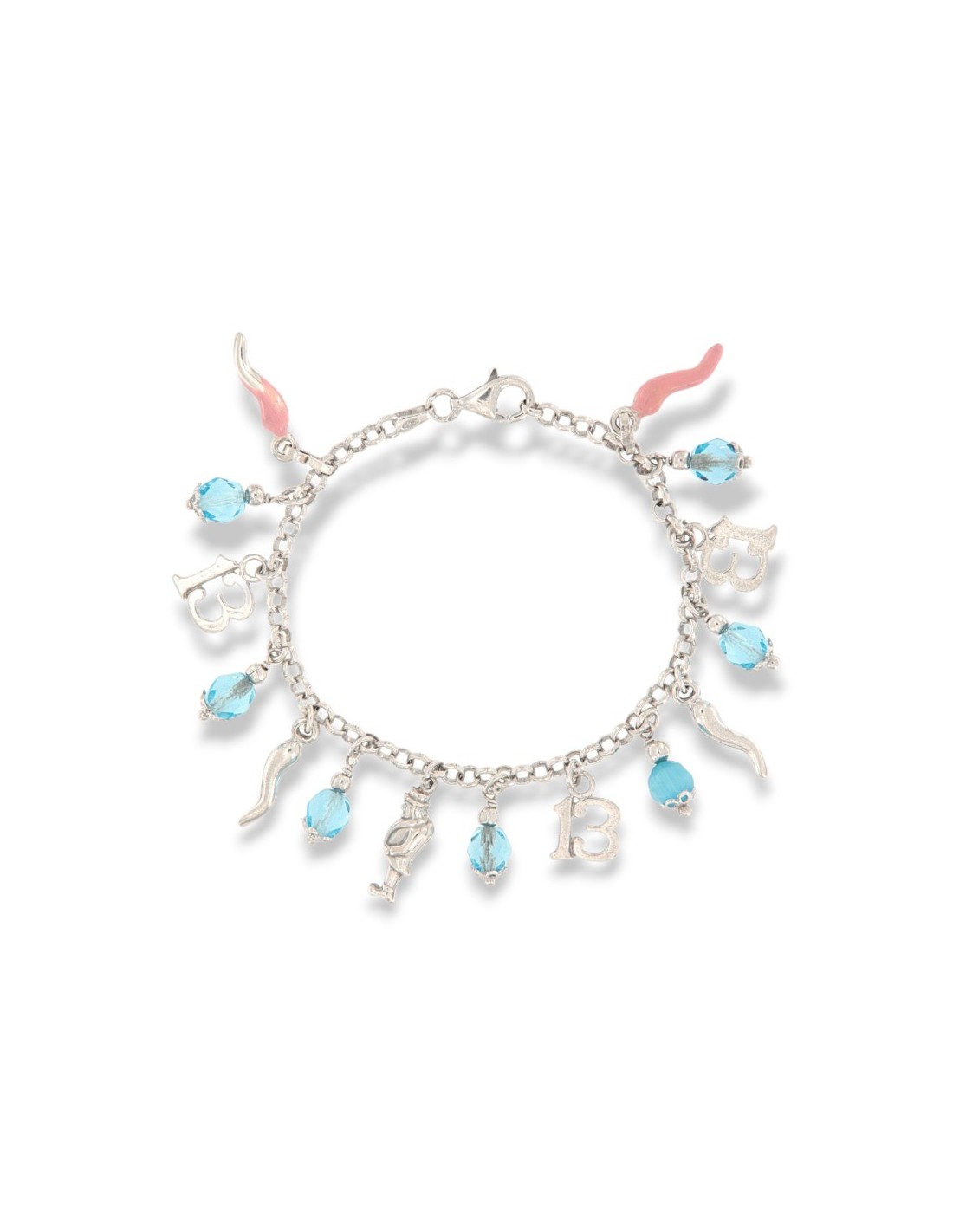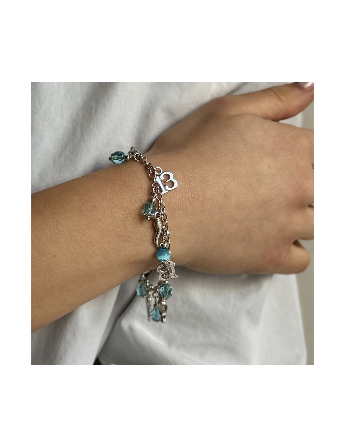 •MATERIALE: il bracciale è realizzato interamente in argento 925‰ Rodiato (trattamento brillantante contro l'annerimento) modello pendenti portafortuna con ciondoli a forma di corni, sfere sfaccettate celesti, iniziali e altri ancora;