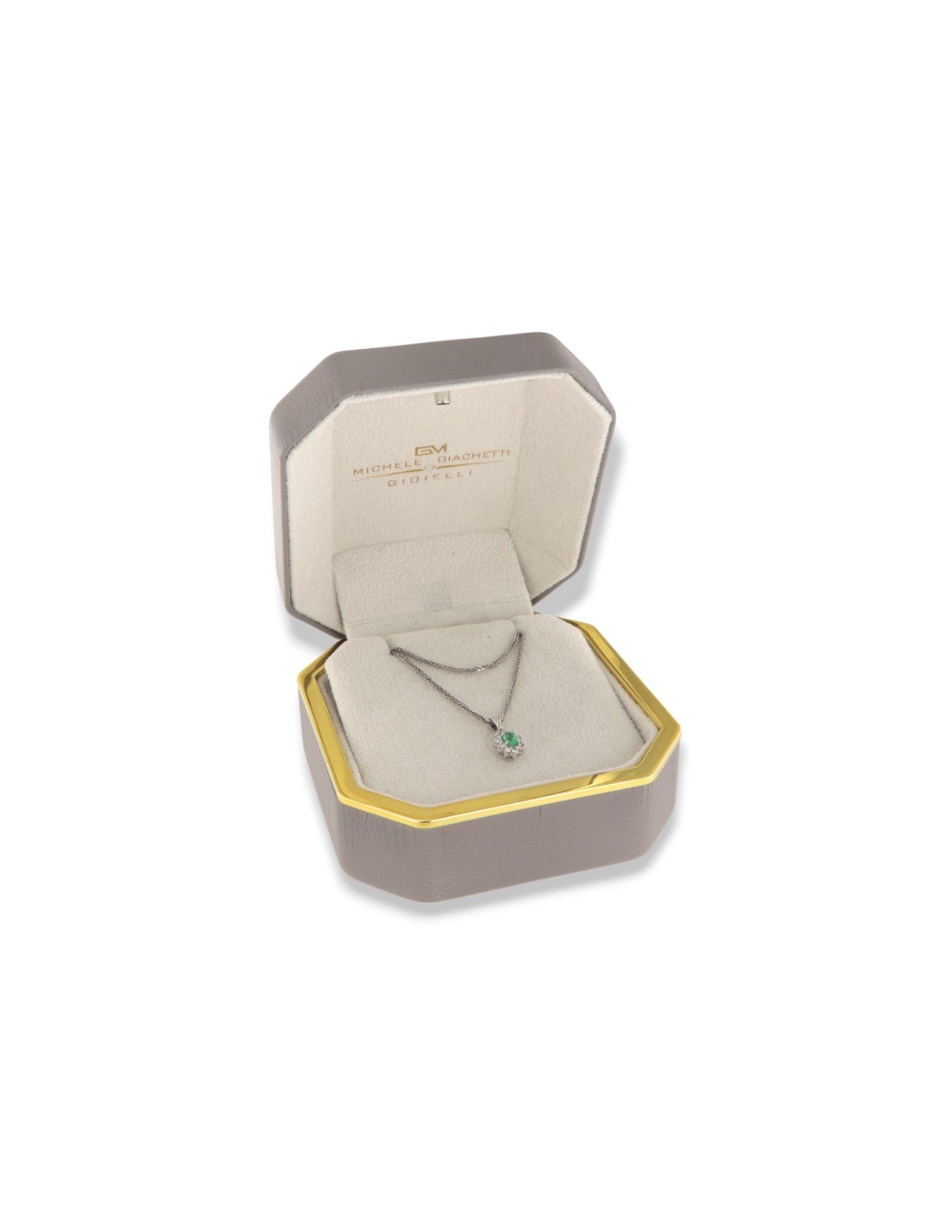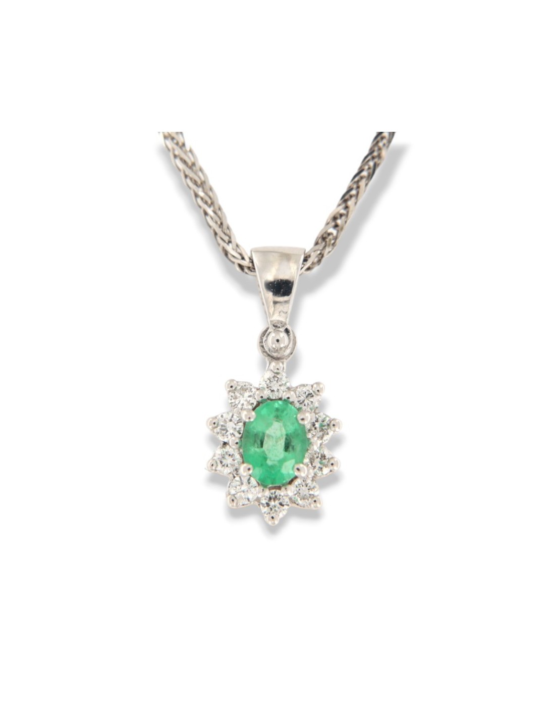 •MATERIALE: il ciondolo è realizzato interamente in oro Bianco 750‰ (18 Carati) modello Principessa con l'applicazione di uno Smeraldo Ovale centrale da 0,16 Carati, misura 4x3 millimetri, circondato da 10 Diamanti, colore F, purezza VS1 da 0,012 Carati l'uno per un totale di 0,12 Carati;