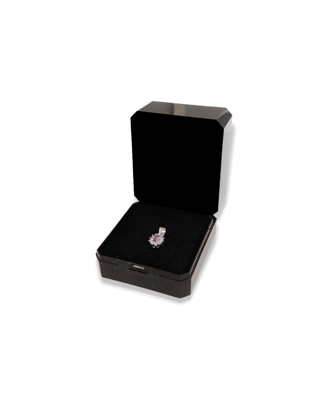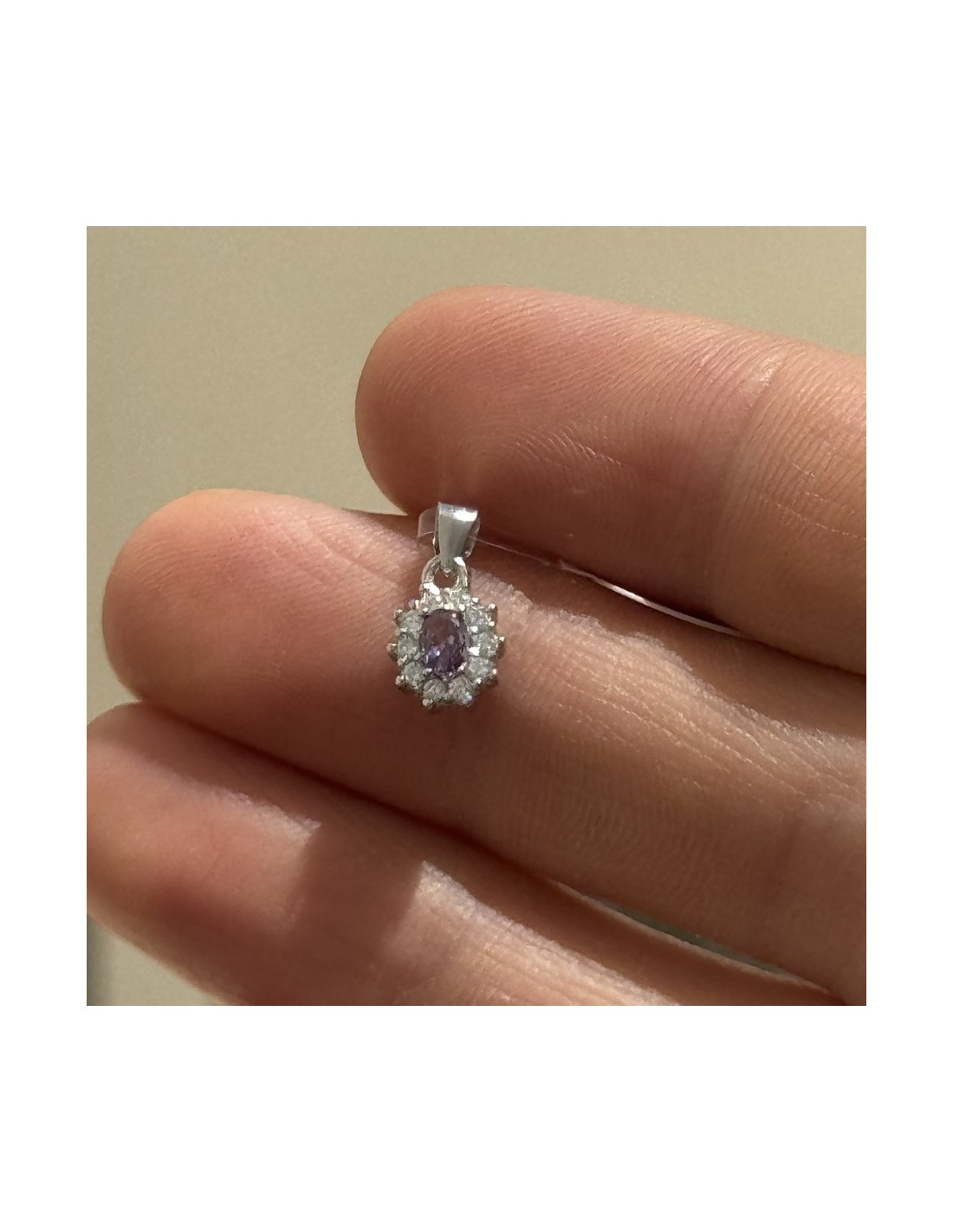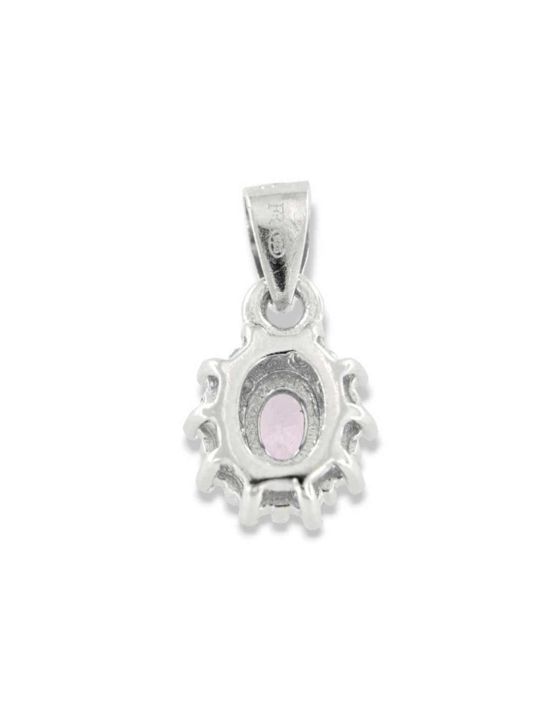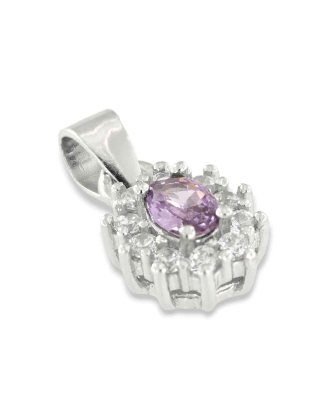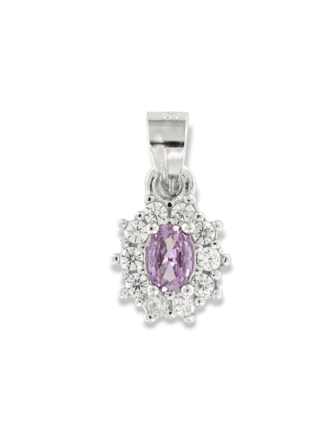 •MATERIALE: Il ciondolo è realizzato interamente in argento 925‰ Rodiato (trattamento brillantante contro l'annerimento) modello Principessa con l'applicazione di uno Zirconia Cubica colore lilla taglio ovale misura 4x3 millimetri con un cotorno di 10 Zirconia Cubica o CZ bianchi da 1 millimetro di diametro con taglio di alta qualità simile al taglio Brillante del Diamante;