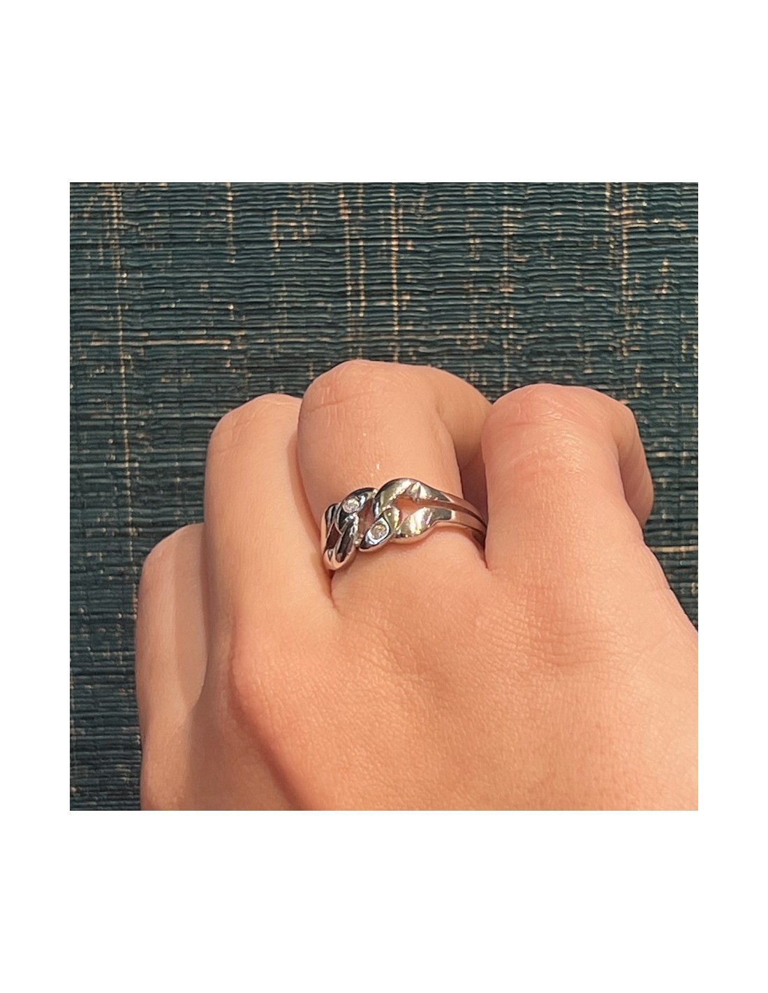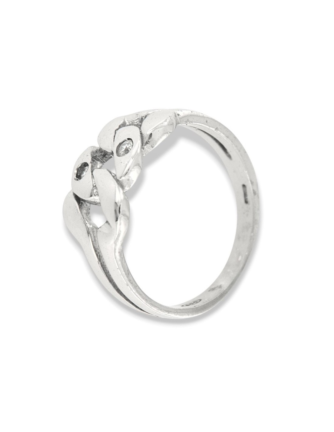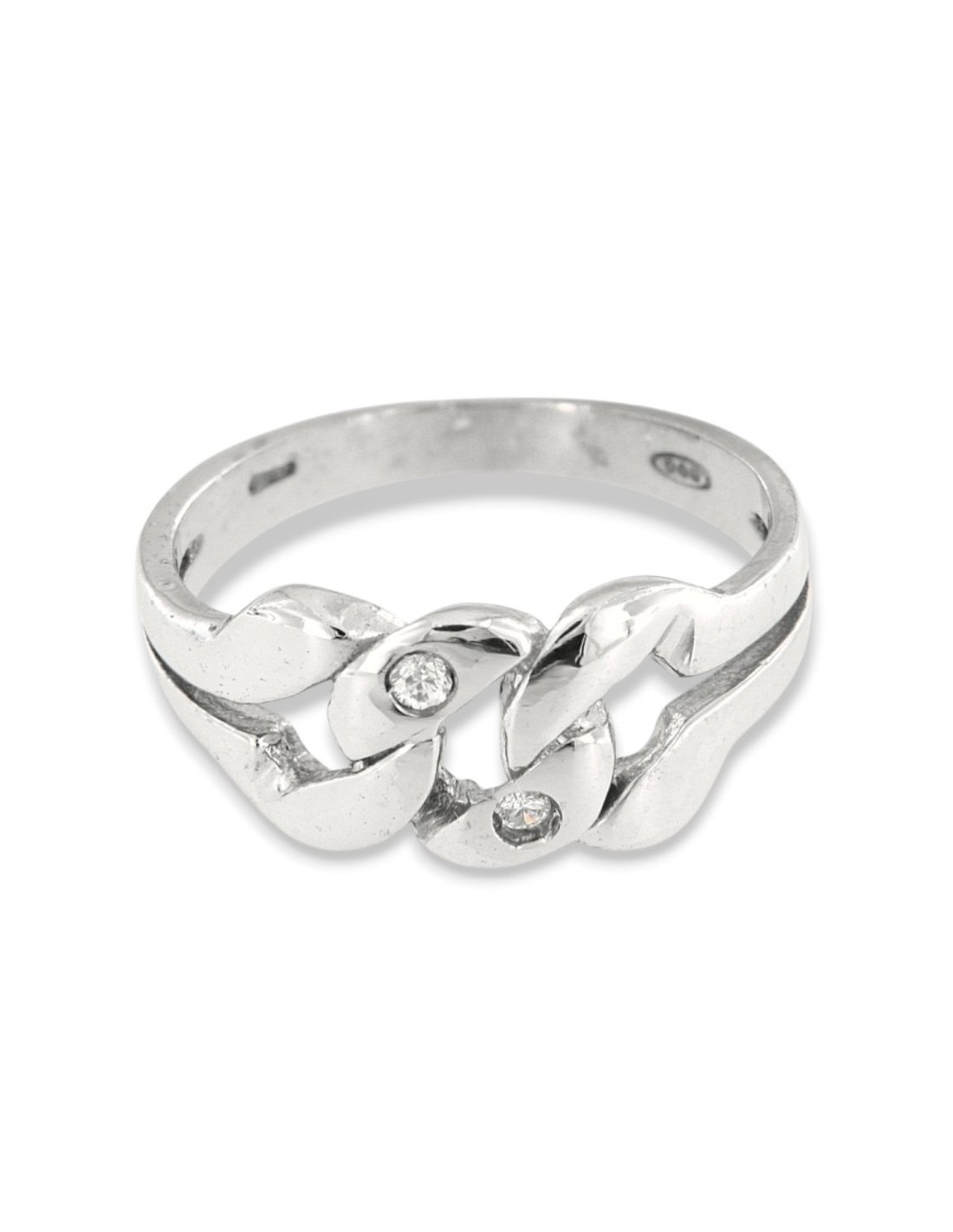 •MATERIALE: l'anello è realizzato interamente in argento 925‰ Rodiato (trattamento brillantante contro l'annerimento). La parte superiore dell'anello è caratterizzato dall'unione di tre maglie grumetta accompagnate da due Zirconia Cubica o pietre CZ bianche, con taglio di alta qualità simile al taglio Brillante del Diamante;