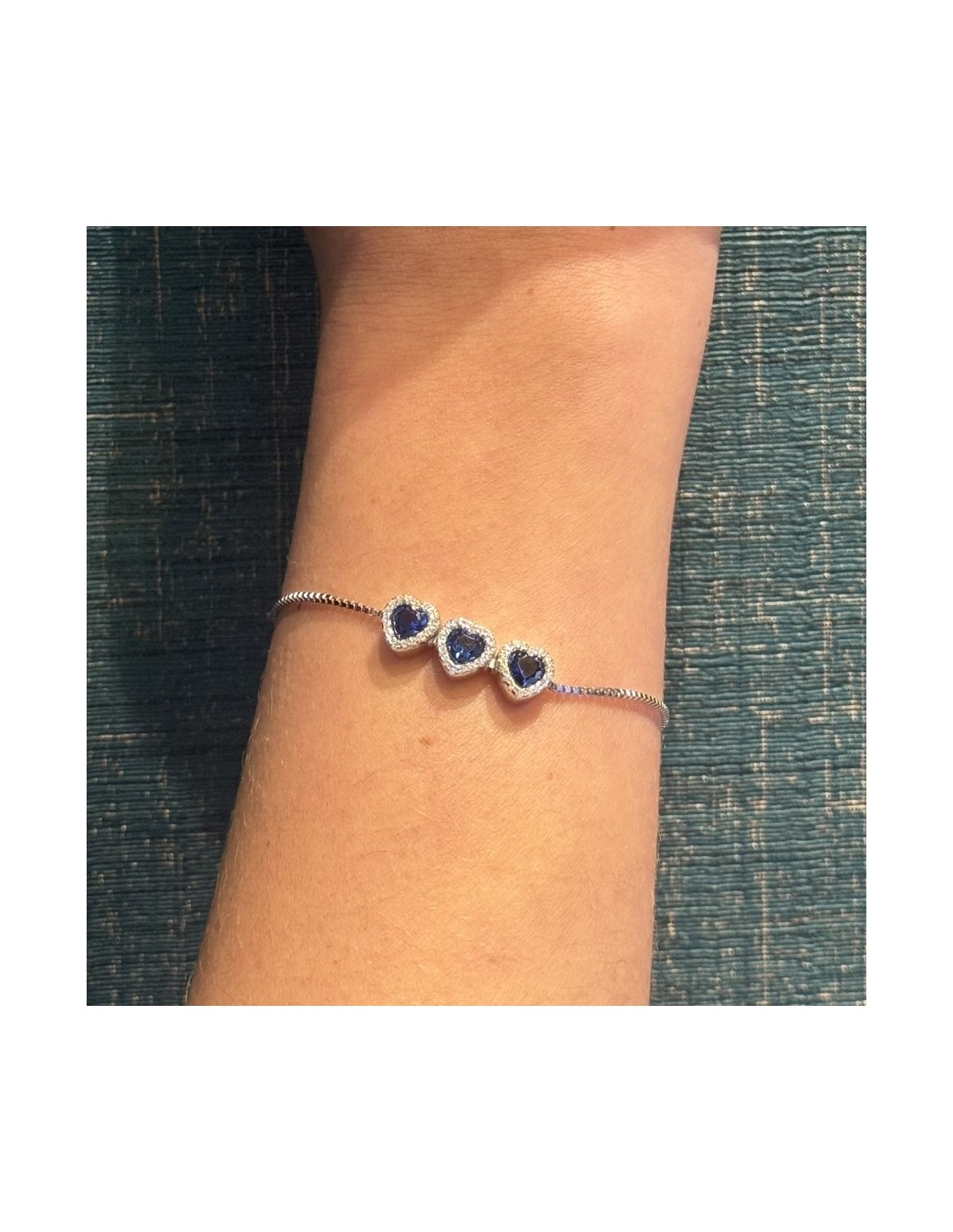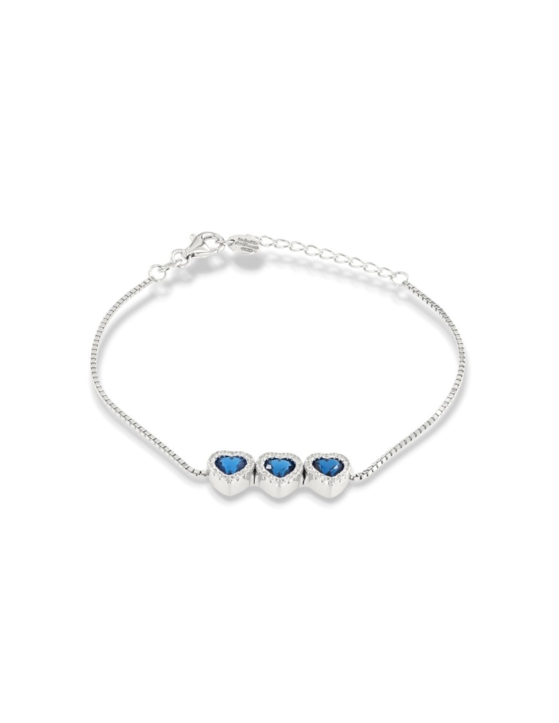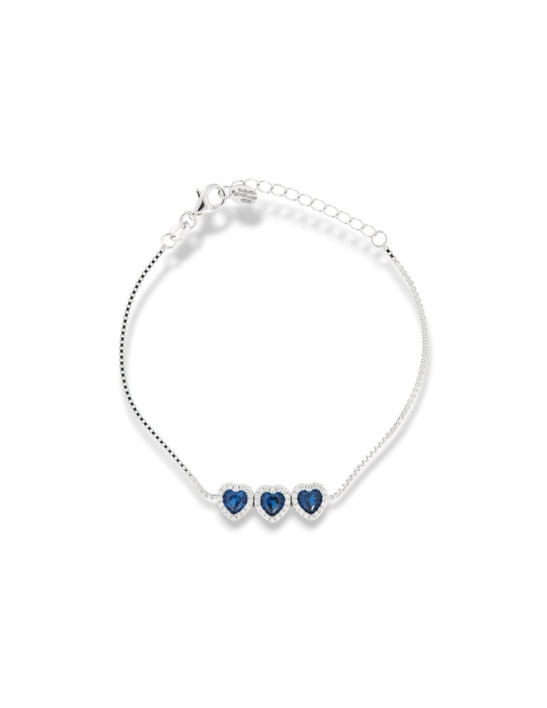•MATERIALE: il bracciale è realizzato interamente in argento 925‰ Rodiato (trattamento brillantante contro l'annerimento) caratterizzato dall'applicazione di 3 ciondoli a forma di cuori con Zirconia Cubica o pietre CZ blu centrali, circondate da altre pietre cz bianche con taglio di alta qualità simile al taglio Brillante del Diamante;