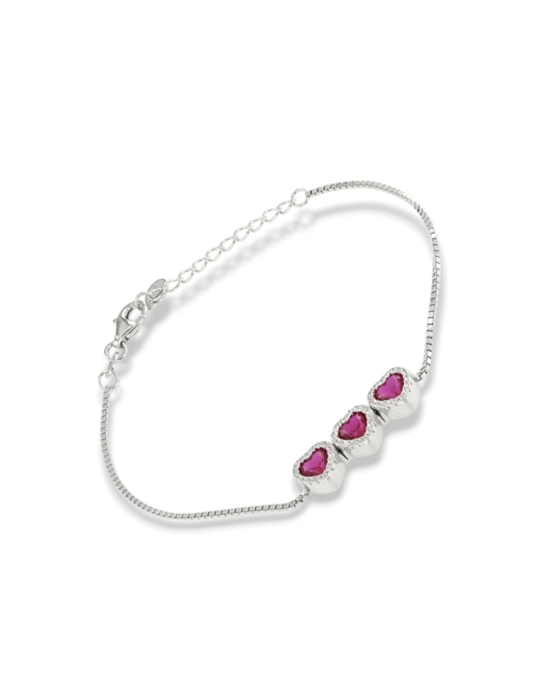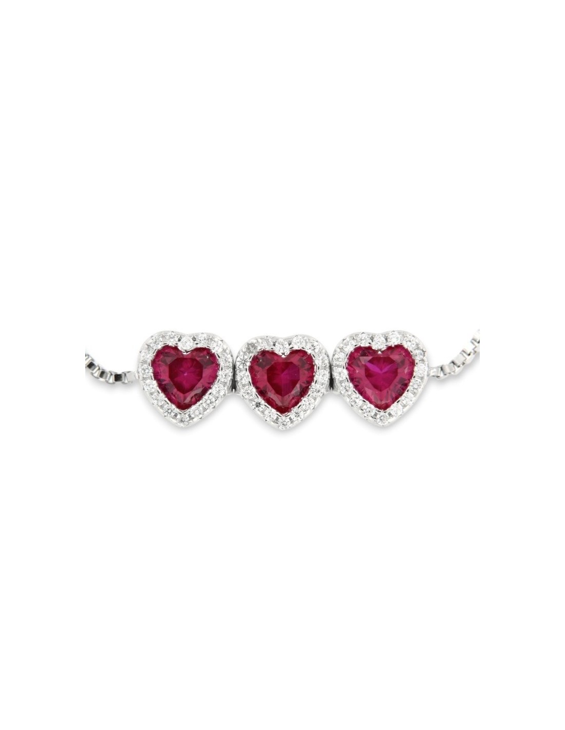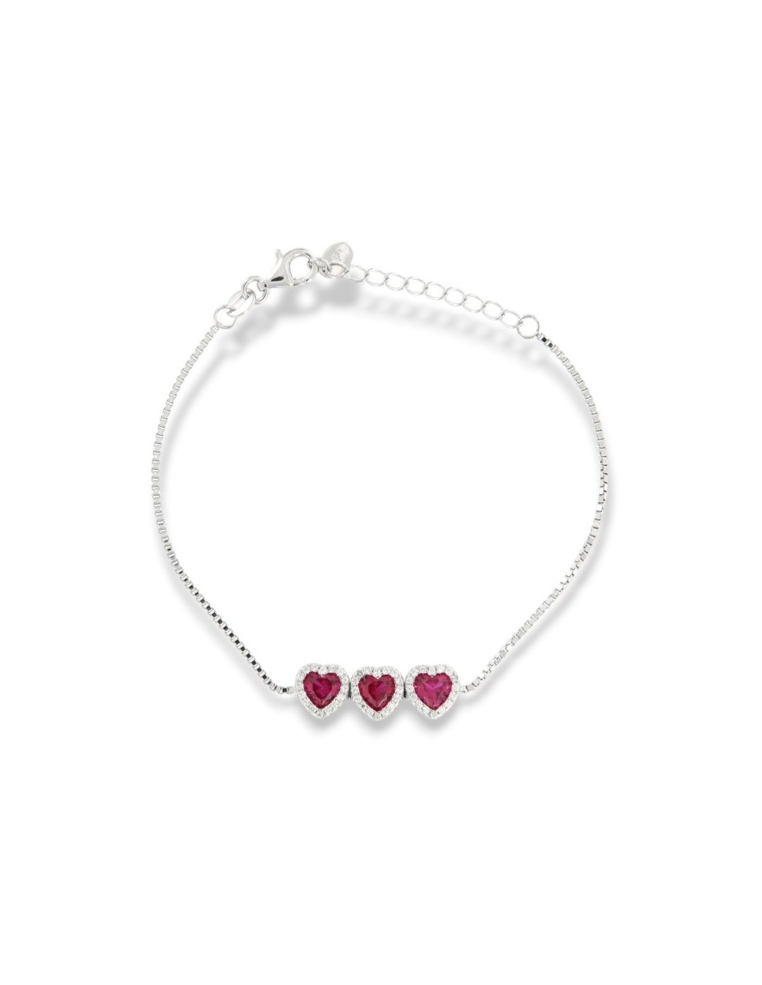 •MATERIALE: il bracciale è realizzato interamente in argento 925‰ Rodiato (trattamento brillantante contro l'annerimento) caratterizzato dall'applicazione di 3 ciondoli a forma di cuori con Zirconia Cubica o pietre CZ rosse centrali, circondate da altre pietre cz bianche con taglio di alta qualità simile al taglio Brillante del Diamante;
