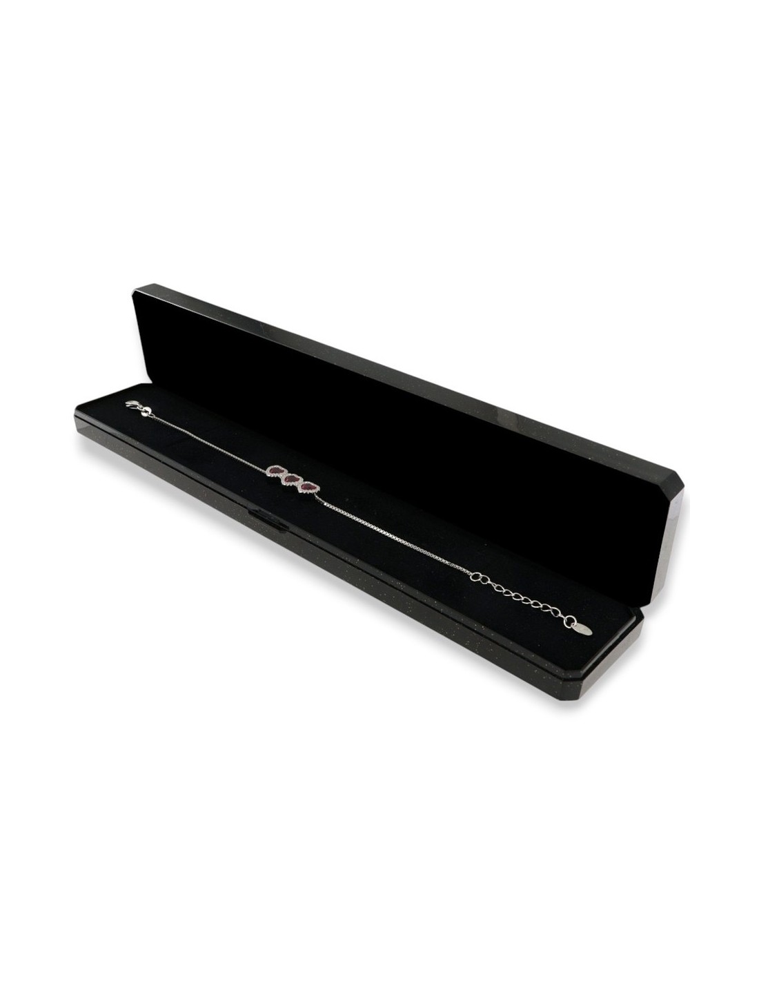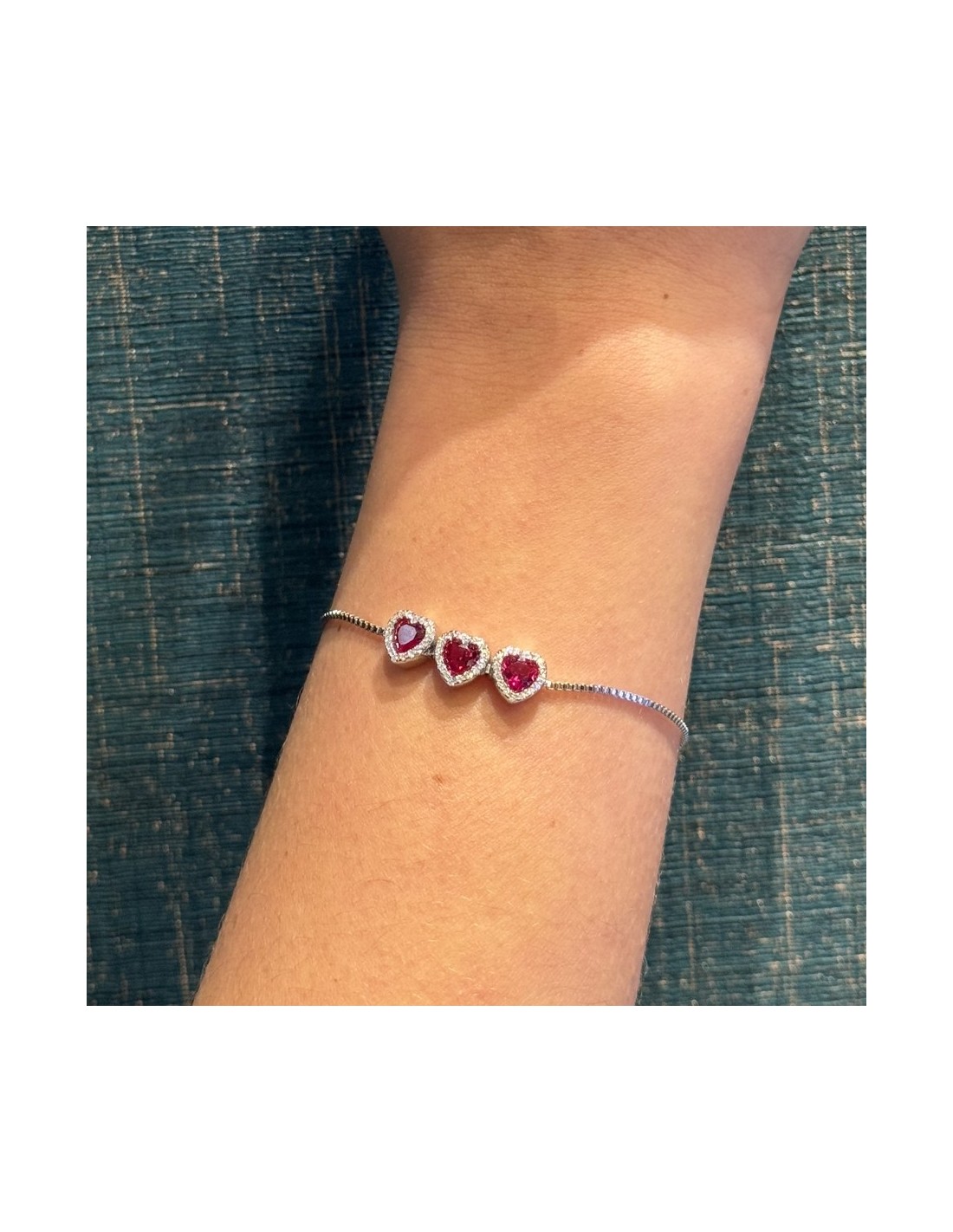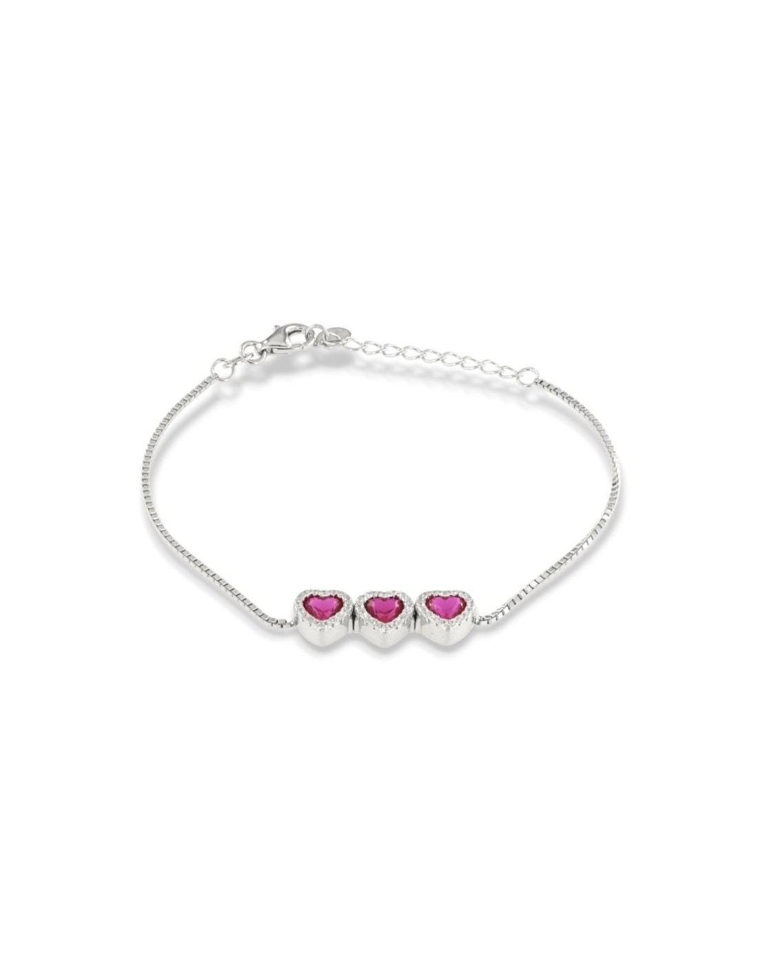 •MATERIALE: il bracciale è realizzato interamente in argento 925‰ Rodiato (trattamento brillantante contro l'annerimento) caratterizzato dall'applicazione di 3 ciondoli a forma di cuori con Zirconia Cubica o pietre CZ rosse centrali, circondate da altre pietre cz bianche con taglio di alta qualità simile al taglio Brillante del Diamante;