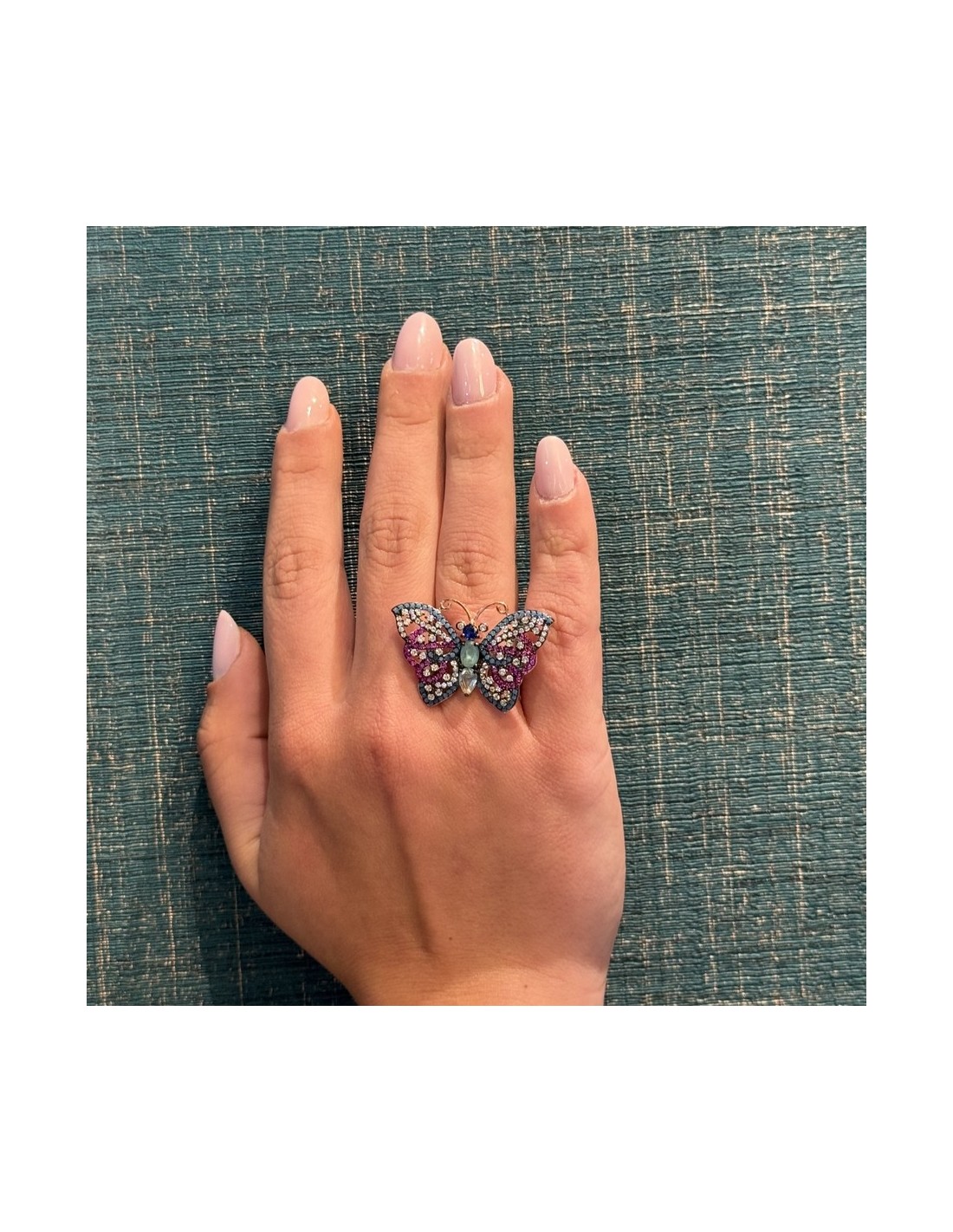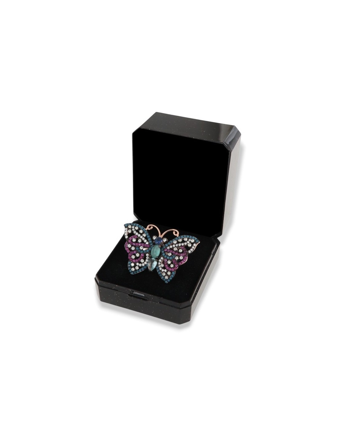 •MATERIALE: l'anello è realizzato interamente in argento 925‰ Rodiato (trattamento brillantante contro l'annerimento) a forma di farfalla, completamente ricoperto da Zirconia Cubica o pietre CZ colorate, con taglio di alta qualità simile al taglio Brillante del Diamante;