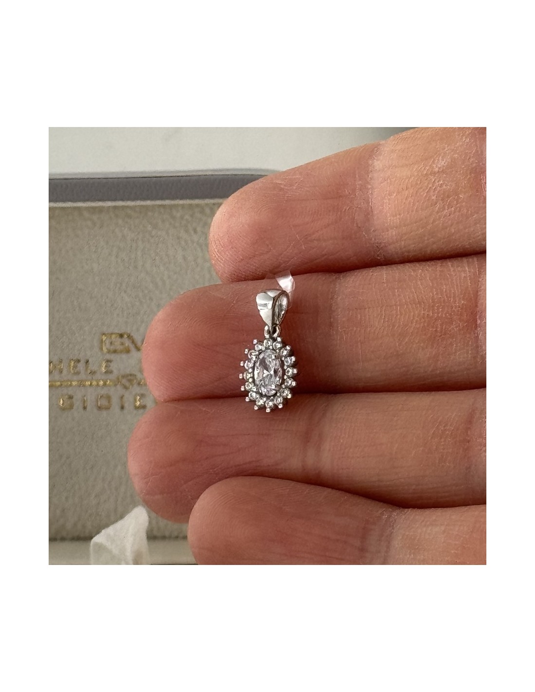 •MATERIALE: il ciondolo è realizzato interamente in oro Bianco 750‰ (18 Carati) modello Principessa, caratterizzato dall'applicazione di uno Zirconia Cubica o pietra CZ centrale bianca, circondata da altre pietre CZ bianche più piccole con taglio di alta qualità simile al taglio Brillante del Diamante;