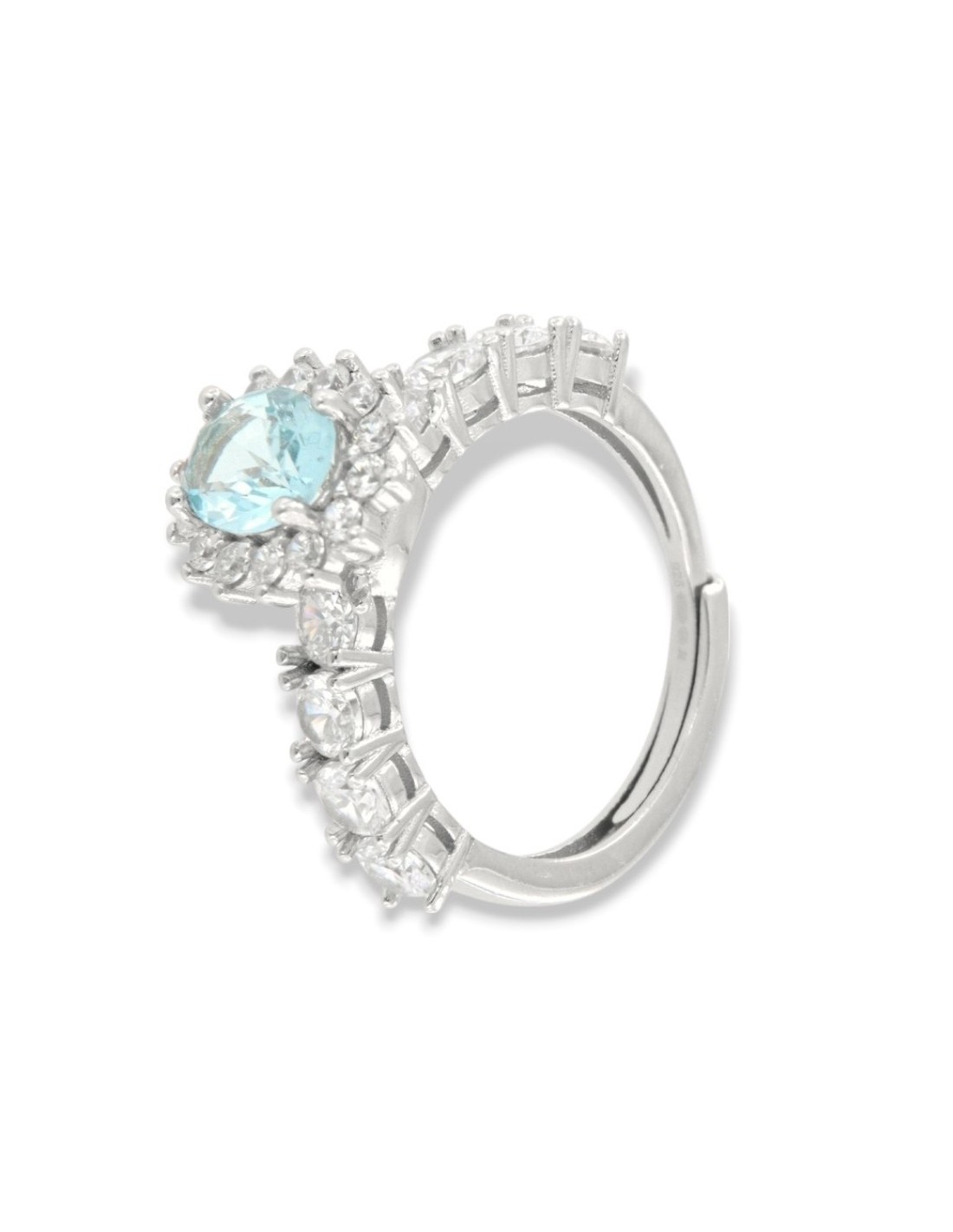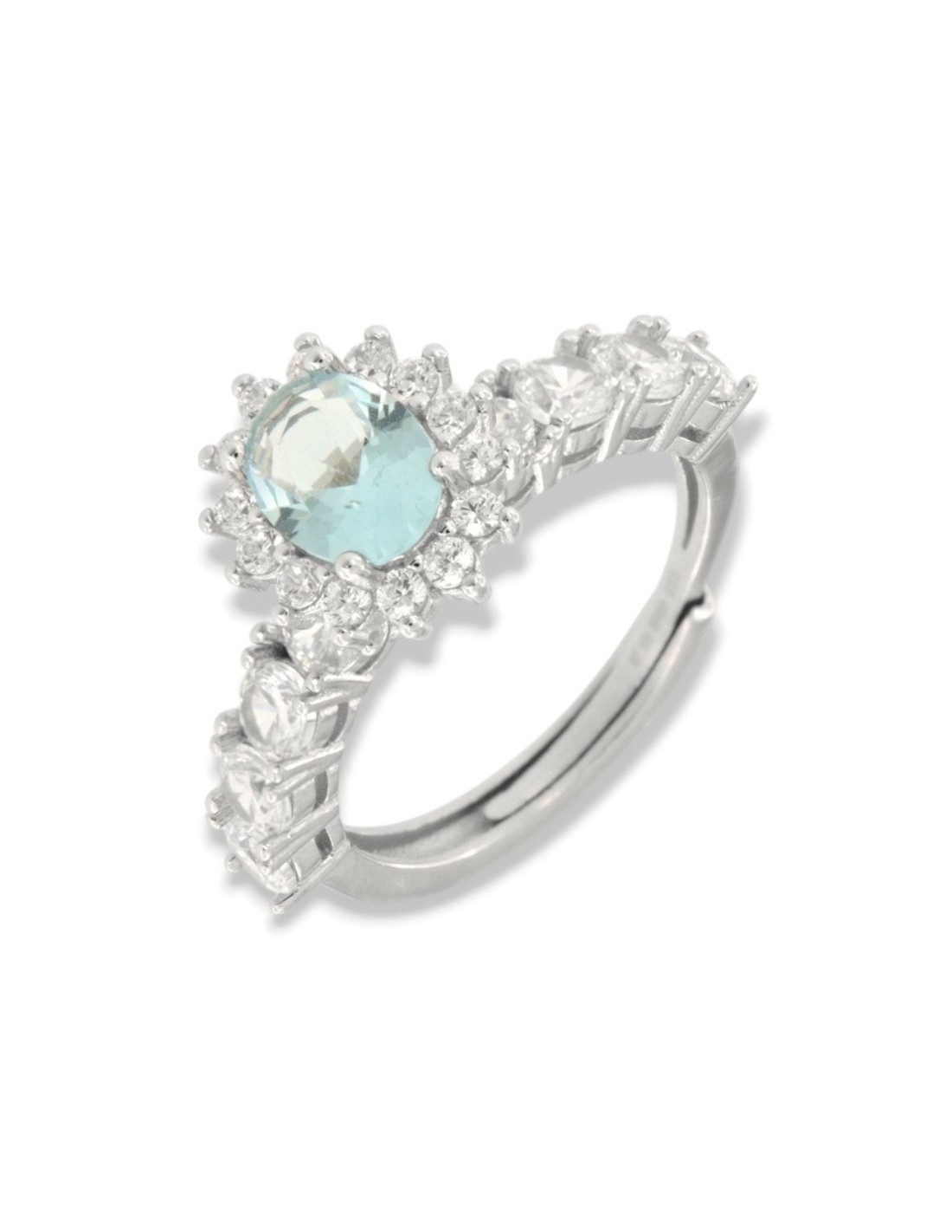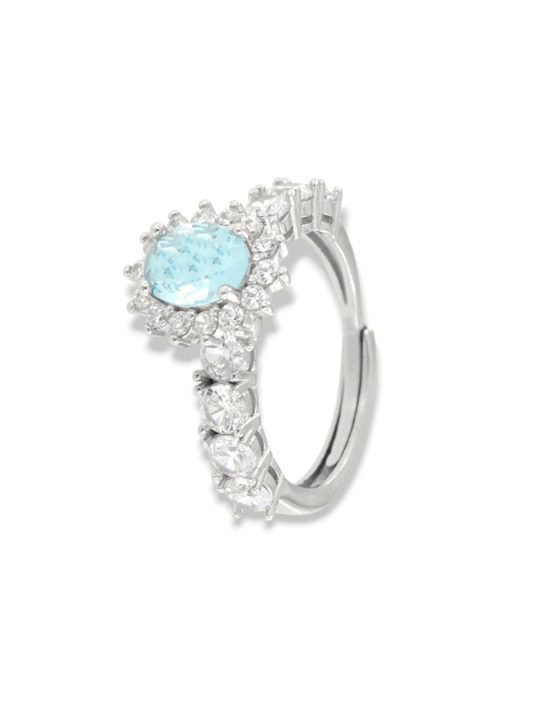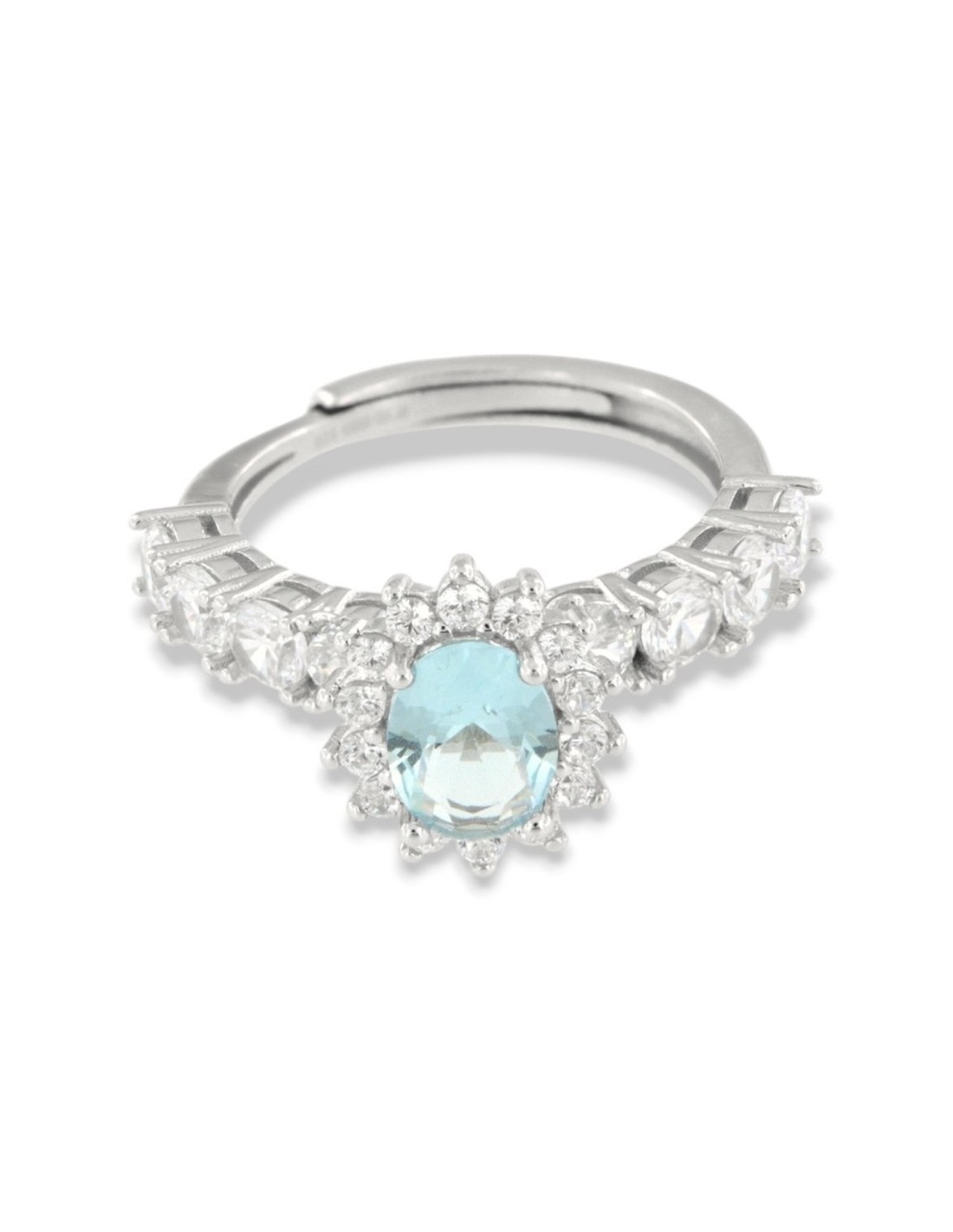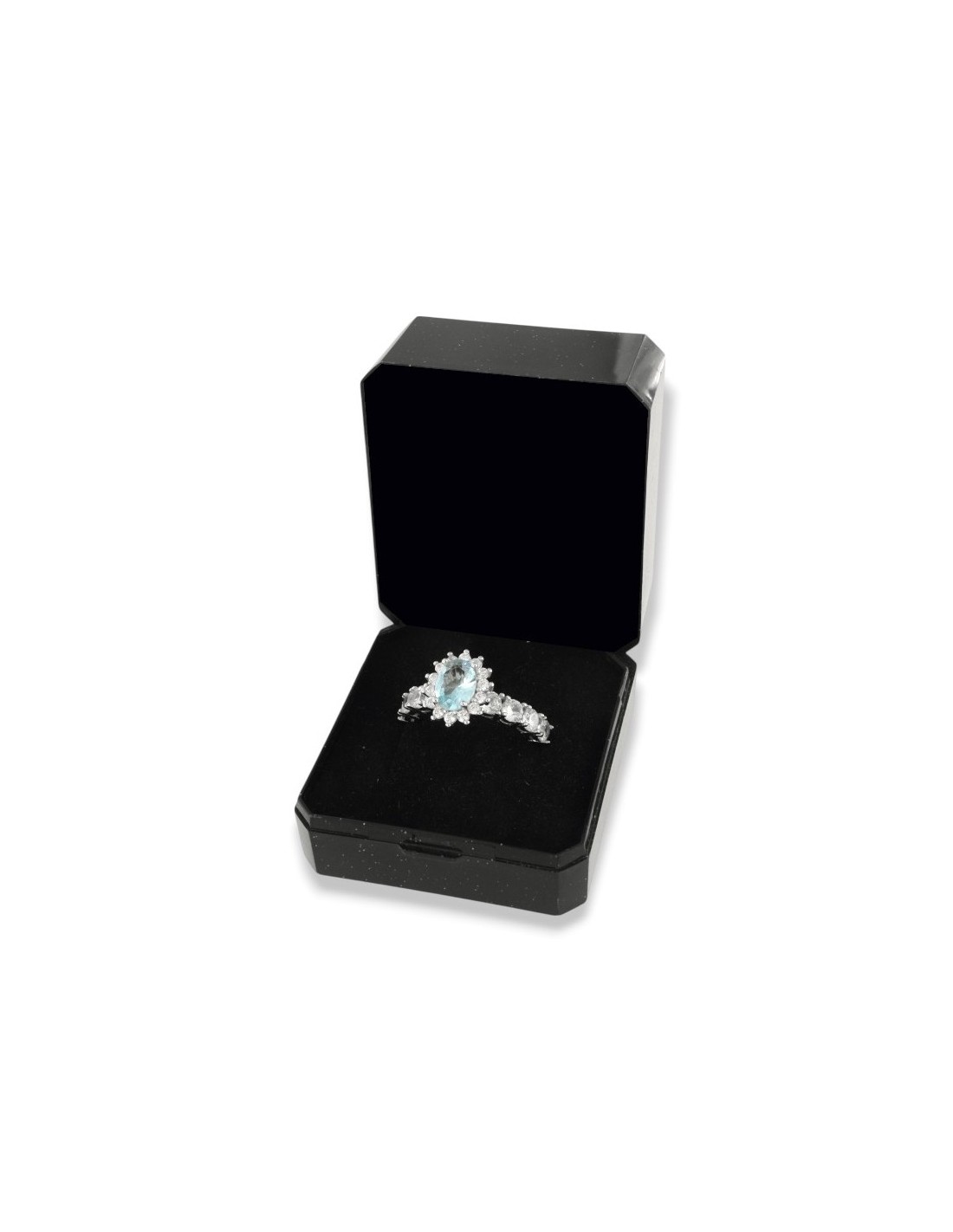 •MATERIALE: l'anello è realizzato interamente in argento 925‰ Rodiato (trattamento brillantante contro l'annerimento) modello Riviera con Principessa, composto da uno Zirconia Cubica o pietra CZ celeste centrale da 8x6 millimetri di diametro, circondata da altre pietre cz bianche con taglio di alta qualità simile al taglio Brillante del Diamante;