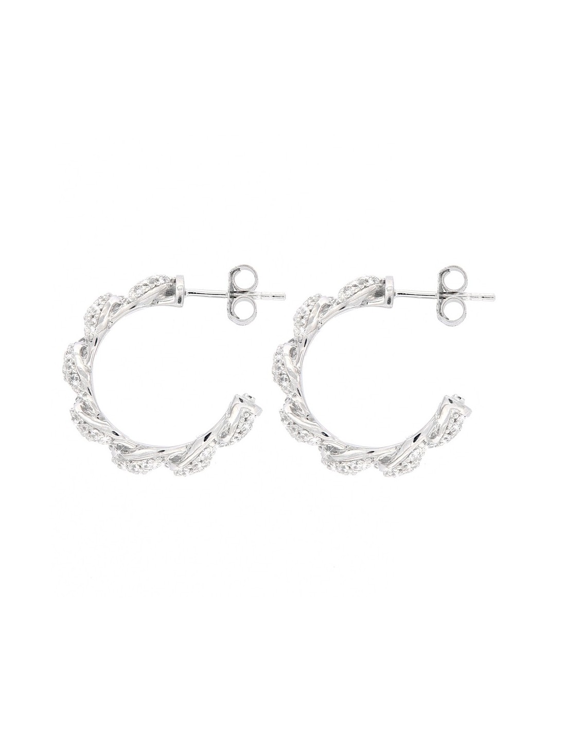 •INCASTONATURA: il montaggio delle pietre CZ sull'orecchino avviene con castoni a 4 griffe (2 punte condivise per pietra) che la serrano in modo permanente;