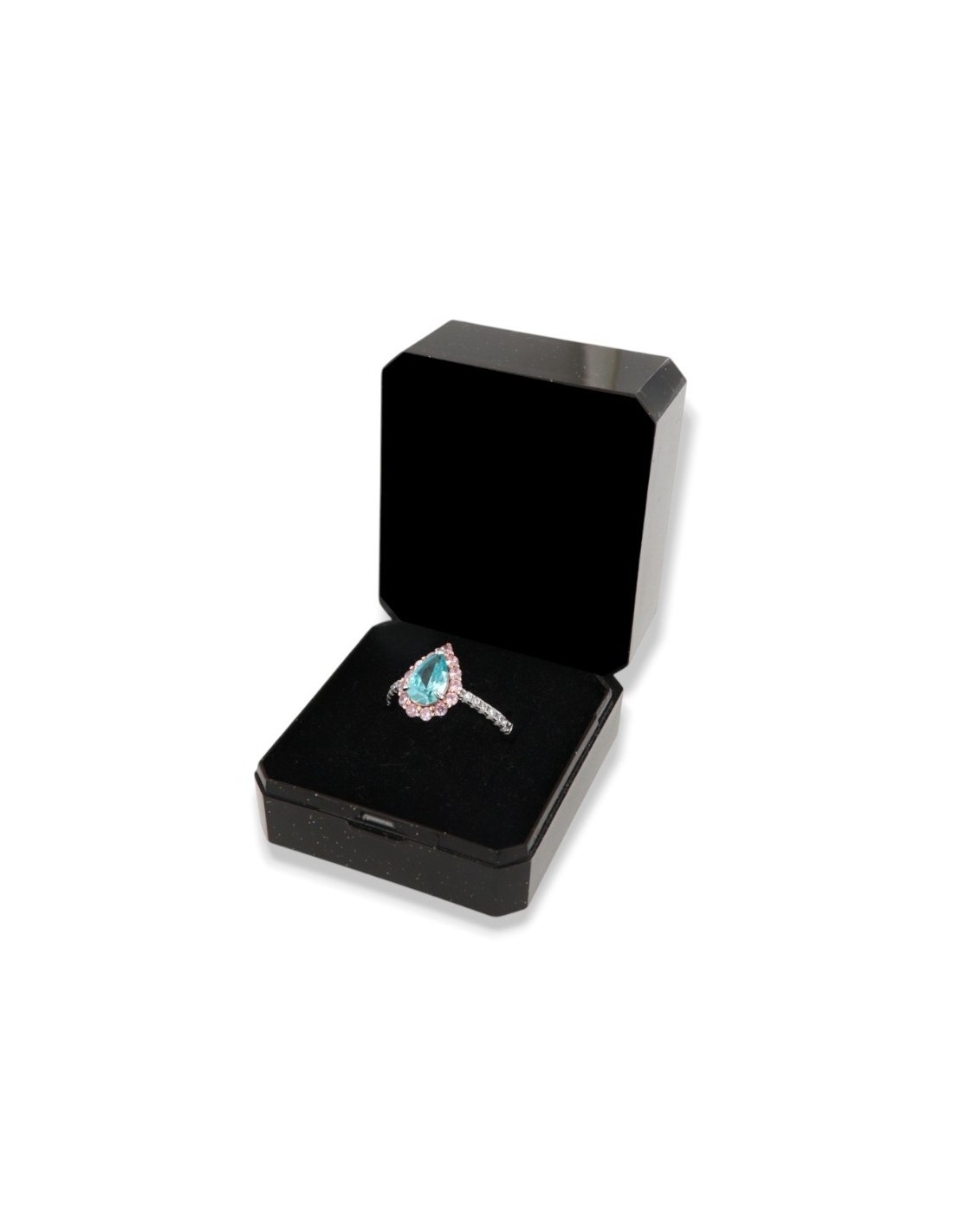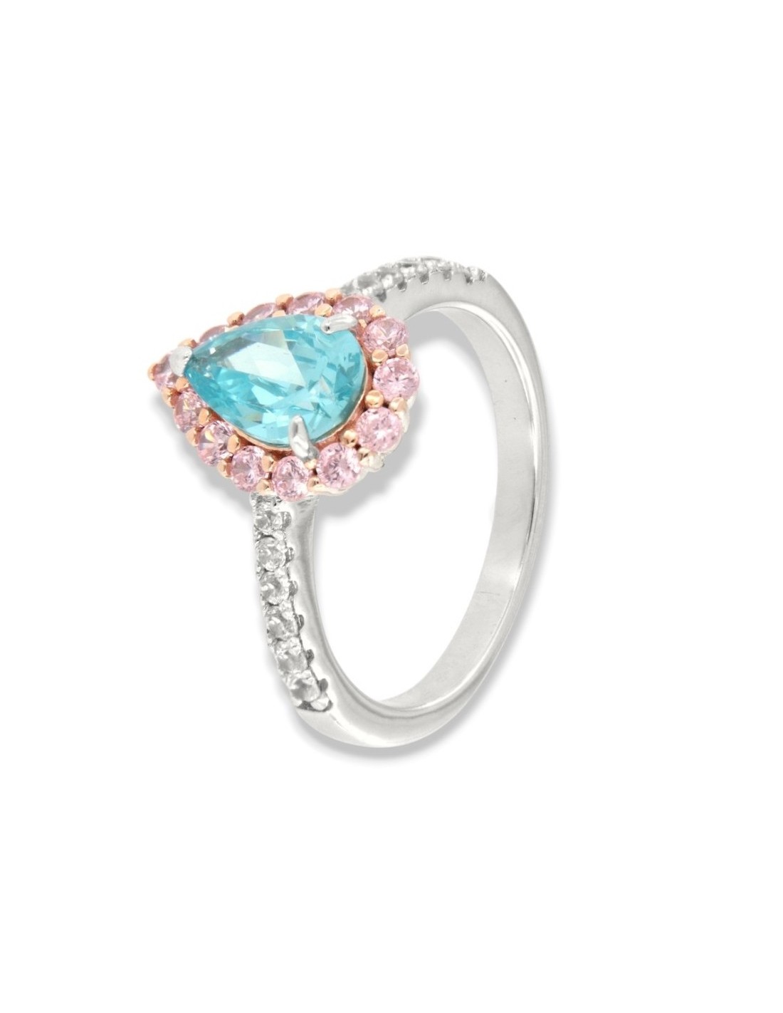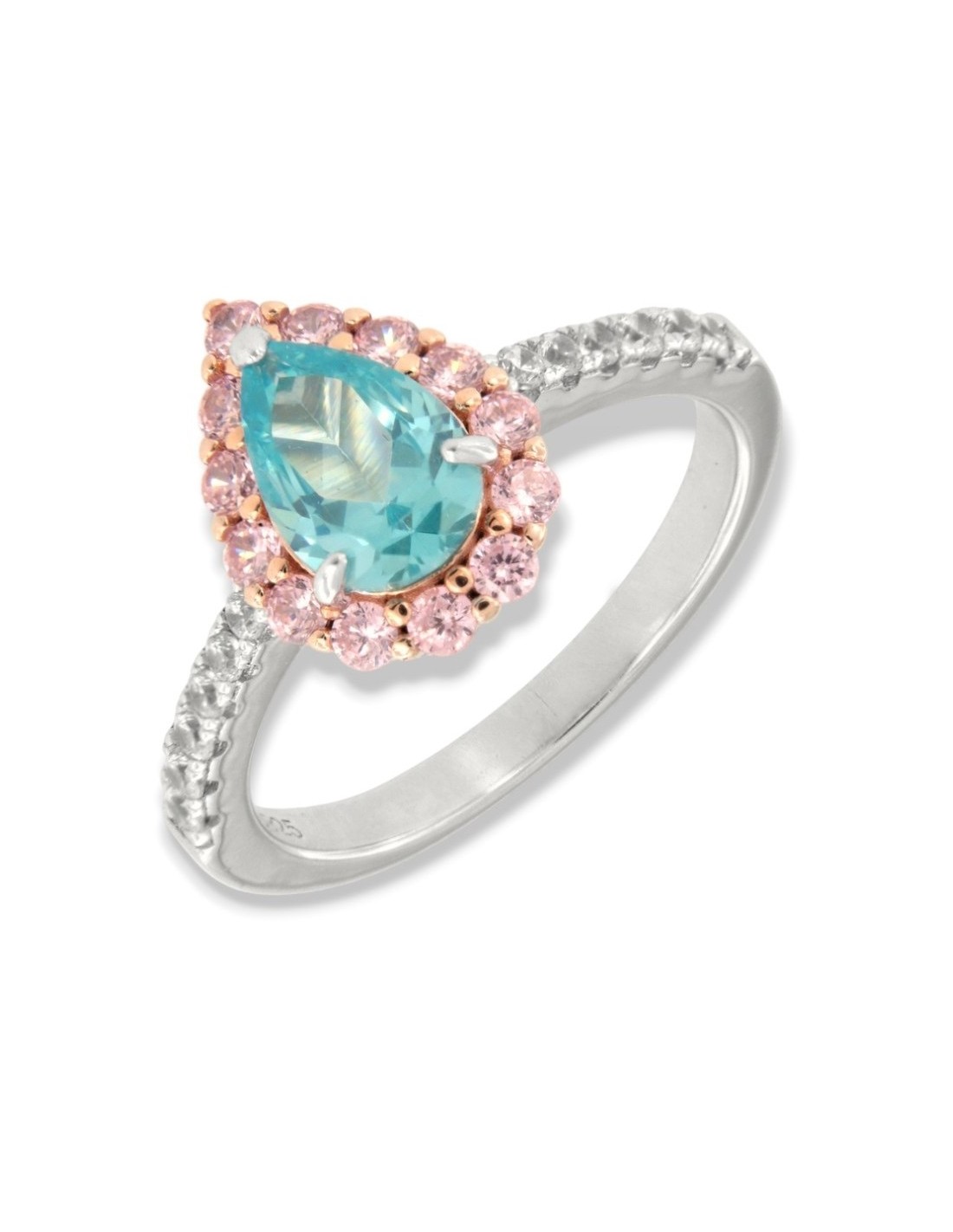 •MATERIALE: l'anello è realizzato interamente in argento 925‰ Rodiato (trattamento brillantante contro l'annerimento) modello principessa composto da uno Zirconia Cubica o pietra CZ celeste taglio goccia, circondata da altre pietre cz rosa con taglio di alta qualità simile al taglio Brillante del Diamante;
