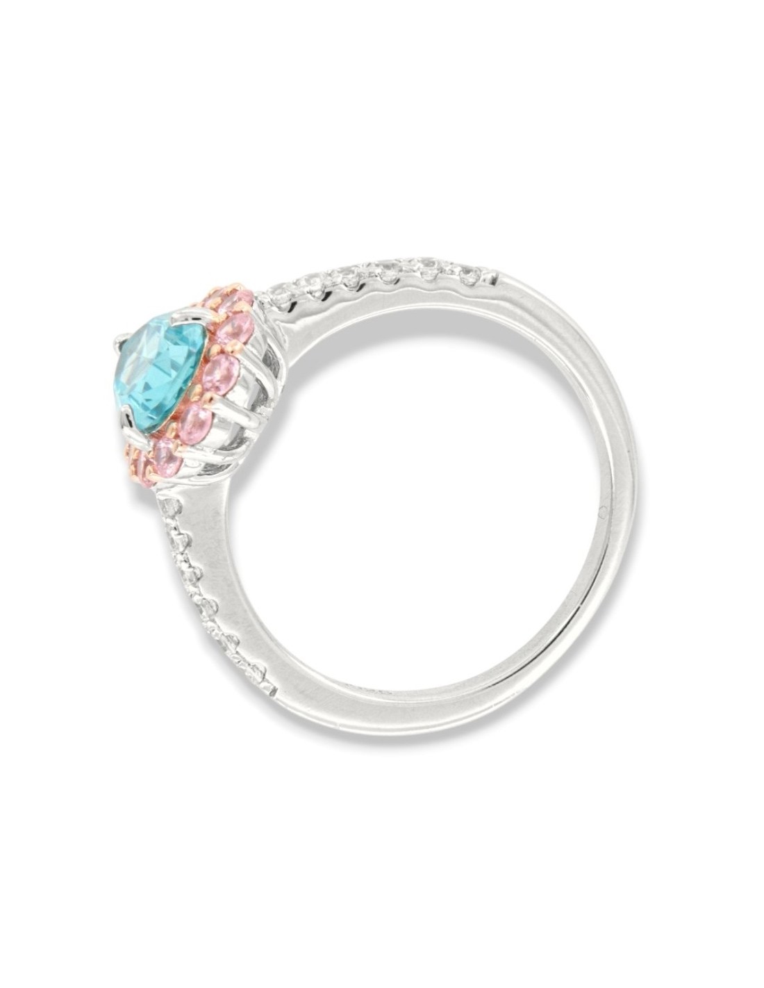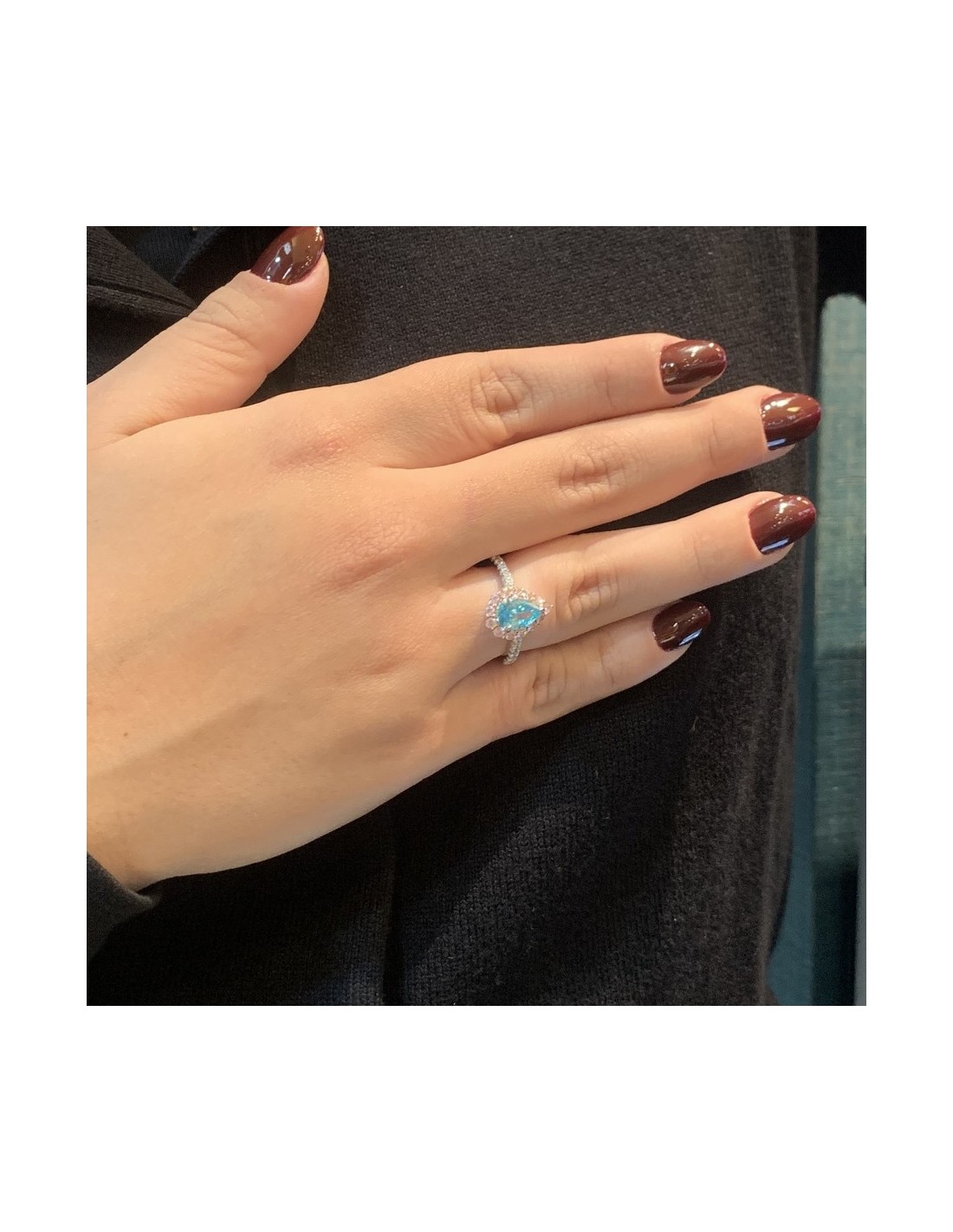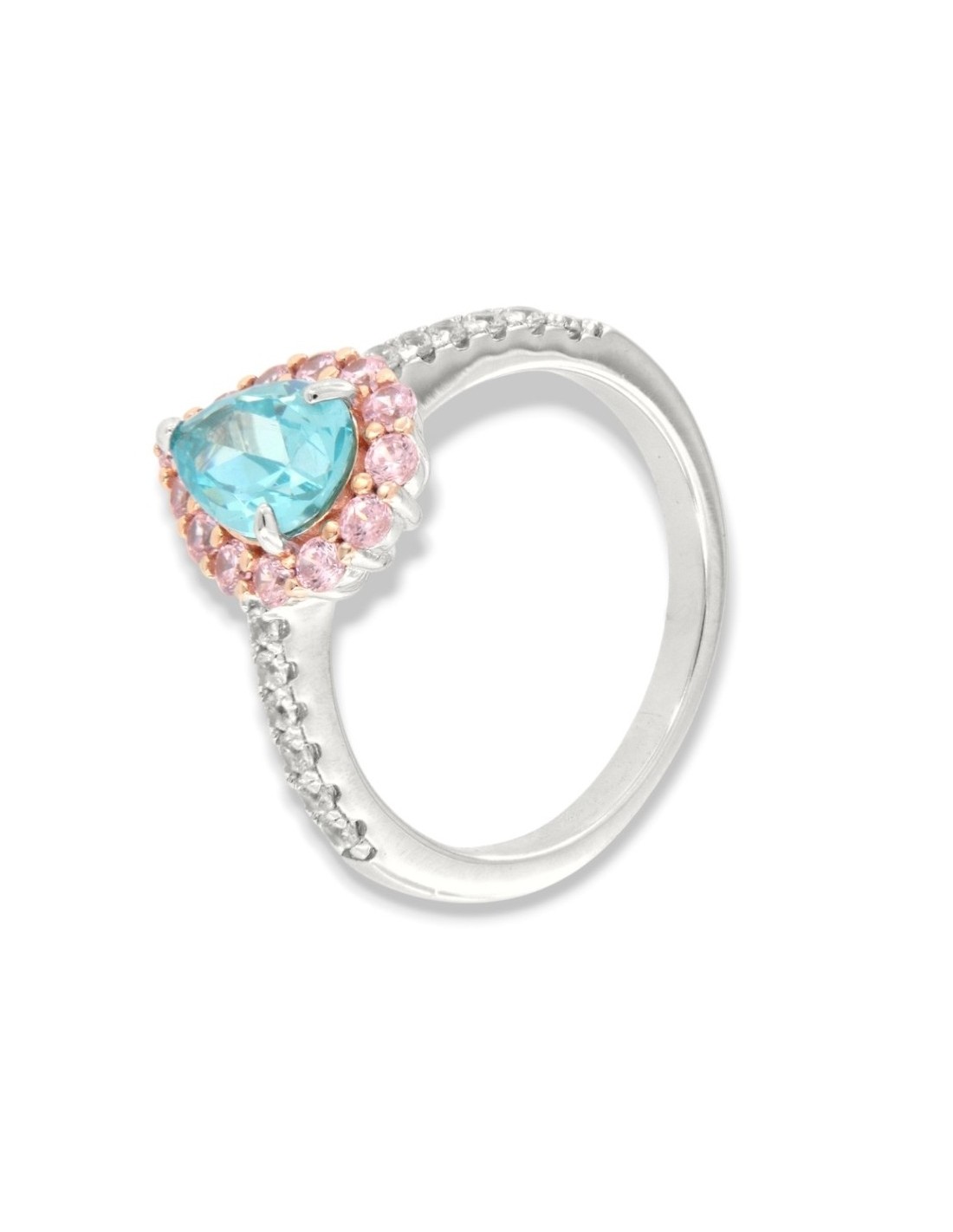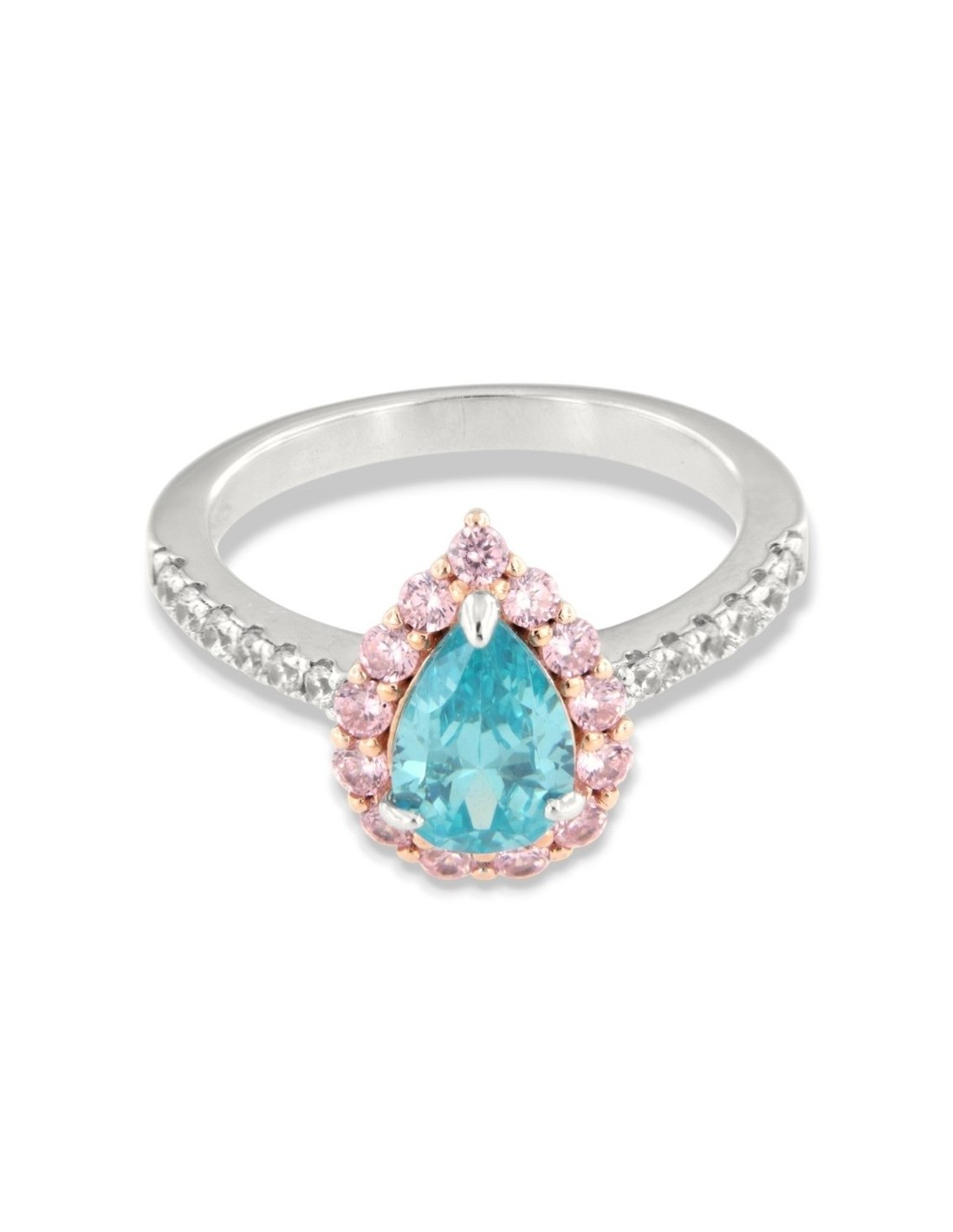 •MATERIALE: l'anello è realizzato interamente in argento 925‰ Rodiato (trattamento brillantante contro l'annerimento) modello principessa composto da uno Zirconia Cubica o pietra CZ celeste taglio goccia, circondata da altre pietre cz rosa con taglio di alta qualità simile al taglio Brillante del Diamante;