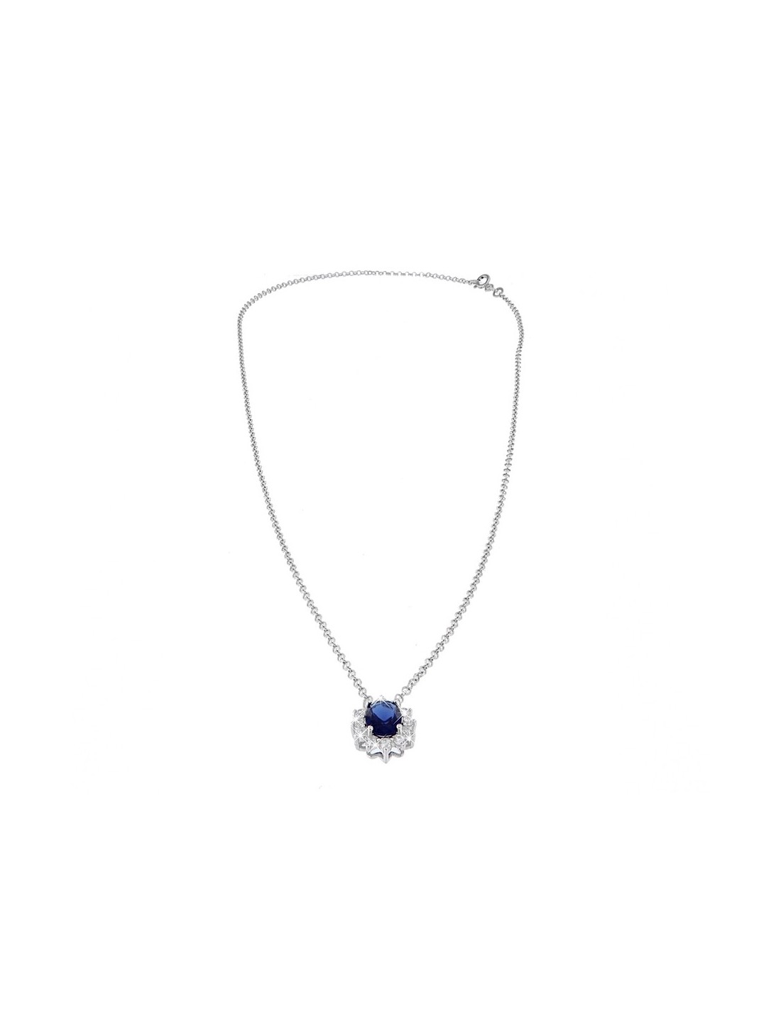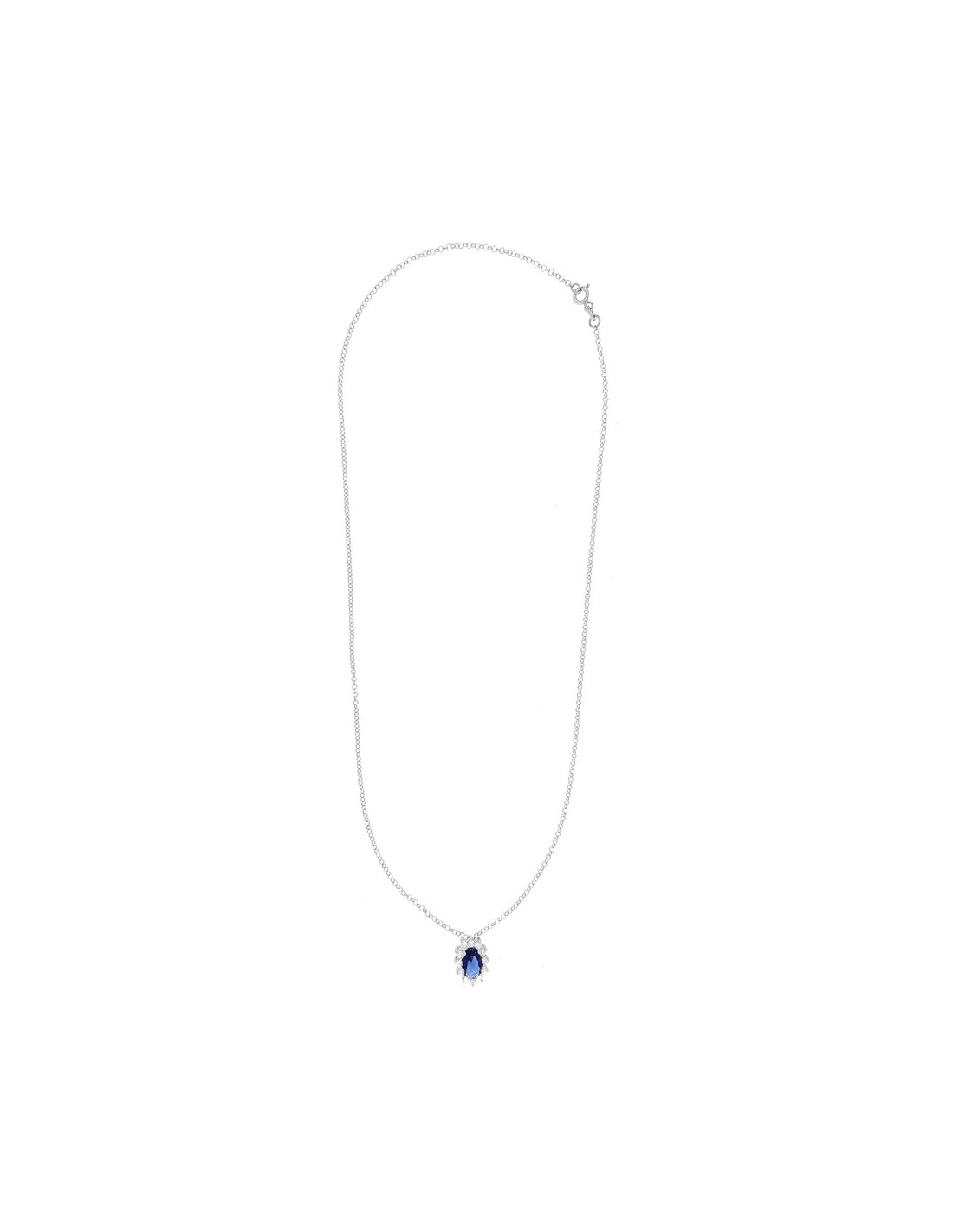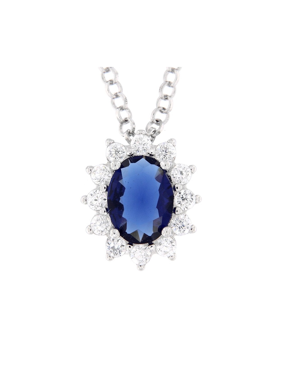 -MATERIALE: la collana è realizzata interamente in argento 925‰ Rodiato (trattamento brillantante contro l'annerimento) modello Principessa con l'applicazione di uno Zirconia Cubica colore Blu taglio Ovale misura 8x6 millimetri con un cotorno di 12 Zirconia Cubica o CZ bianchi da 2 millimetri di diametro con taglio di alta qualità simile al taglio Brillante del Diamante;