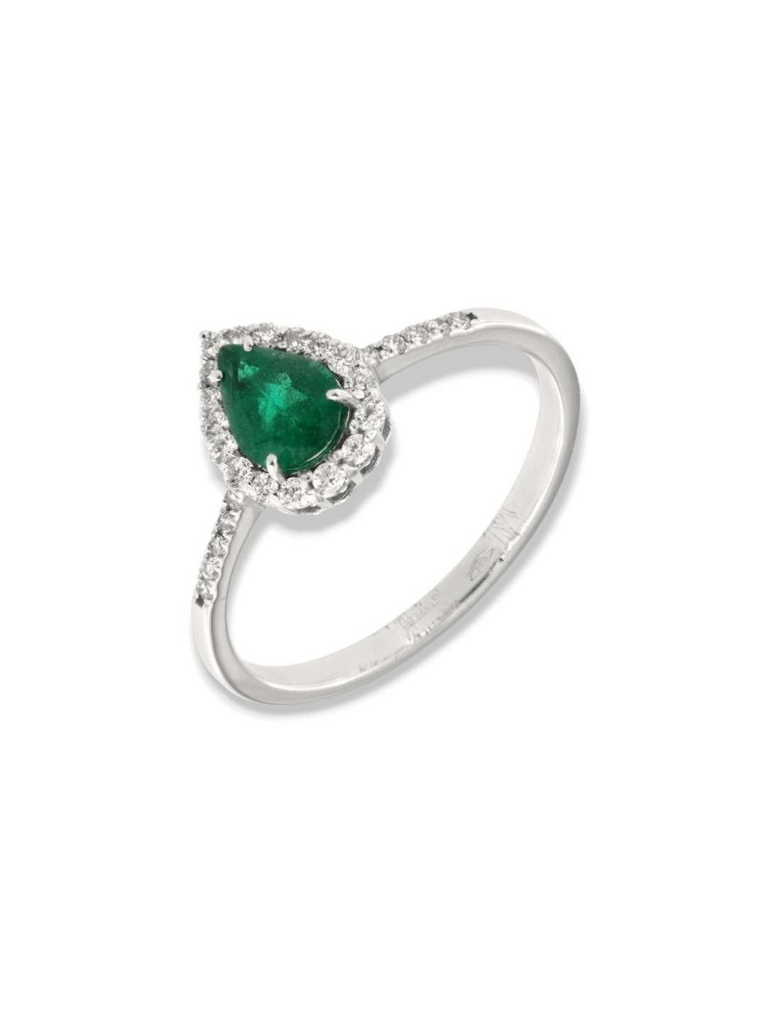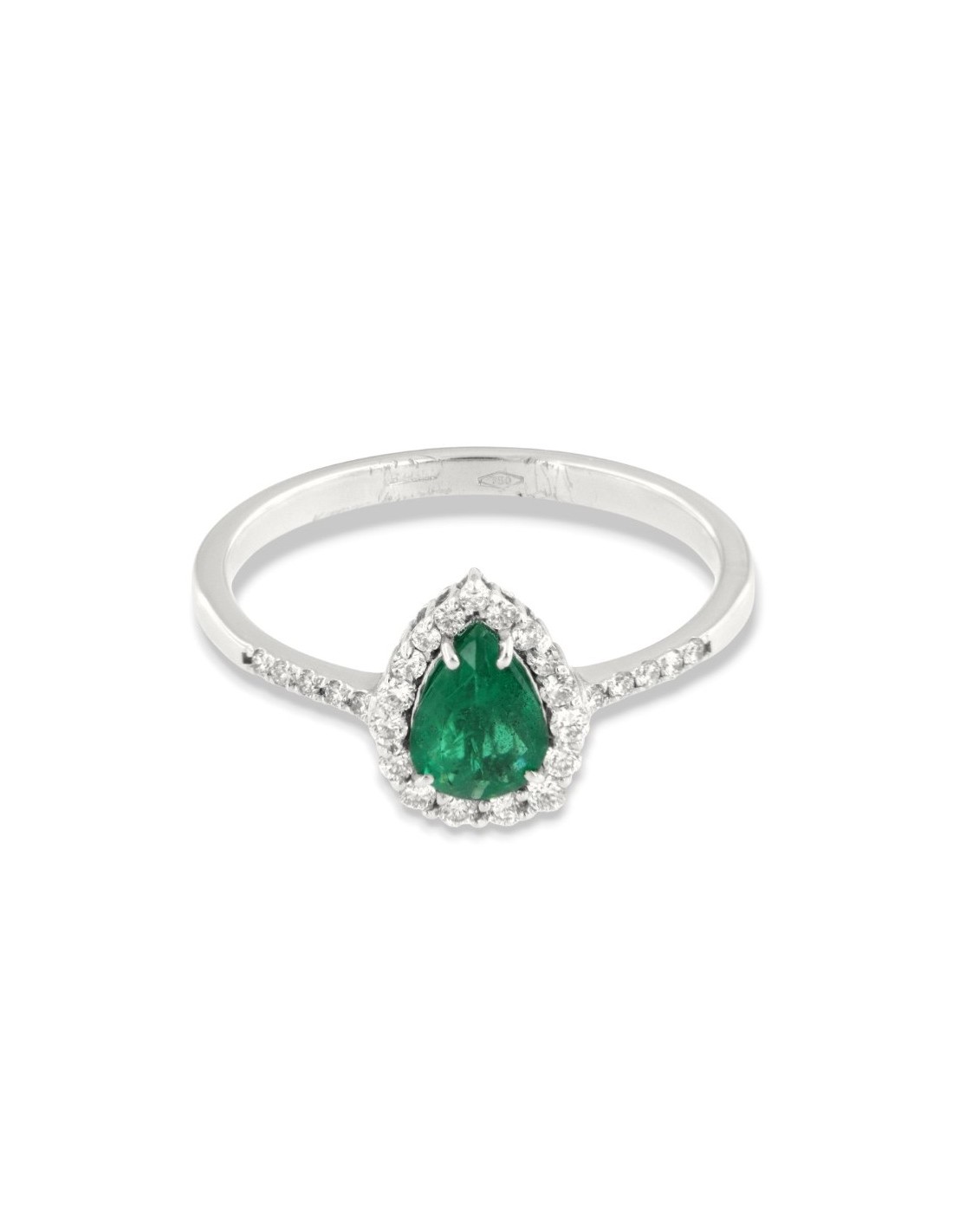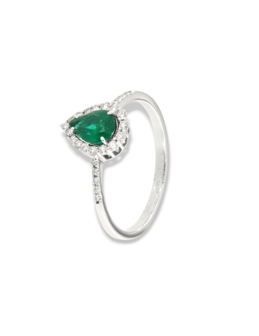 •MATERIALE: l'anello è realizzato interamente in oro Bianco 750‰ (18 Carati) caratterizzato dall'applicazione di uno smeraldo taglio goccia da 0,59 Carati, circondato da una corona di 27 Diamanti taglio Rotondo Brillante, che proseguono anche sul gambo, dalla caratura complessiva di 0,267 Carati;