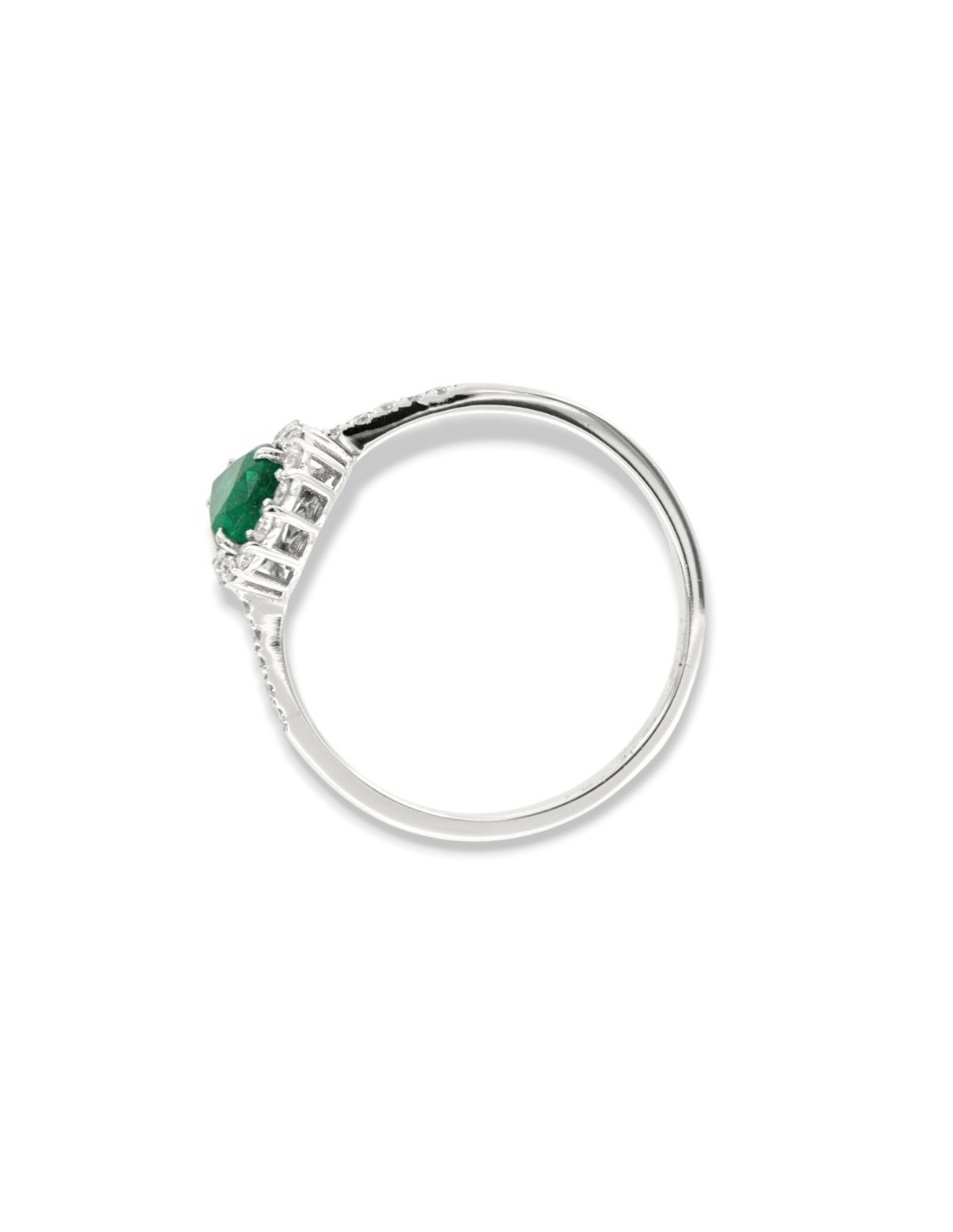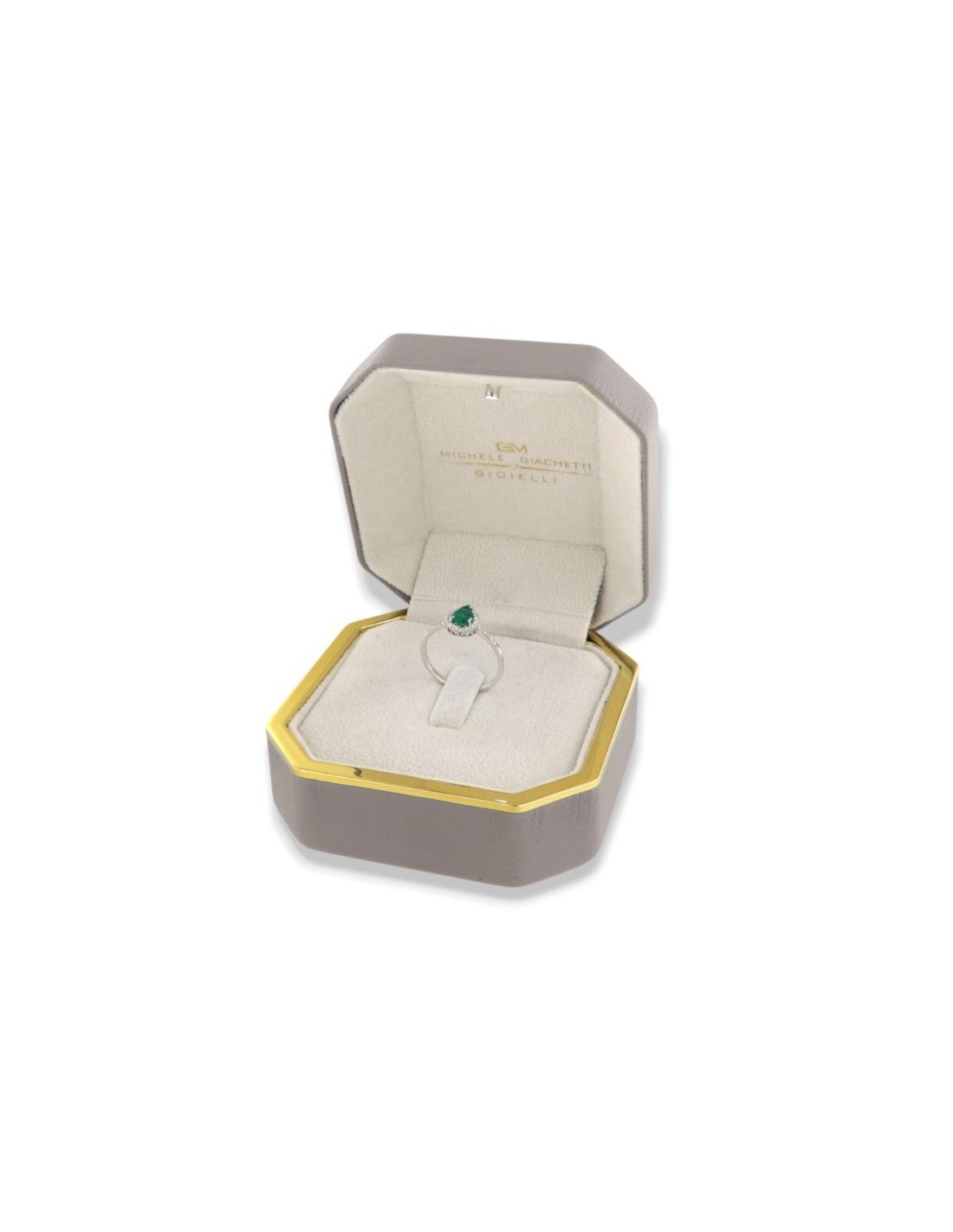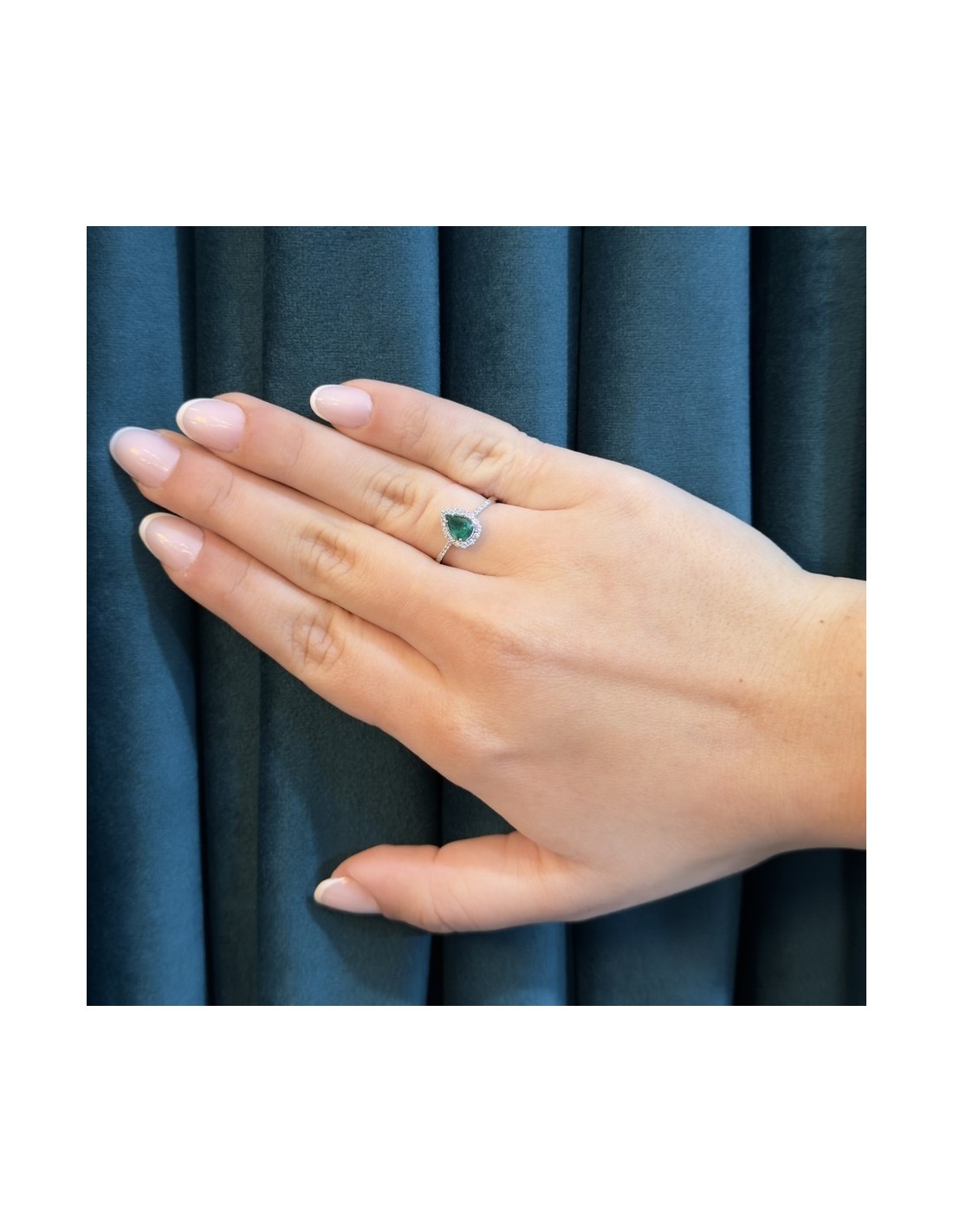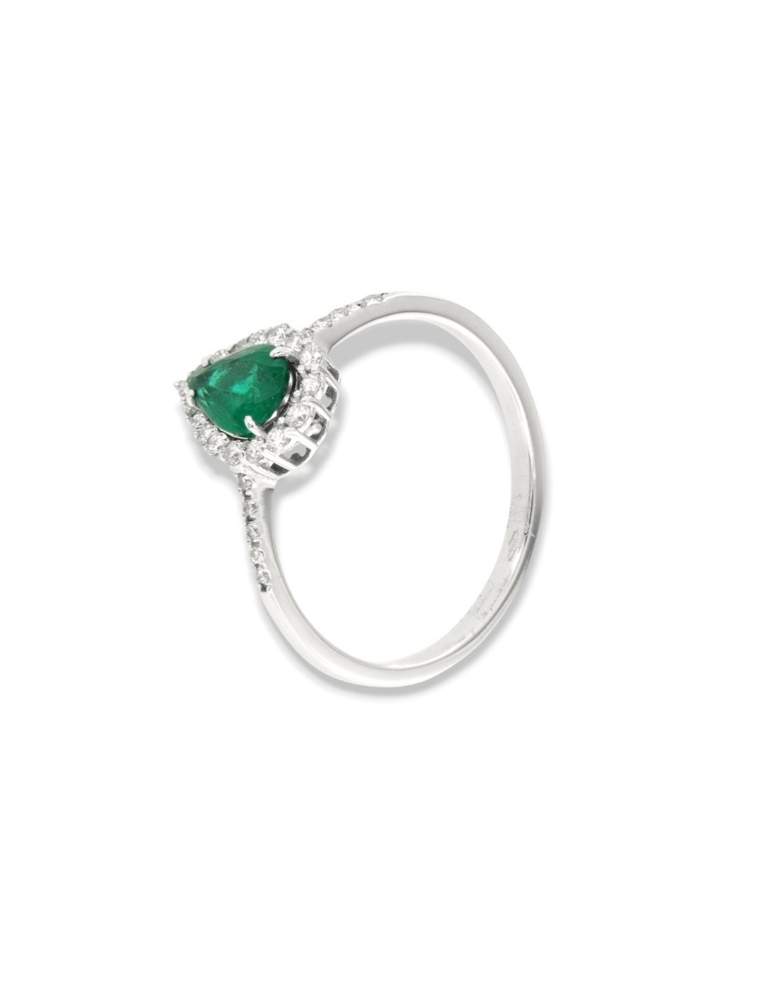 •MATERIALE: l'anello è realizzato interamente in oro Bianco 750‰ (18 Carati) caratterizzato dall'applicazione di uno smeraldo taglio goccia da 0,59 Carati, circondato da una corona di 27 Diamanti taglio Rotondo Brillante, che proseguono anche sul gambo, dalla caratura complessiva di 0,267 Carati;