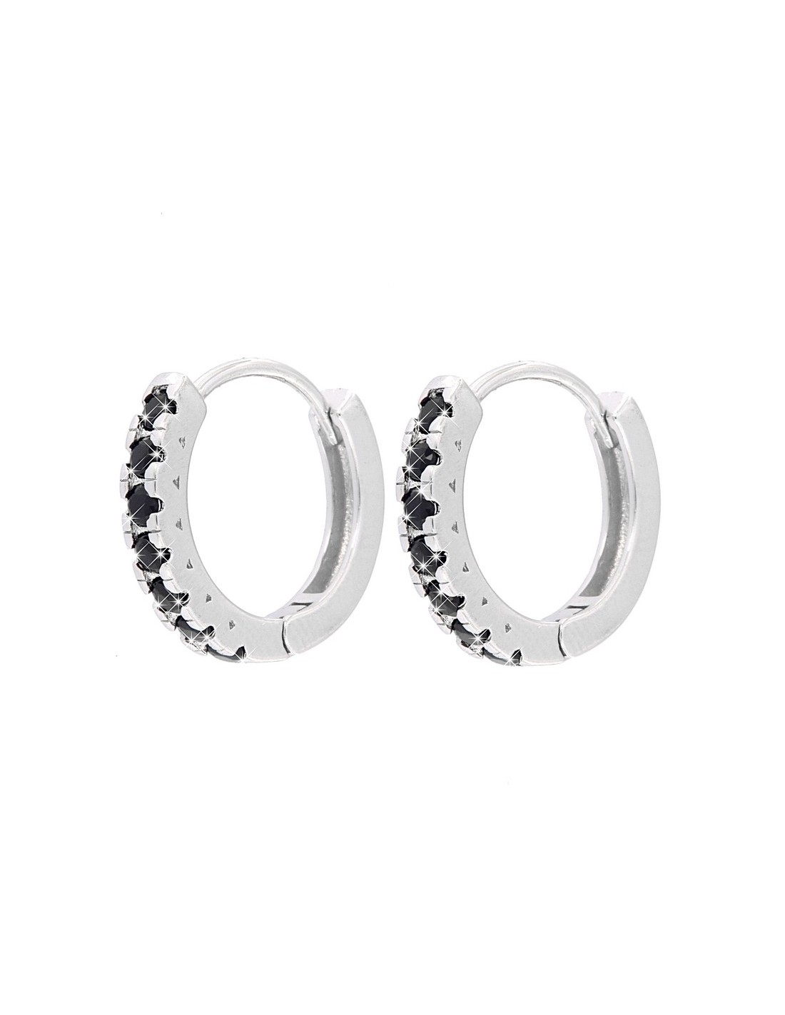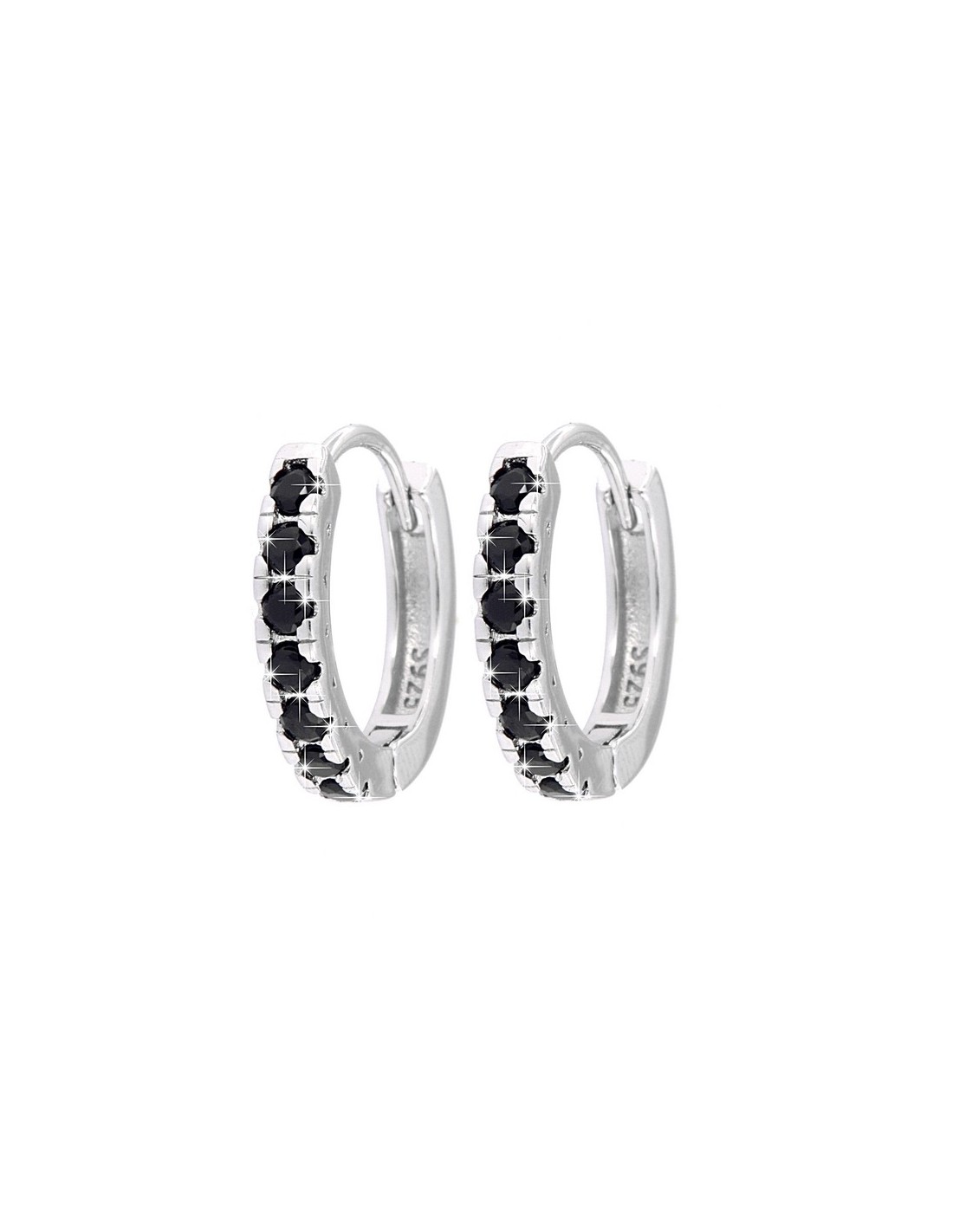 •MATERIALE: gli orecchini sono realizzati interamente in argento anallergico 925‰ Rodiato (trattamento brillantante contro l'annerimento) modello a cerchio liscio lucido con 7 Zirconi neri, con chiusura a scatto;
