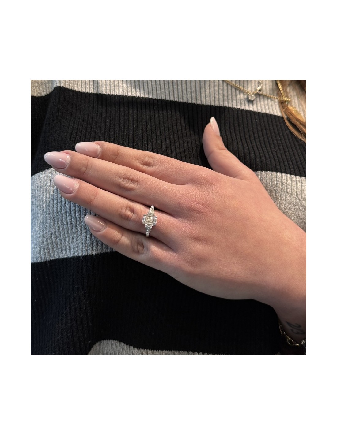 •INCASTONATURA: il montaggio delle pietre CZ sull'anello avviene con castoni a 4 griffe (2 punte condivise per pietra) che la serrano in modo permanente;