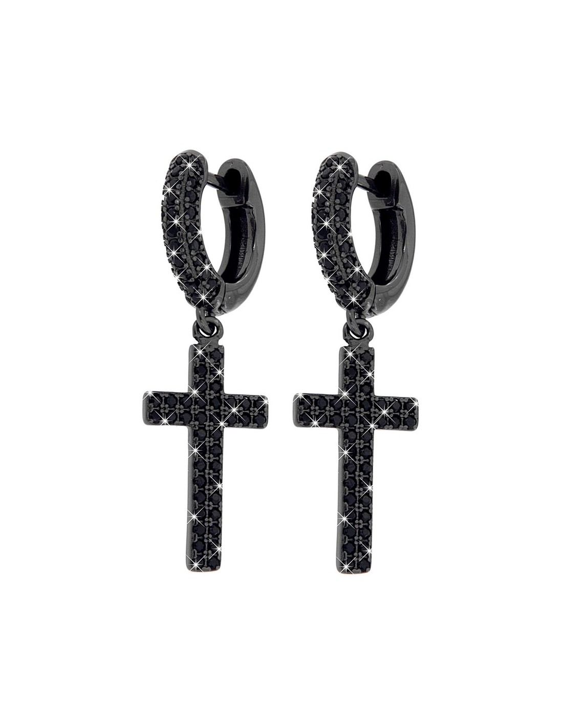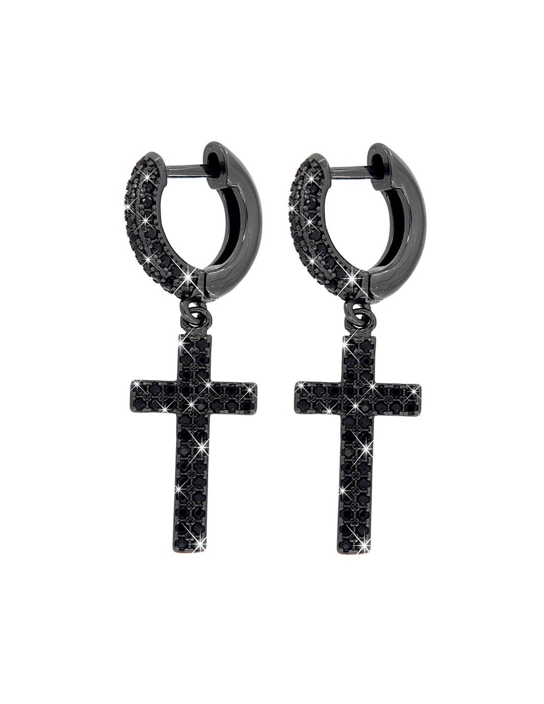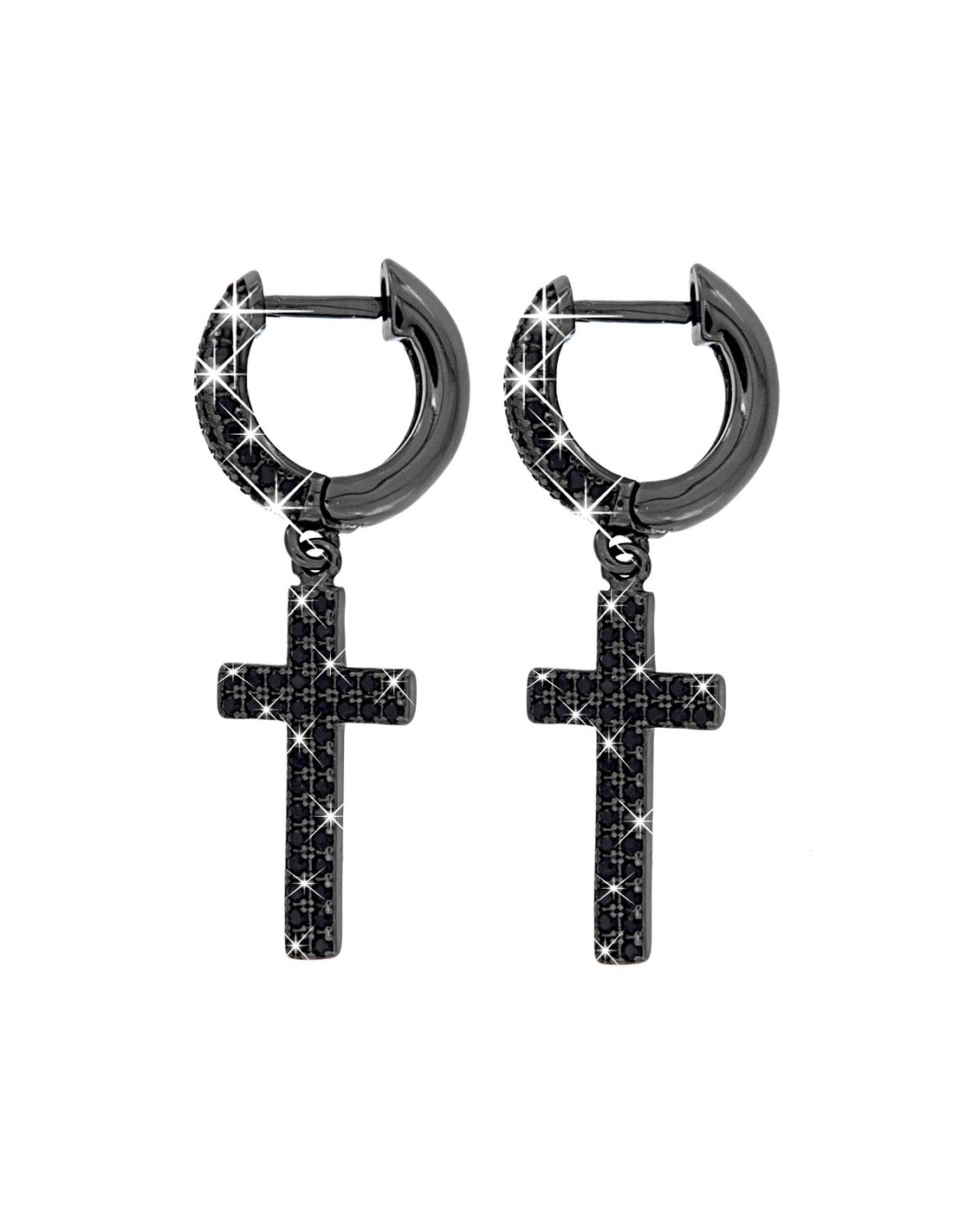 •MATERIALE: gli orecchini sono realizzati interamente in argento anallergico 925‰ Rodiato (trattamento brillantante contro l'annerimento) modello a cerchio di colore nero, con pendente a forma di croce sempre nero, il tutto accompagnato da zirconi neri;