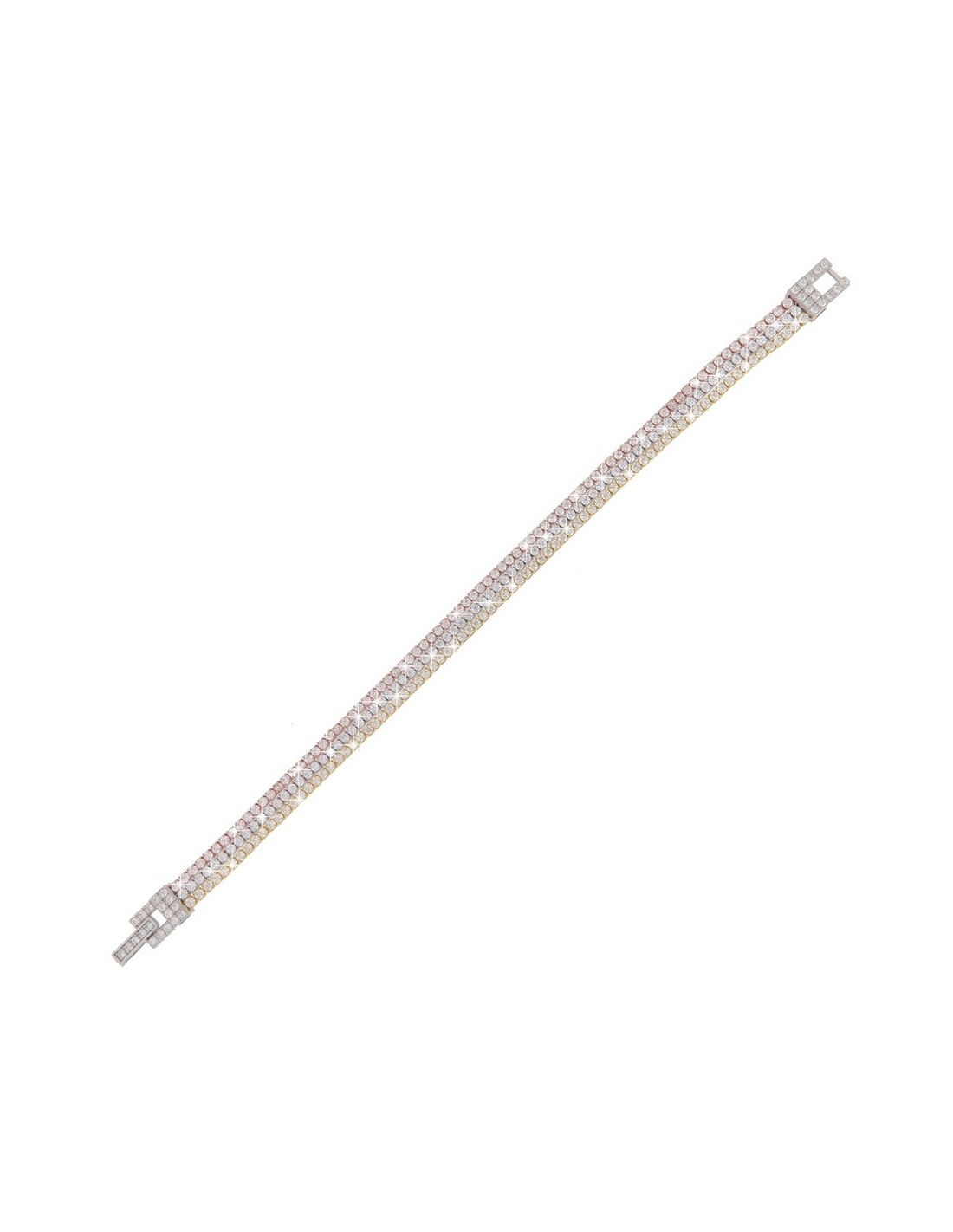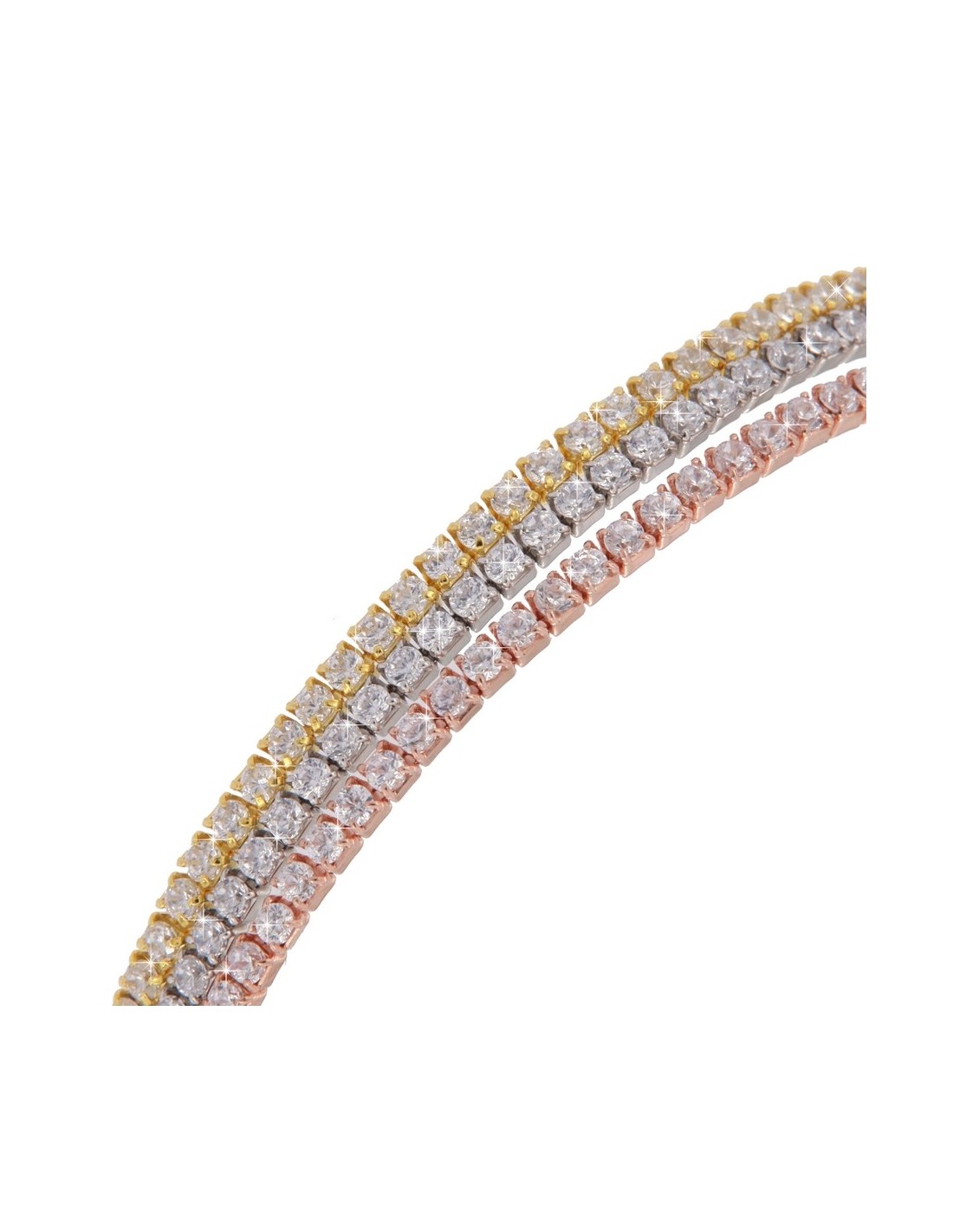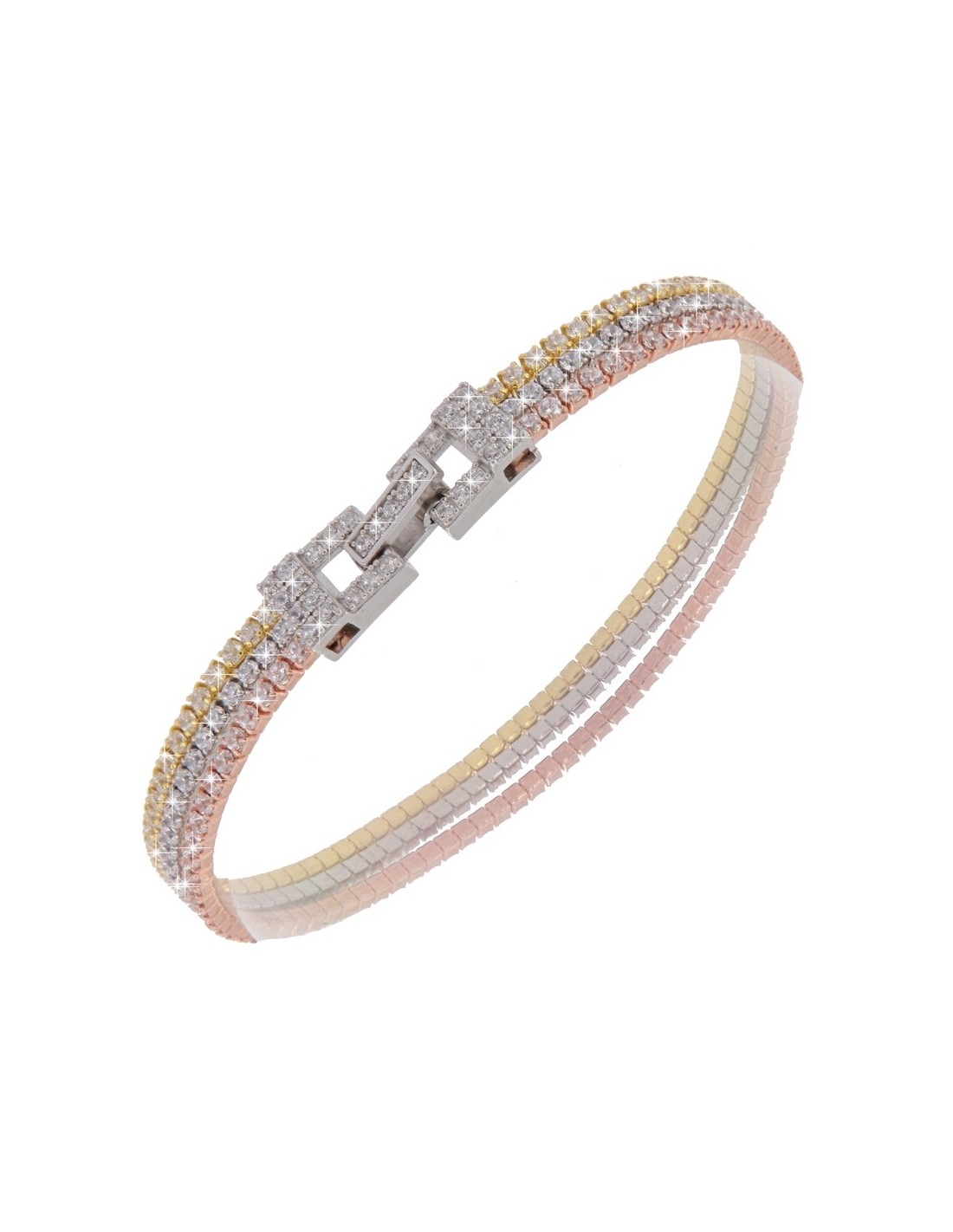 •MATERIALE: il bracciale è realizzato interamente in argento 925‰ Rodiato (trattamento brillantante contro l'annerimento) composto da tre file zirconate, la prima placcata in argento rosato,quella centrale in argento rodiato e l'ultima in argento dorato;