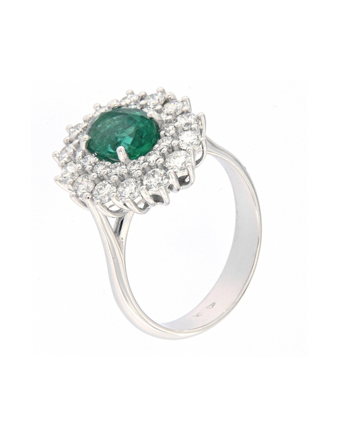 •MATERIALE: l'anello è realizzato interamente in oro bianco 750‰ (18 Carati) modello Principessa con l'applicazione di uno Smeraldo taglio Ovale misura 8x6 millimetri e peso 1,43 Carati nella parte centrale con un doppio cotorno di 28 Diamanti Taglio Brillante Rotondo, Colore D-F del peso complessivo di 1,16 Carati;