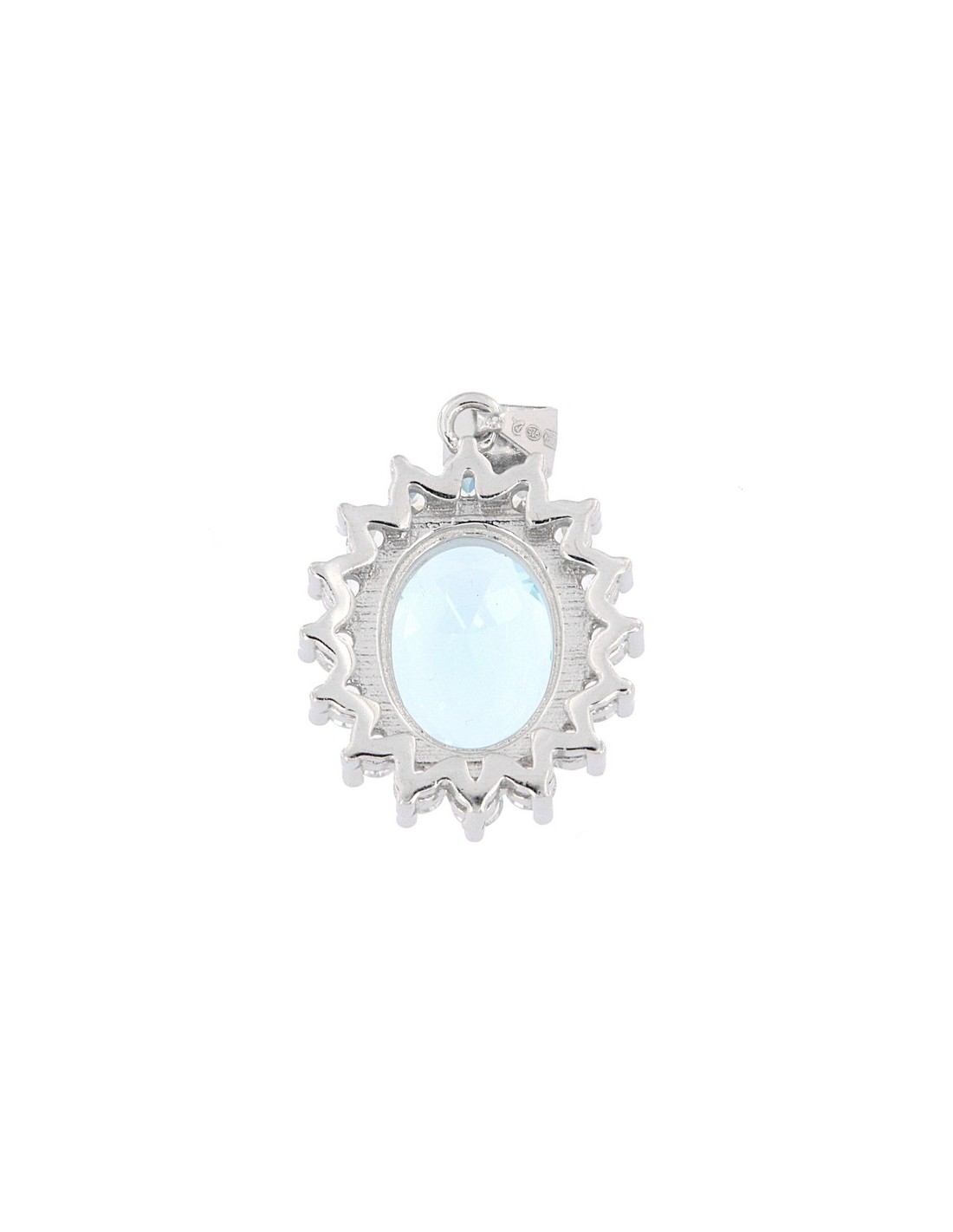 -MATERIALE: Il ciondolo è realizzato interamente in argento 925‰ Rodiato (trattamento brillantante contro l'annerimento) modello Principessa con l'applicazione di uno Zirconia Cubica colore celeste taglio ovale misura 11x9 millimetri con un cotorno di 16 Zirconia Cubica o CZ bianchi da 2 millimetri di diametro con taglio di alta qualità simile al taglio Brillante del Diamante;