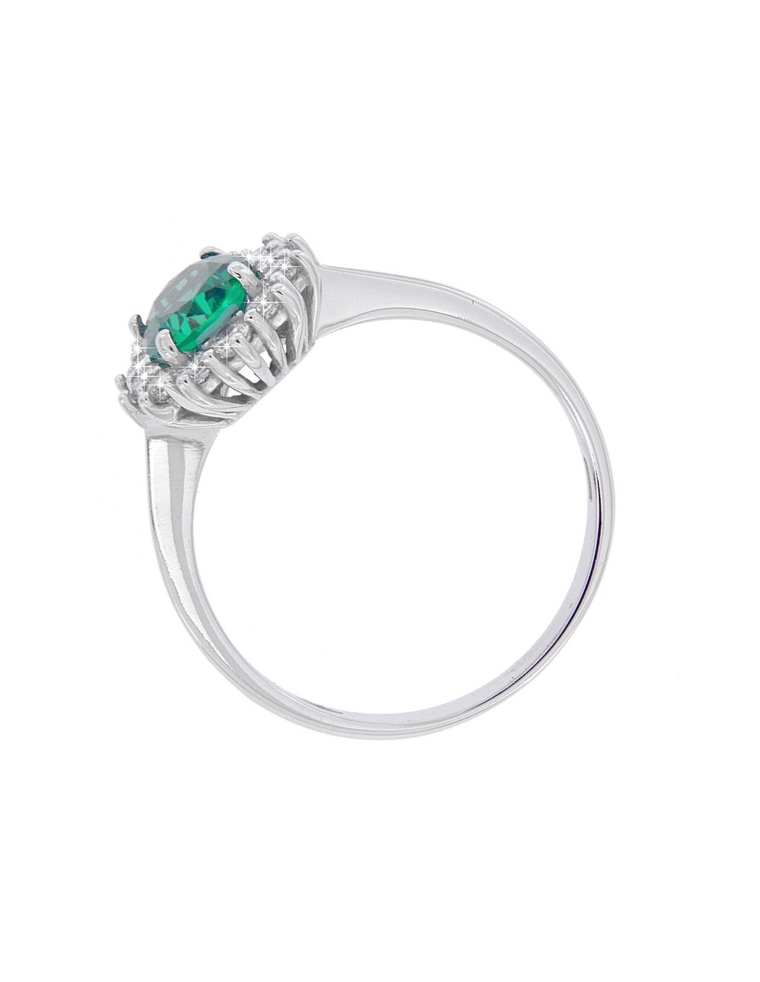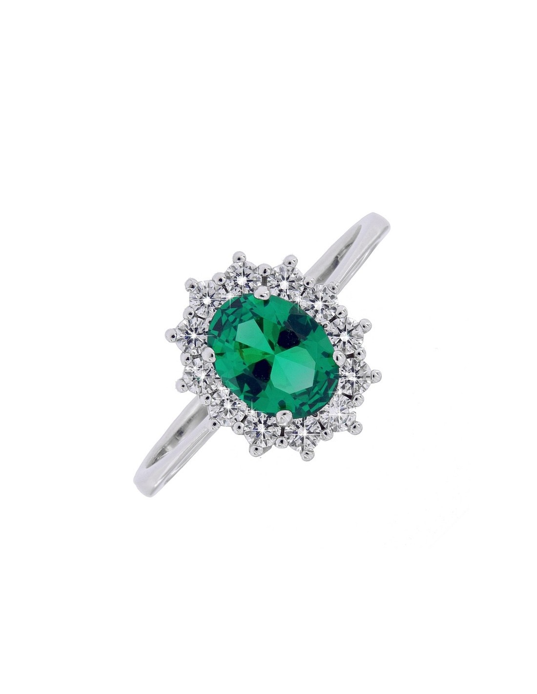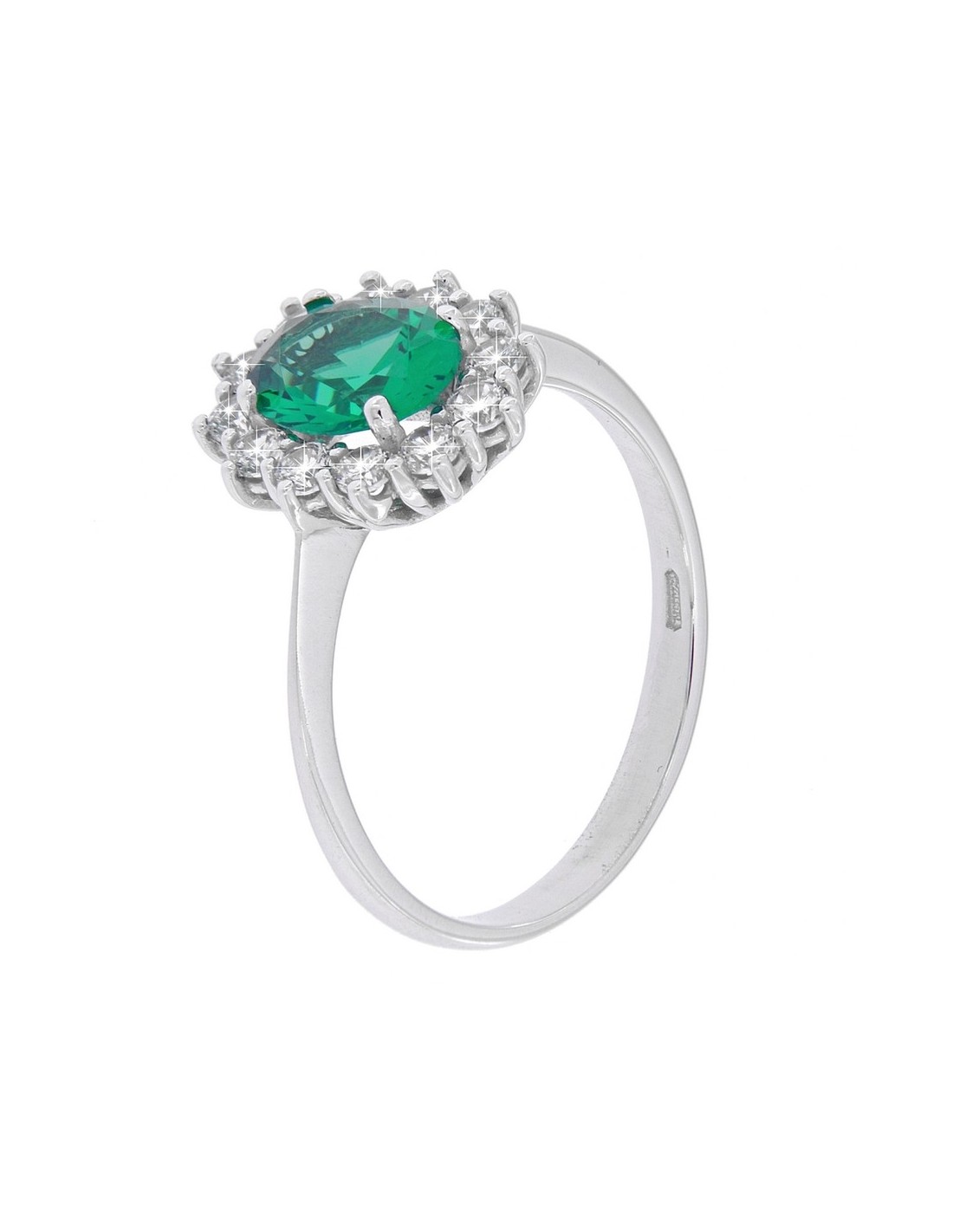 •MATERIALE: l'anello è realizzato interamente in oro bianco 750‰ (18 Carati) modello Principessa con l'applicazione di uno Zircone Verde taglio ovale misura 8x6 millimetri e con un cotorno di 12 Zirconia Cubica o CZ bianchi da 2 millimetri di diametro con taglio di alta qualità simile al taglio Brillante del Diamante;