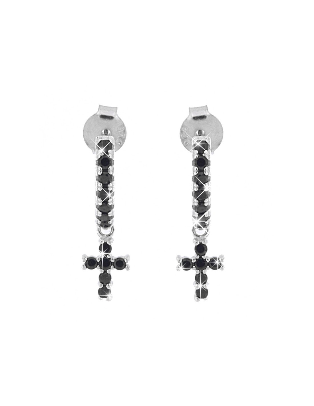 •MATERIALE: gli orecchini sono realizzati interamente in argento anallergico 925‰ Rodiato (trattamento brillantante contro l'annerimento) modello a semi cerchio con chiusura a farfalla con Zirconia Cubica o CZ neri con taglio di alta qualità simile al taglio Brillante del Diamante con ciondolo pendente per ciascun cerchio, a forma di croce pavettato interamente in argento 925‰ Rodiato (trattamento brillante contro l'annerimento) con Zirconia Cubica o CZ di colore neri;