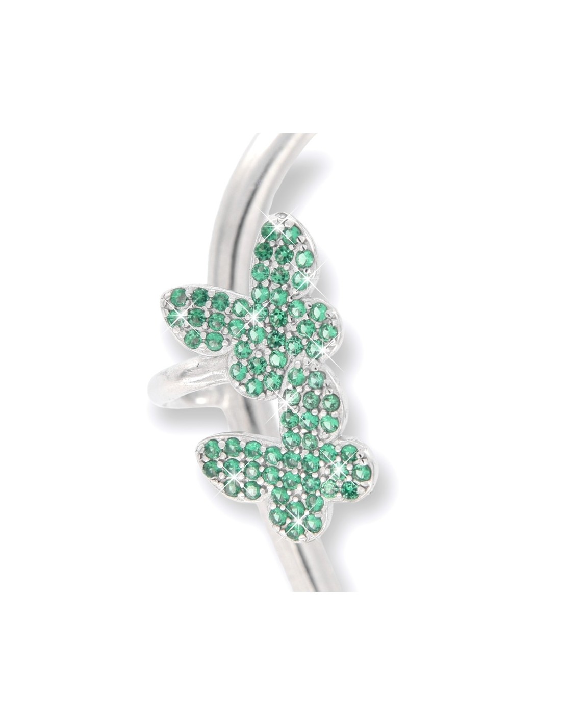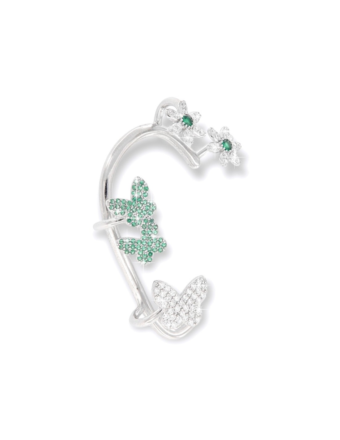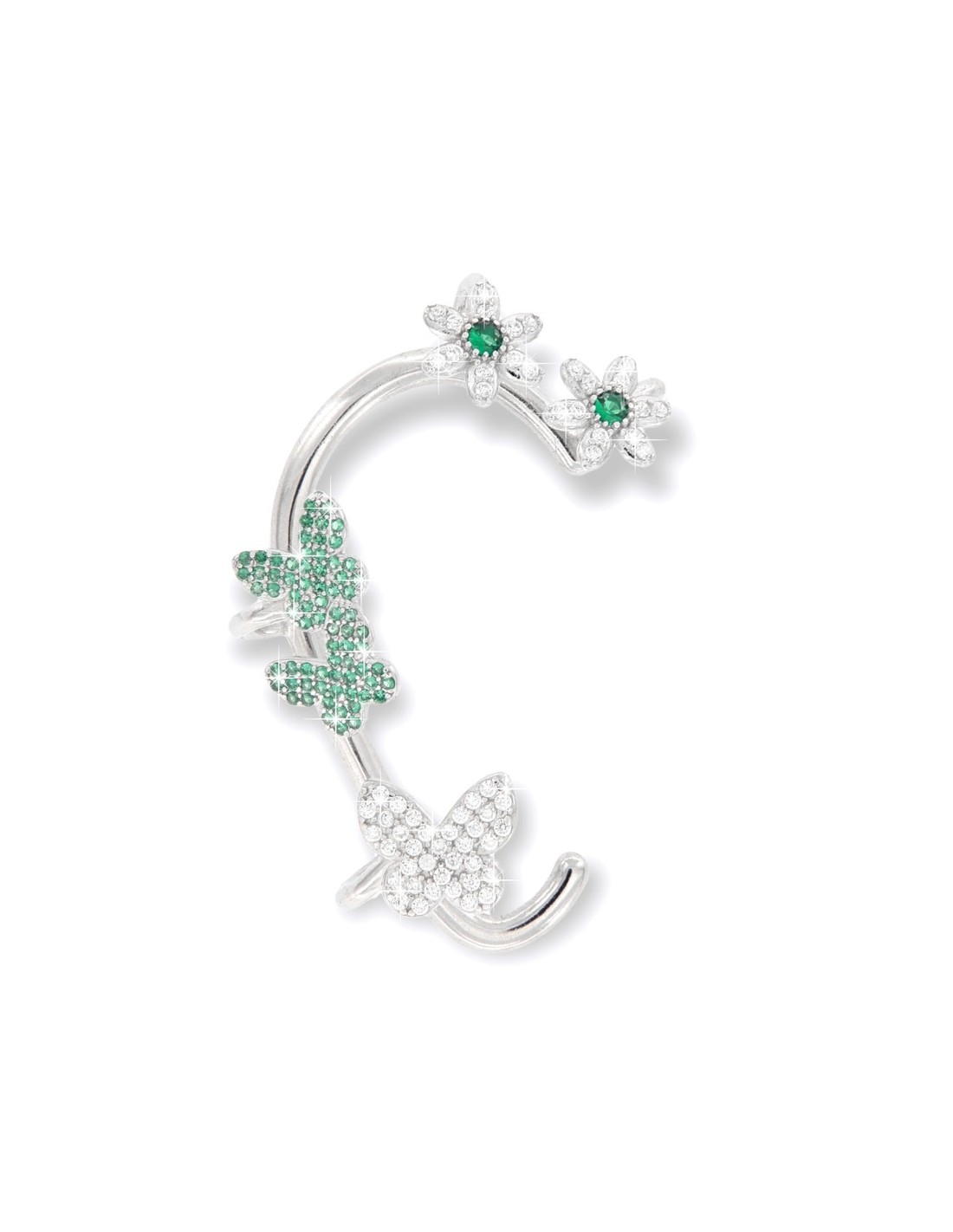 •MATERIALE: l'Ear Cuff sono realizzati interamente in argento 925‰ Rodiato (trattamento brillantante contro l'annerimento), l'Ear Cuff ha su di esso 5 ciondolo a forma di fiori e farfalle, ognuno accompagnato da Zirconia Cubica colore bianco e verde con taglio di alta qualità simile al taglio Brillante del Diamante, la sua particolare forma accompagna quella del padiglione auricolare di chi indossa questo gioiello;